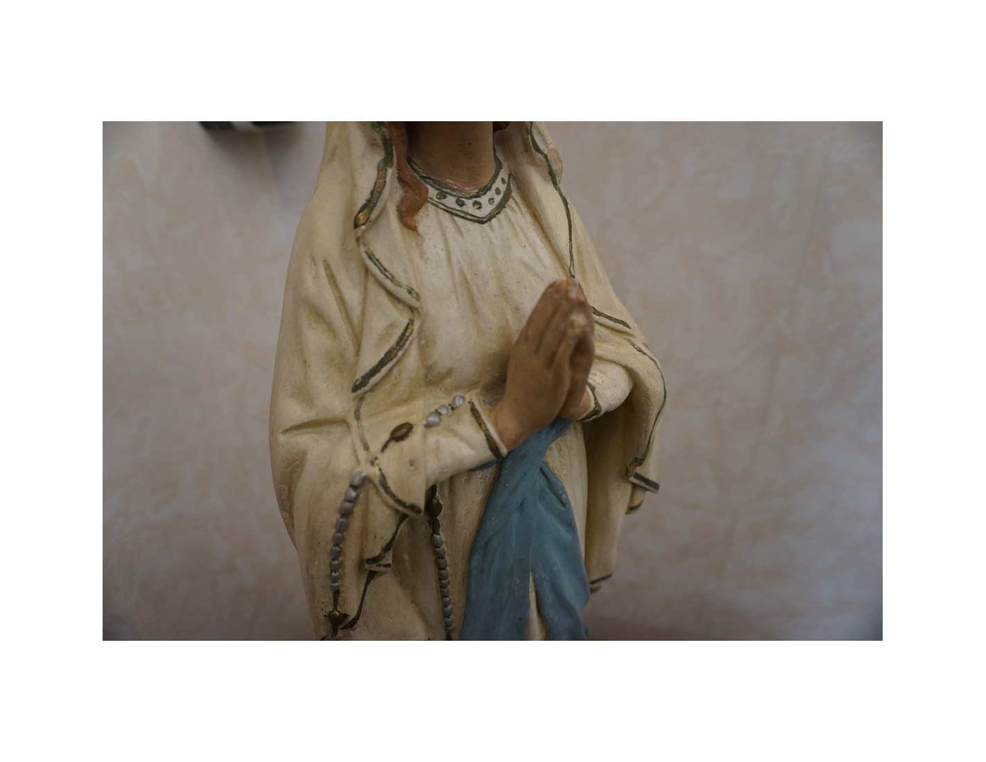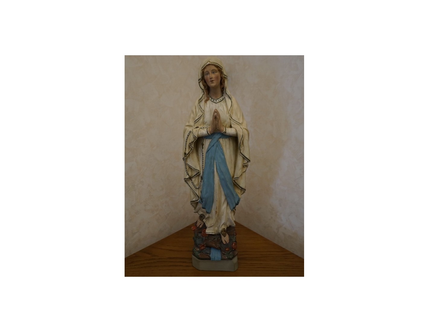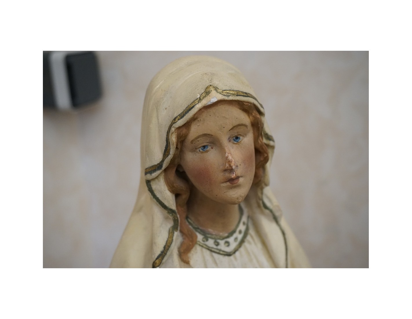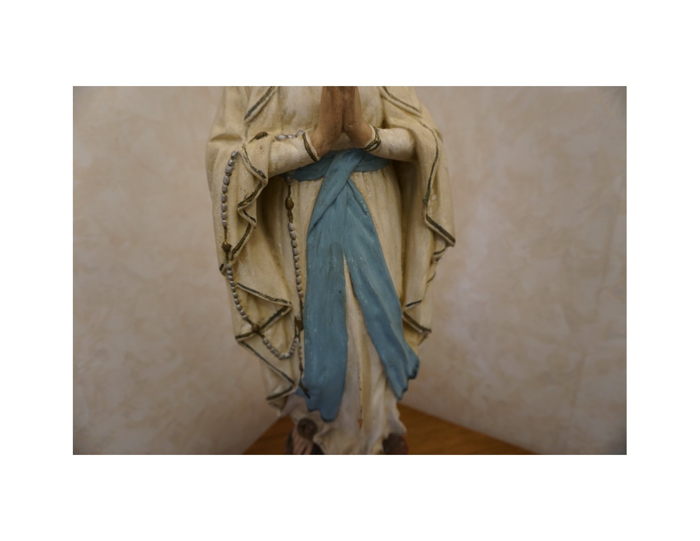 Piękna figurka Matki Boskiej Niepokalanej, wykonana z dbałością o detale, doskonała jako element dekoracyjny lub religijny w domu, kaplicy czy innym miejscu kultu.