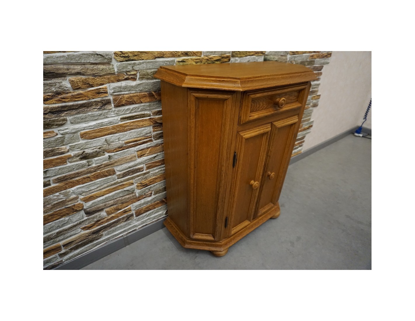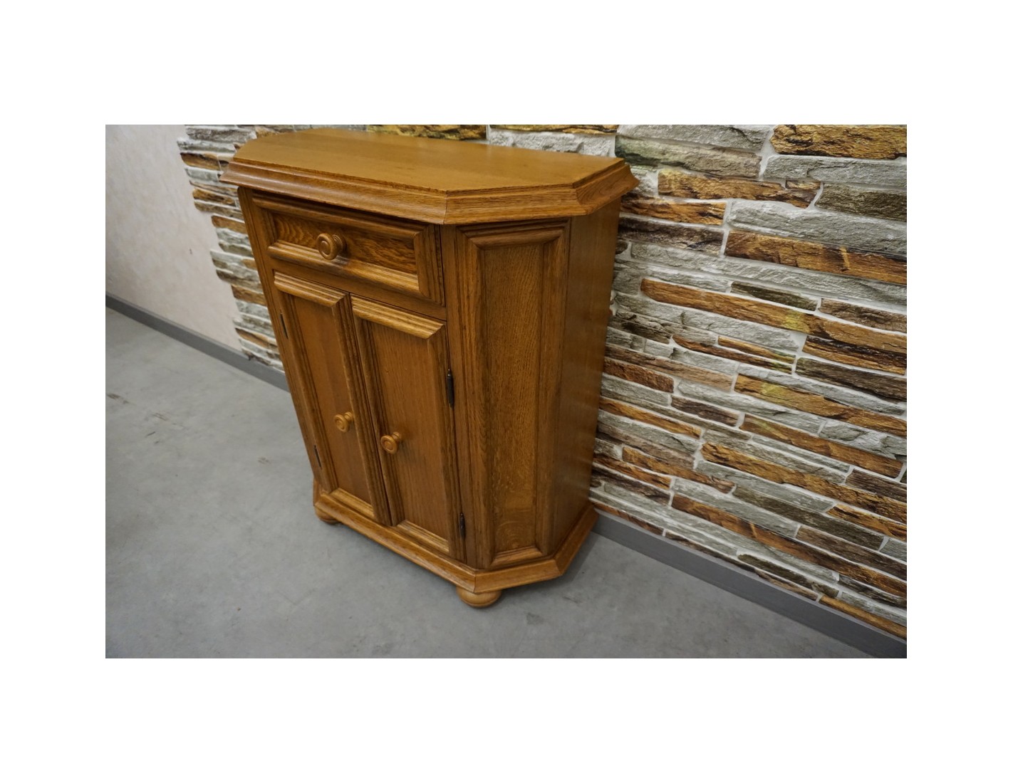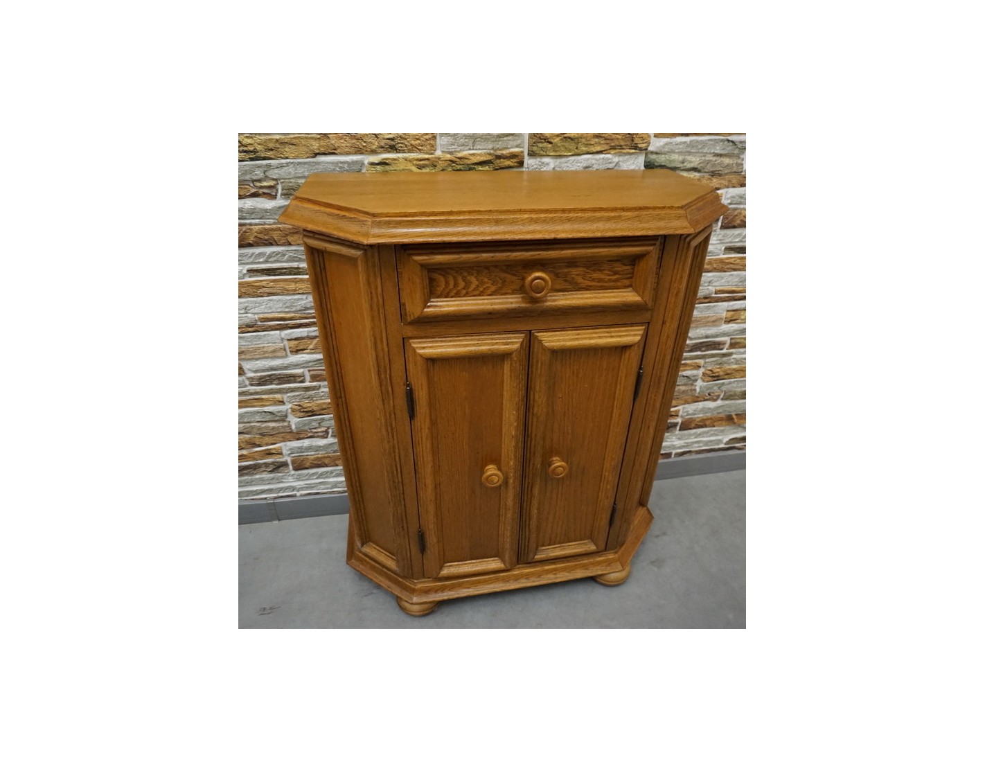 Kompaktowa komódka dębowa z eleganckim wykończeniem. Posiada 2 drzwi oraz jedną szufladę, co czyni ją praktycznym meblem do przechowywania drobnych przedmiotów. Idealna do mniejszych przestrzeni, takich jak przedpokój, sypialnia czy salon.