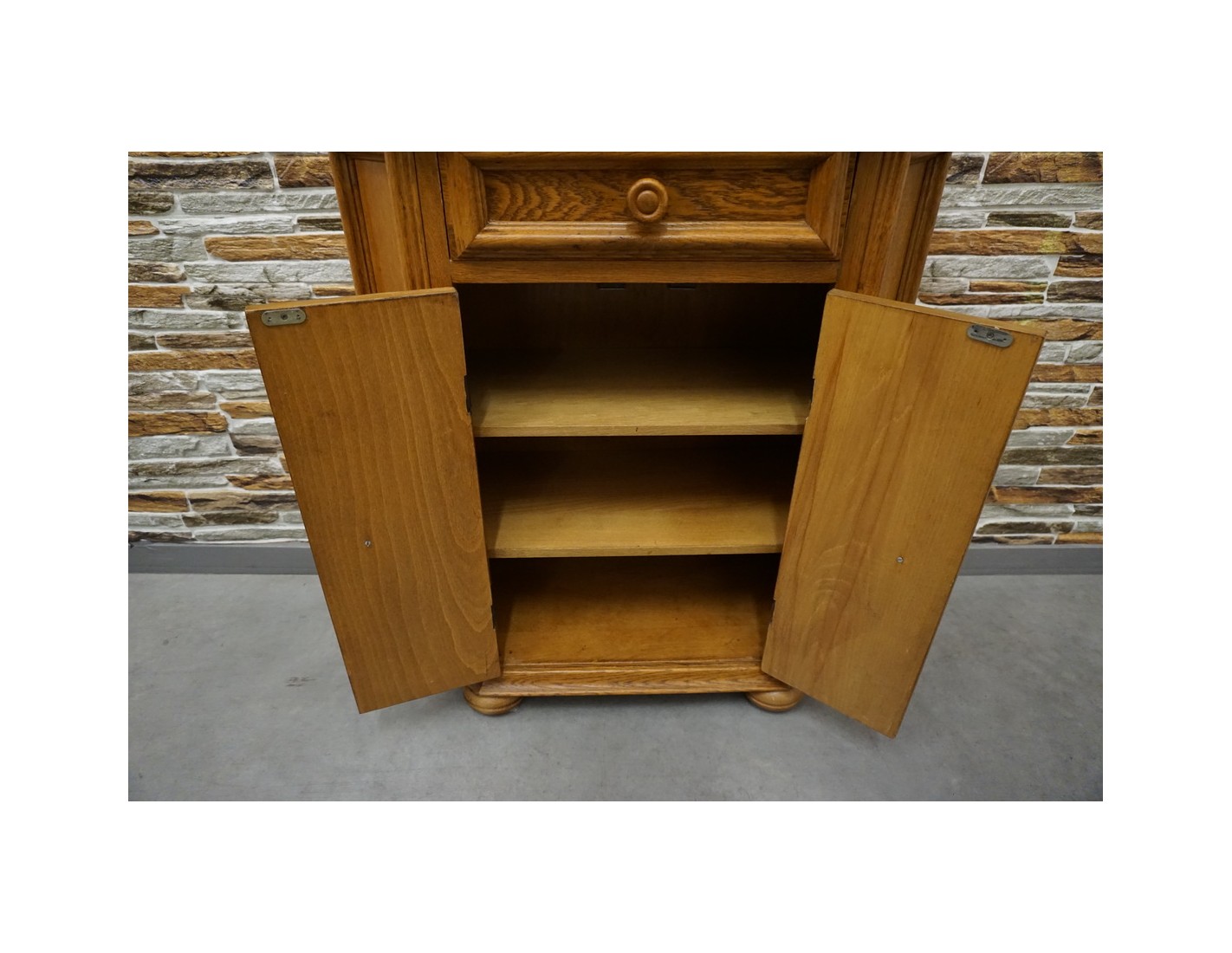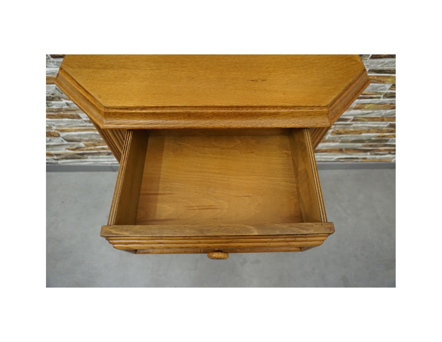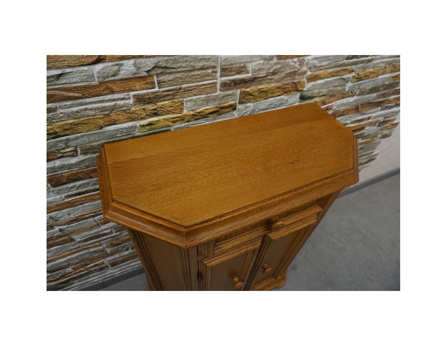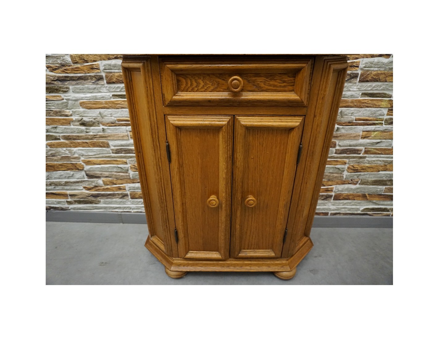 Kompaktowa komódka dębowa z eleganckim wykończeniem. Posiada 2 drzwi oraz jedną szufladę, co czyni ją praktycznym meblem do przechowywania drobnych przedmiotów. Idealna do mniejszych przestrzeni, takich jak przedpokój, sypialnia czy salon.