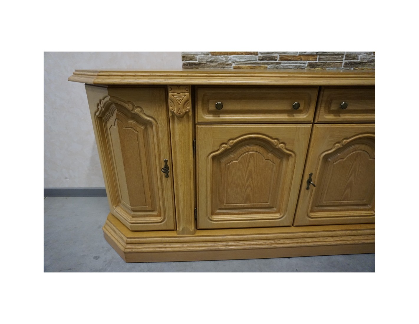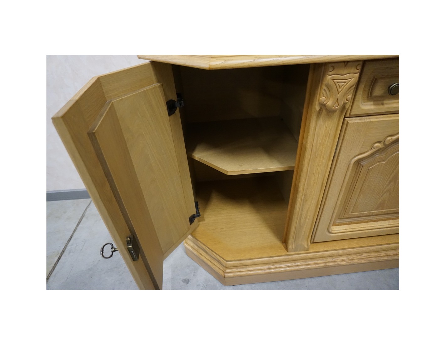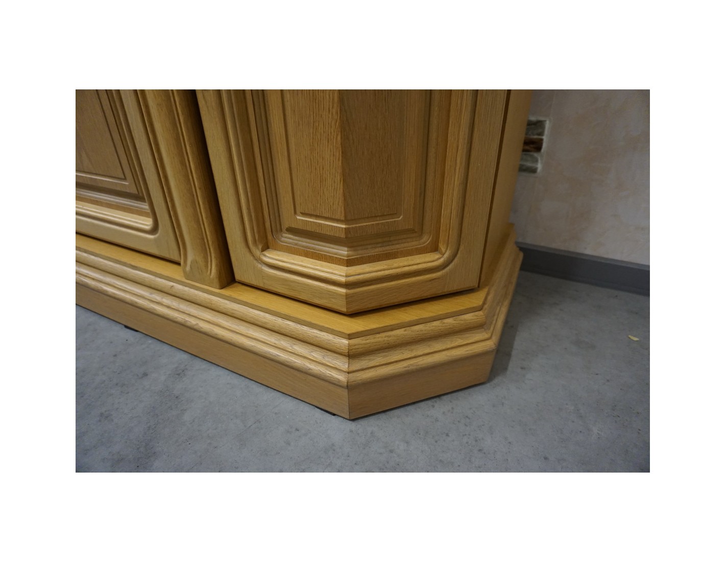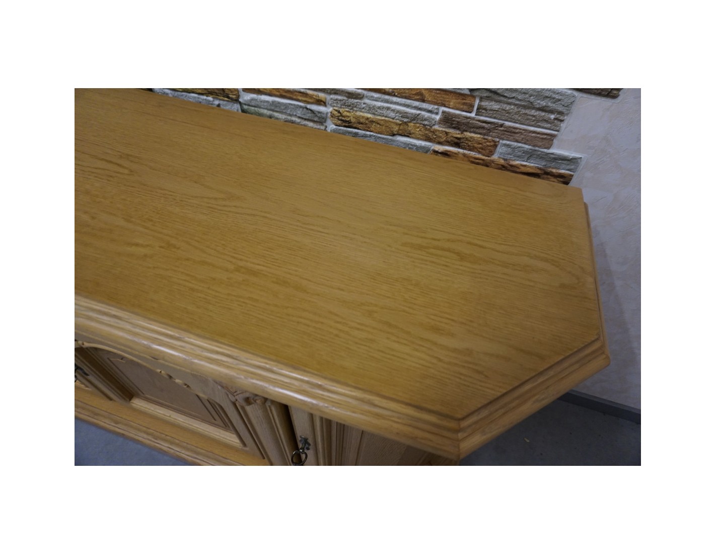Przestronna komoda z jasnego dębu, wyposażona w pięć drzwi i trzy praktyczne szuflady. Zapewnia dużą ilość miejsca do przechowywania, łącząc funkcjonalność z eleganckim wyglądem.