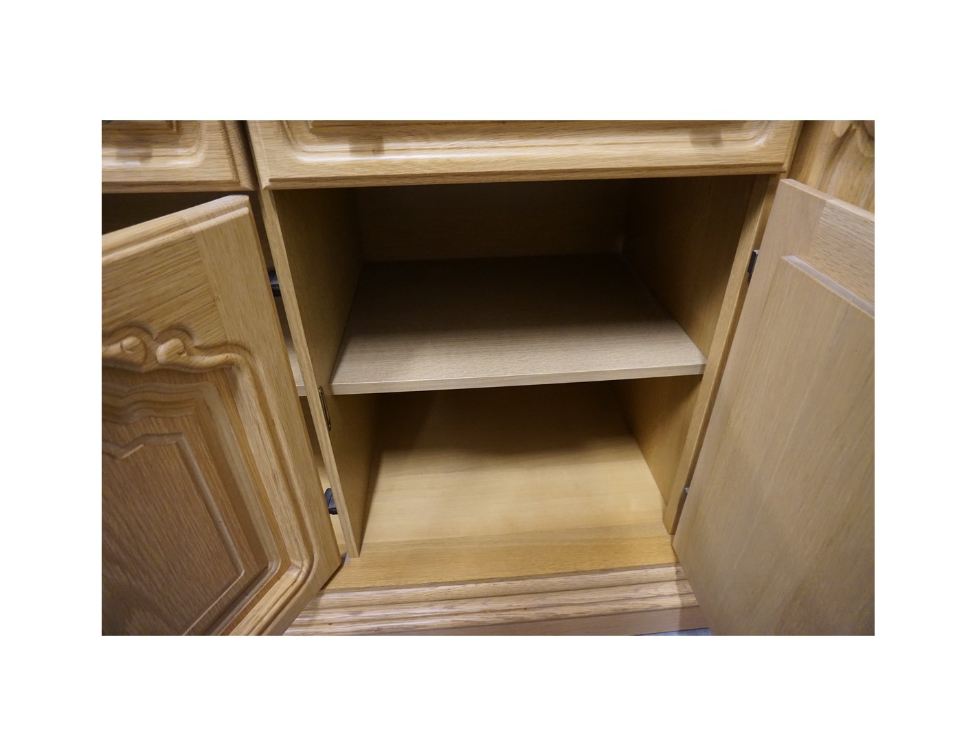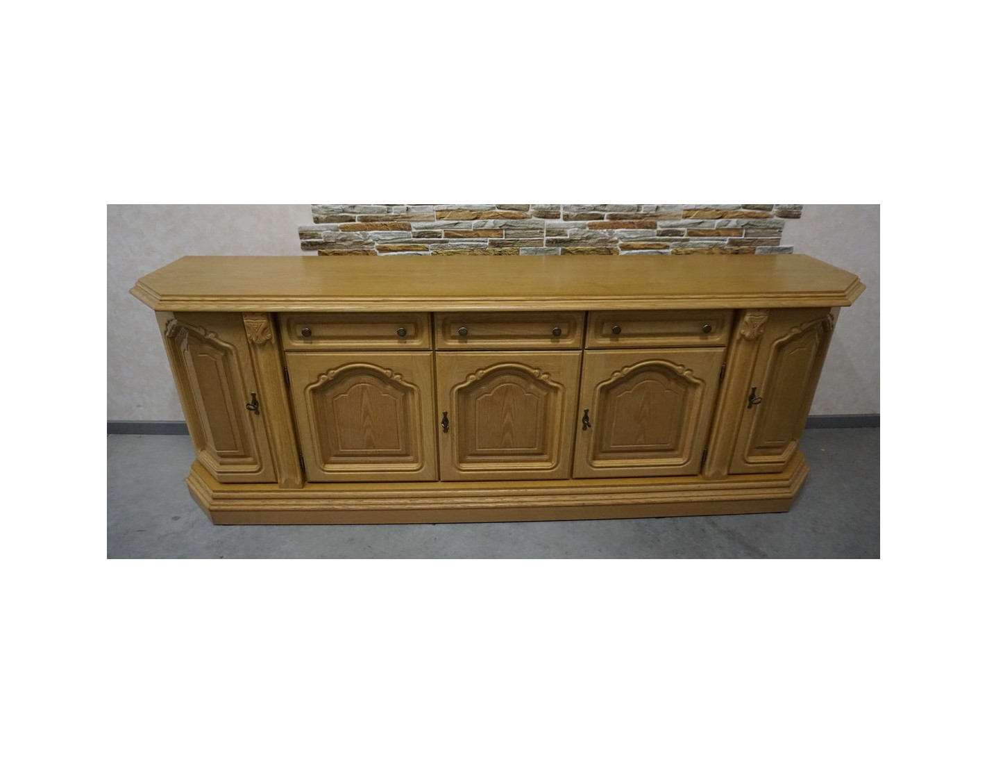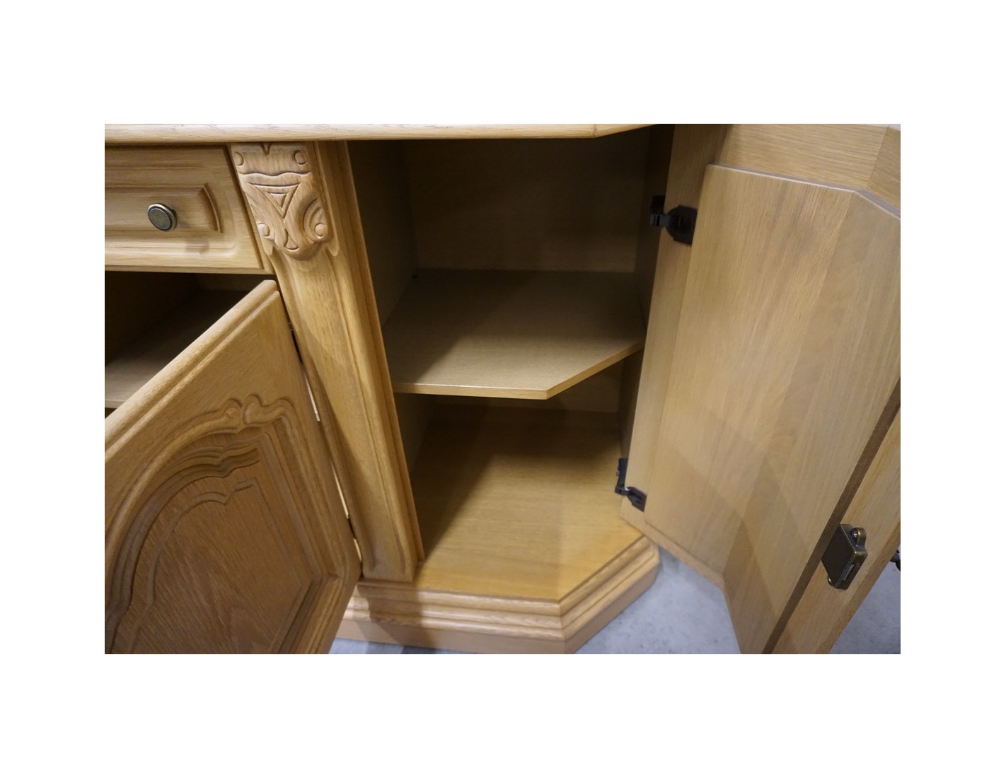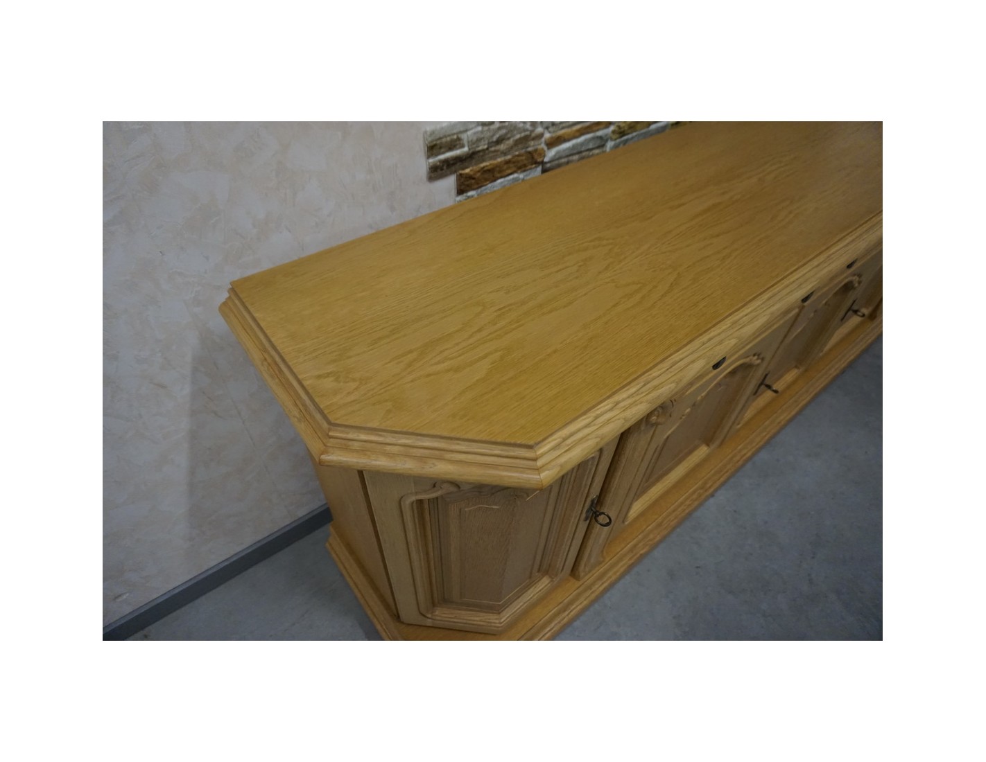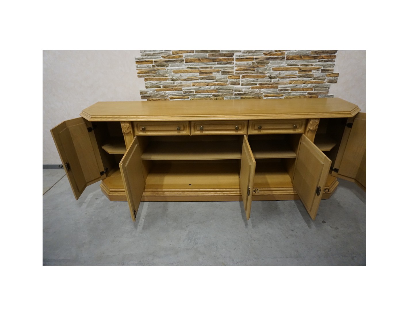 Przestronna komoda z jasnego dębu, wyposażona w pięć drzwi i trzy praktyczne szuflady. Zapewnia dużą ilość miejsca do przechowywania, łącząc funkcjonalność z eleganckim wyglądem.
