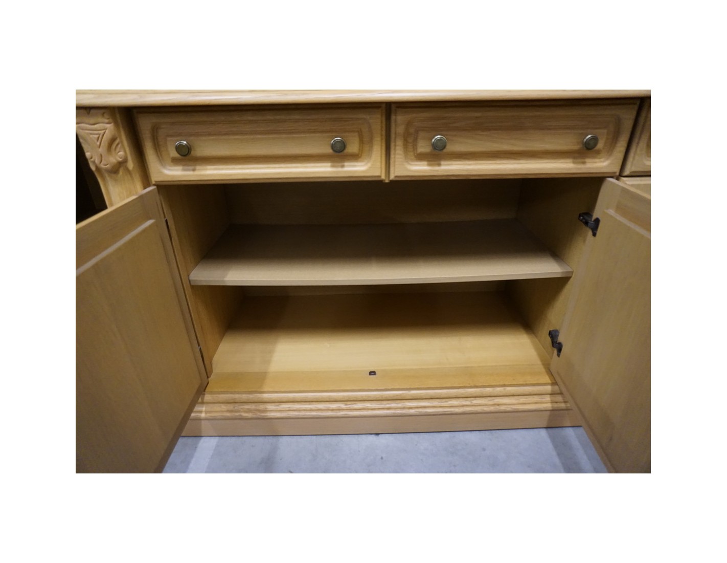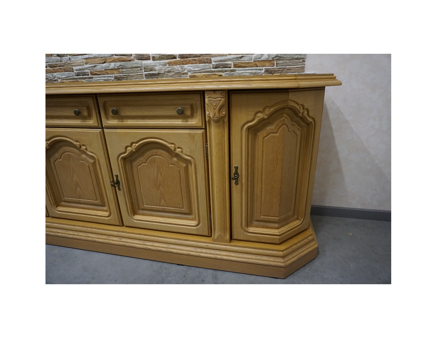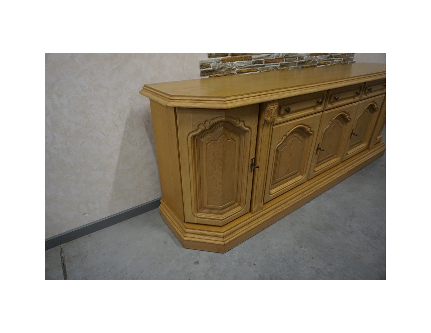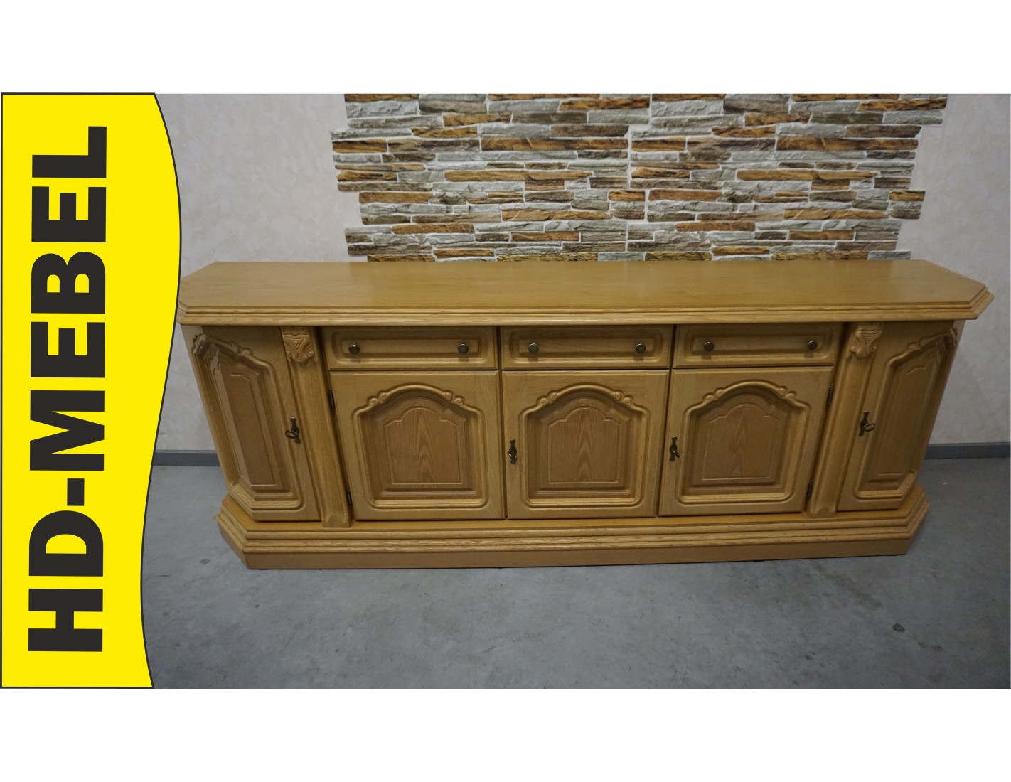 Przestronna komoda z jasnego dębu, wyposażona w pięć drzwi i trzy praktyczne szuflady. Zapewnia dużą ilość miejsca do przechowywania, łącząc funkcjonalność z eleganckim wyglądem.