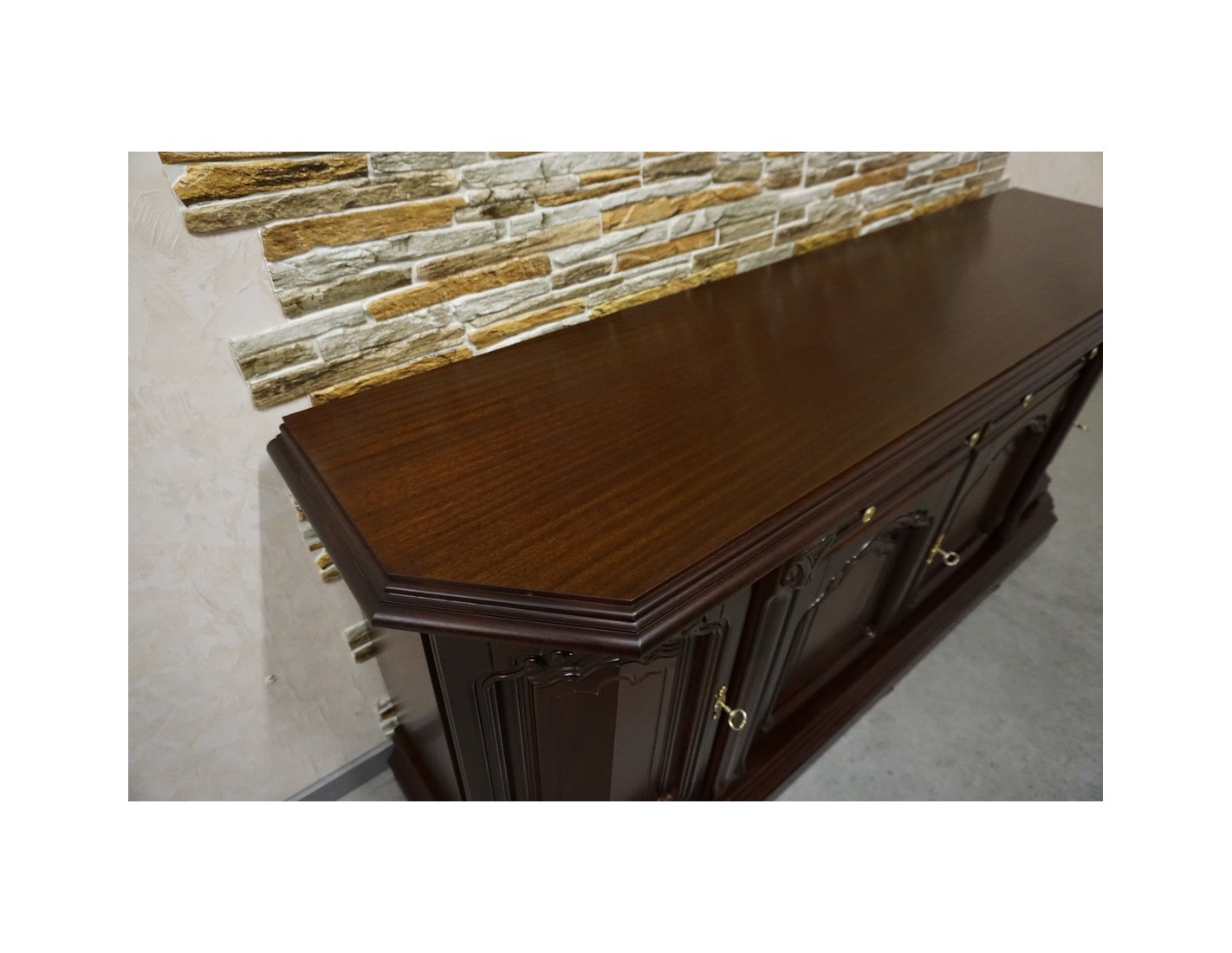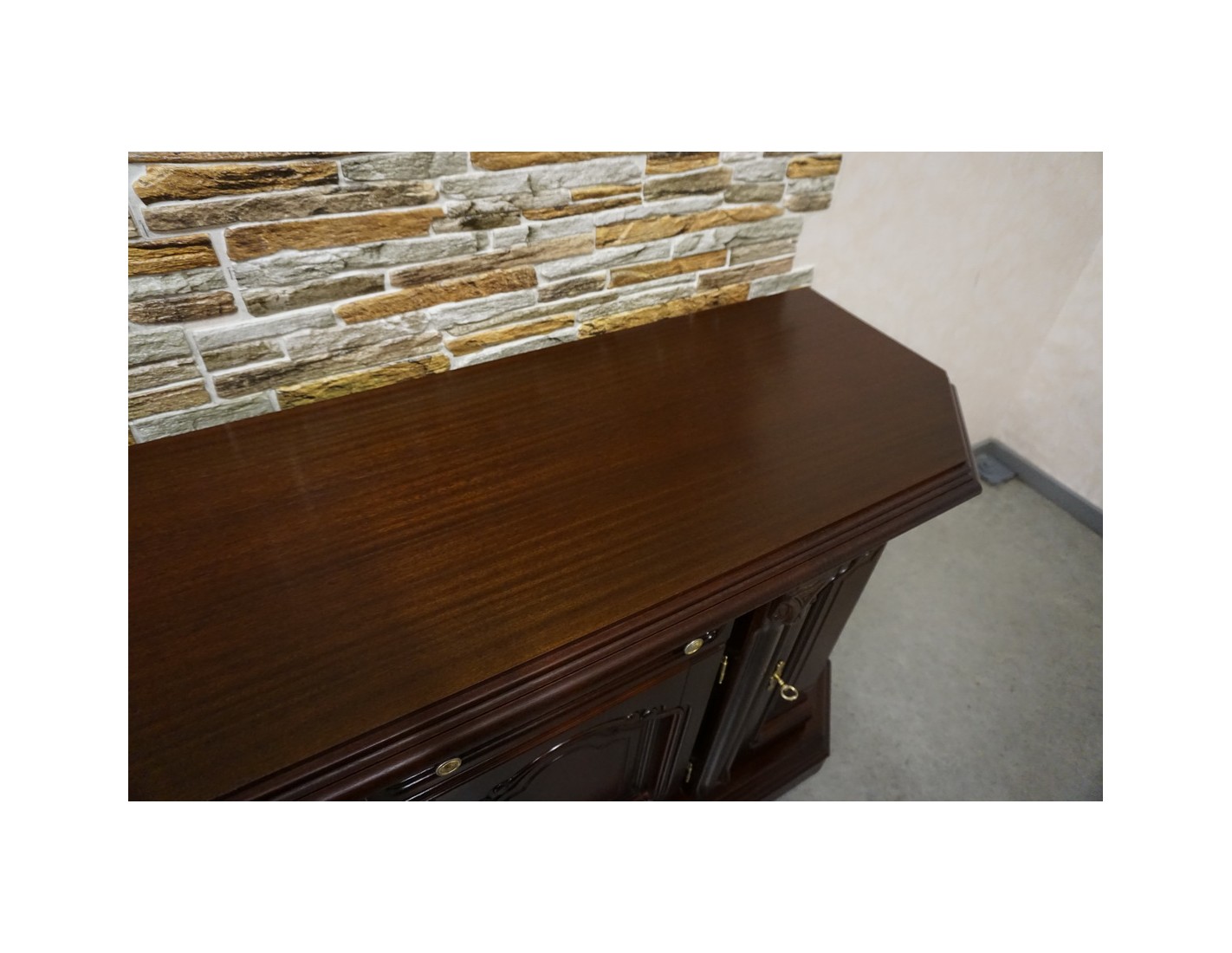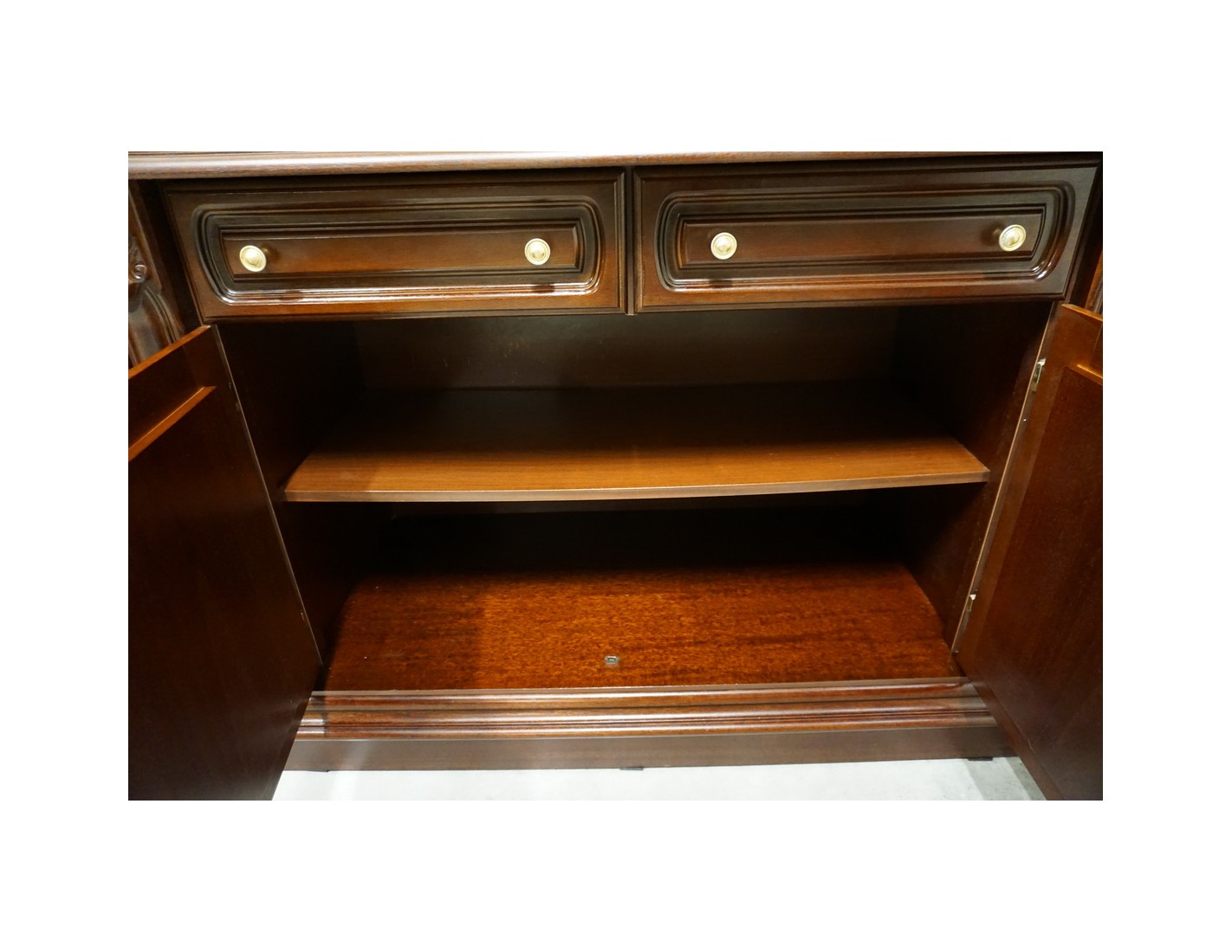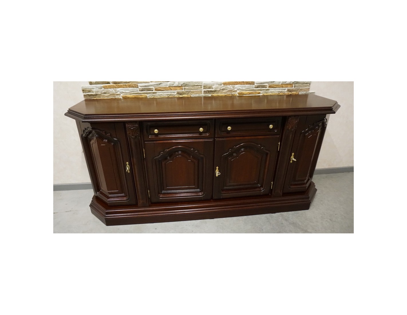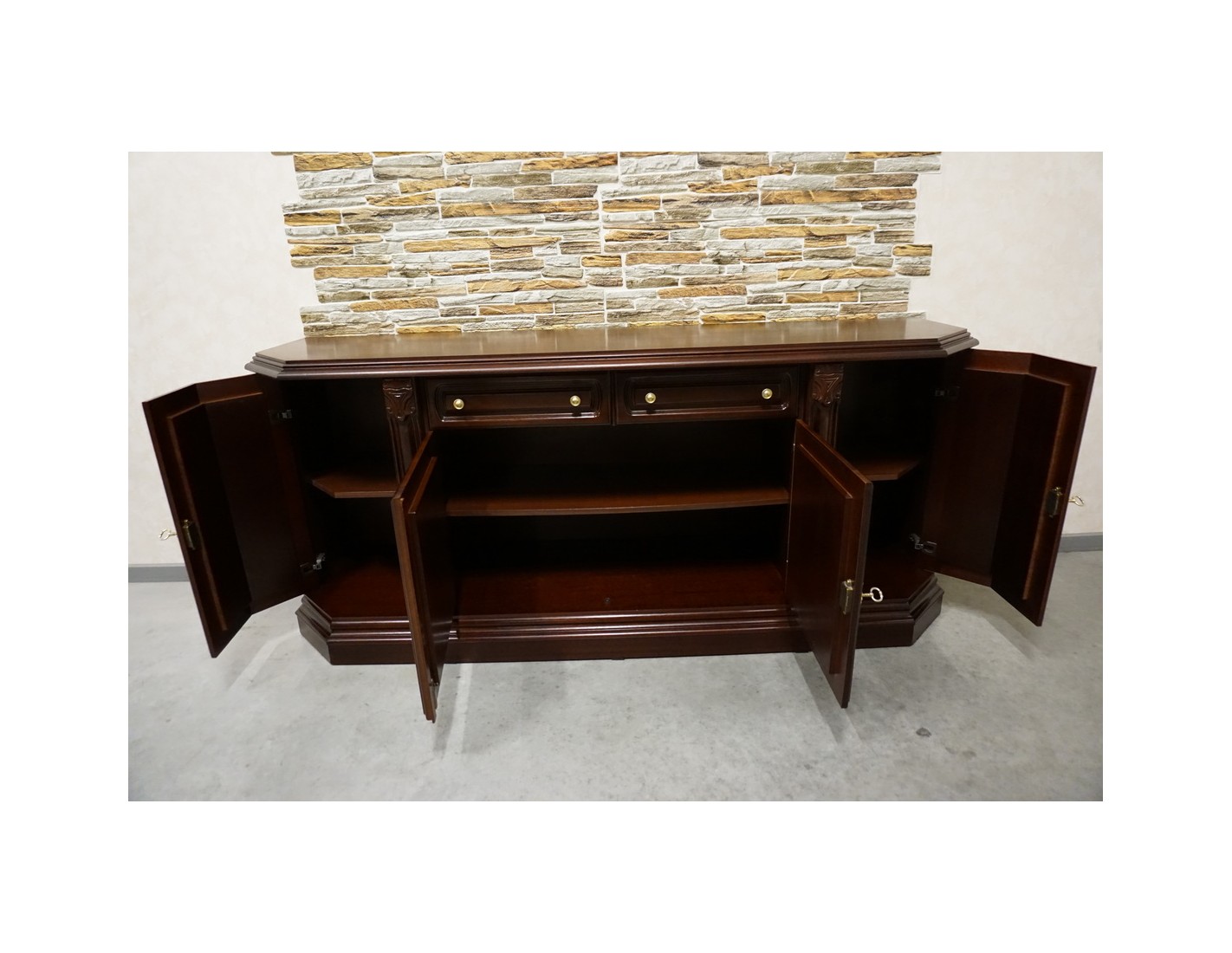 Stylowa komoda wykonana z wysokiej jakości drewna mahoniowego. Dzięki czterem drzwiom i dwóm praktycznym szufladom zapewnia przestronne miejsce do przechowywania. Doskonale sprawdzi się w eleganckich salonach, jadalniach lub gabinetach.