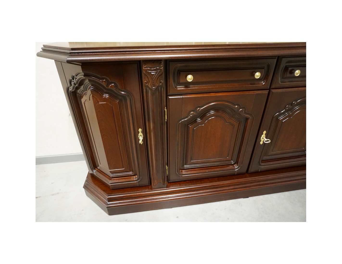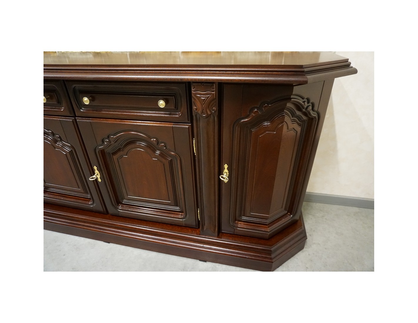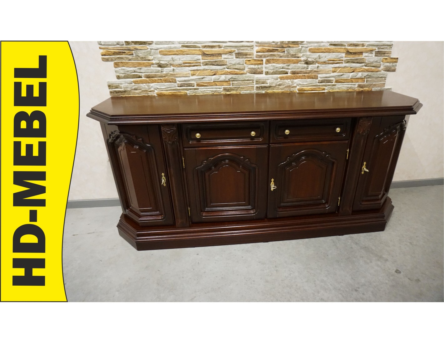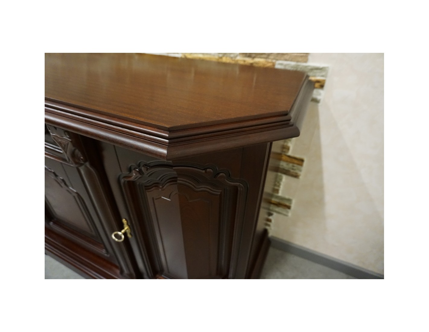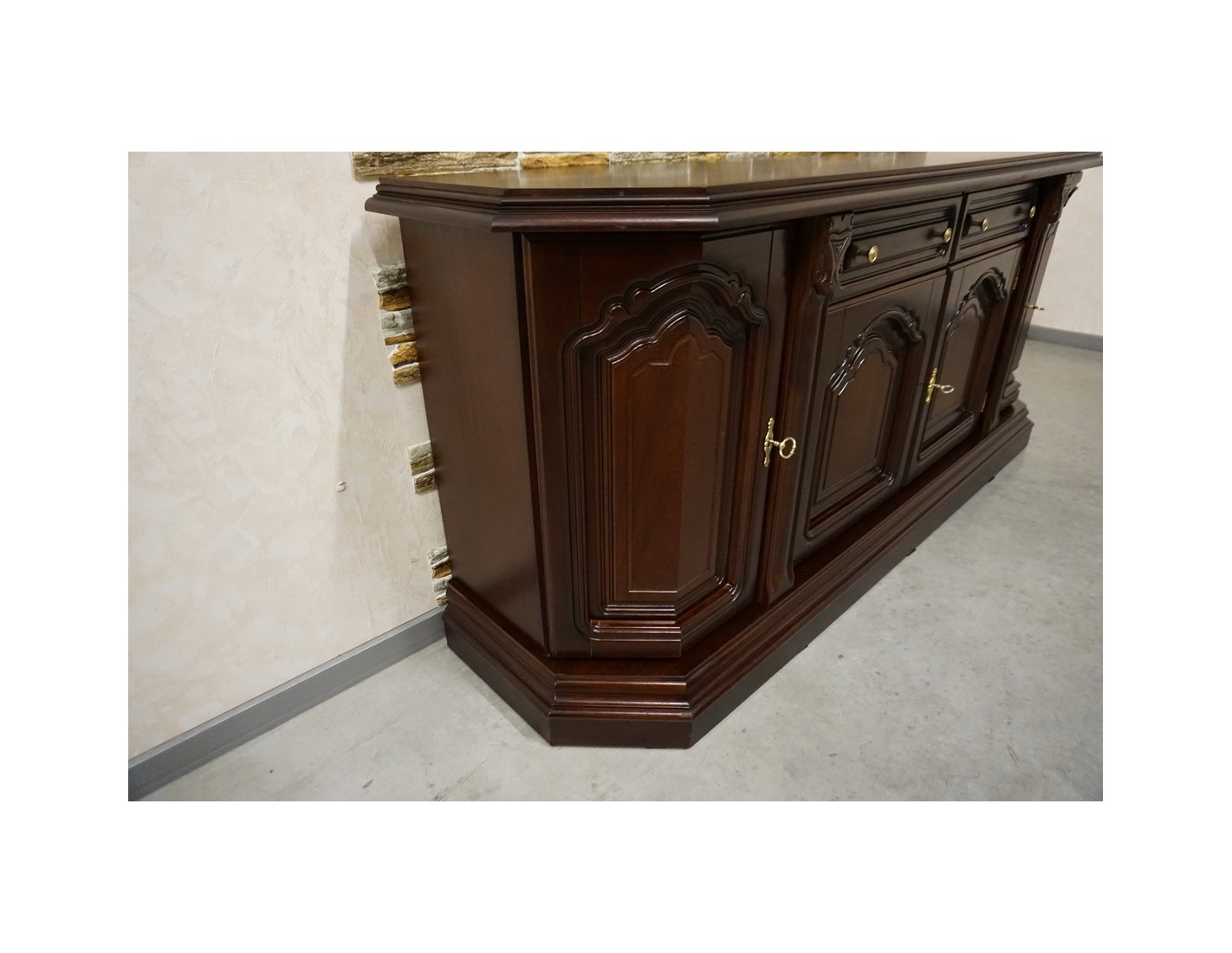 Stylowa komoda wykonana z wysokiej jakości drewna mahoniowego. Dzięki czterem drzwiom i dwóm praktycznym szufladom zapewnia przestronne miejsce do przechowywania. Doskonale sprawdzi się w eleganckich salonach, jadalniach lub gabinetach.