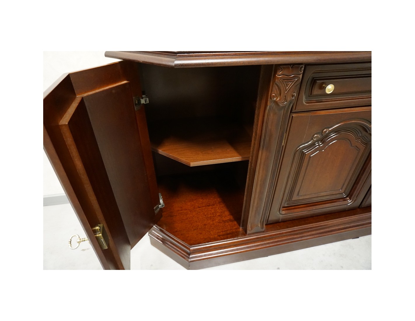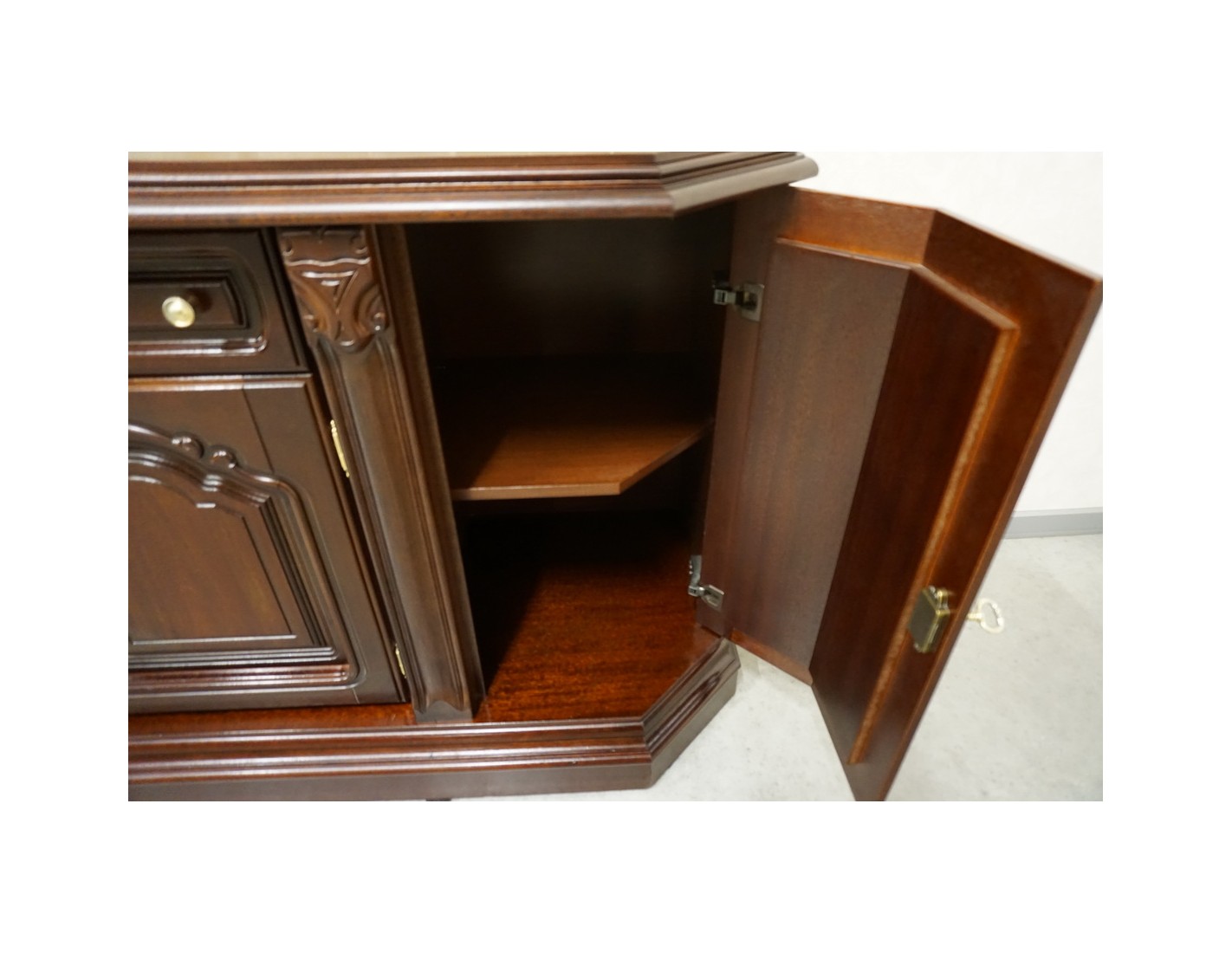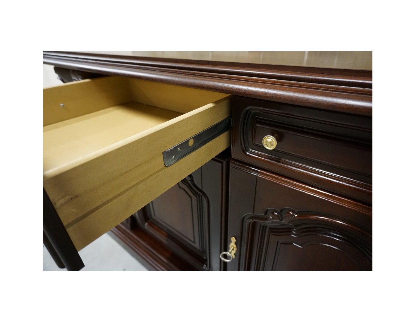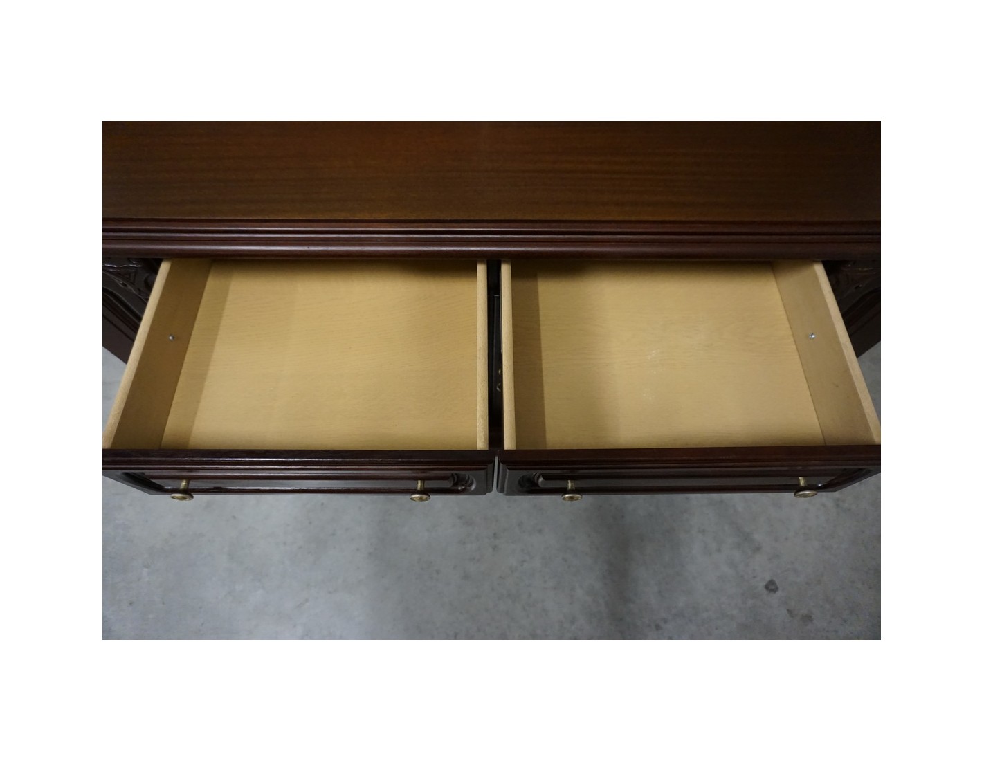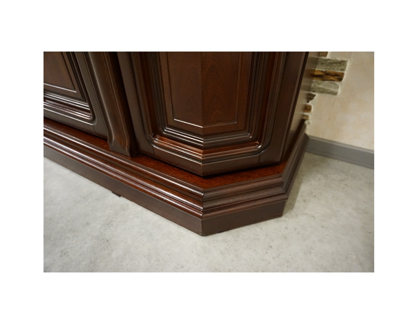 Stylowa komoda wykonana z wysokiej jakości drewna mahoniowego. Dzięki czterem drzwiom i dwóm praktycznym szufladom zapewnia przestronne miejsce do przechowywania. Doskonale sprawdzi się w eleganckich salonach, jadalniach lub gabinetach.