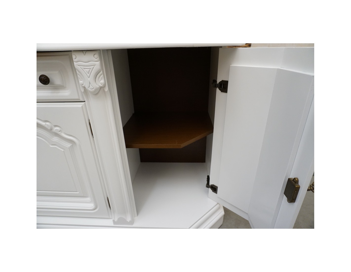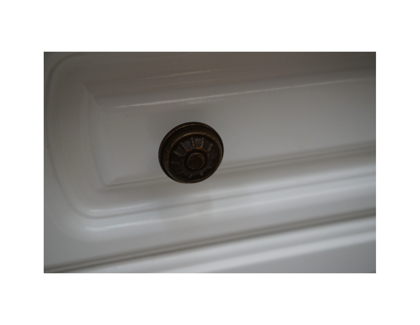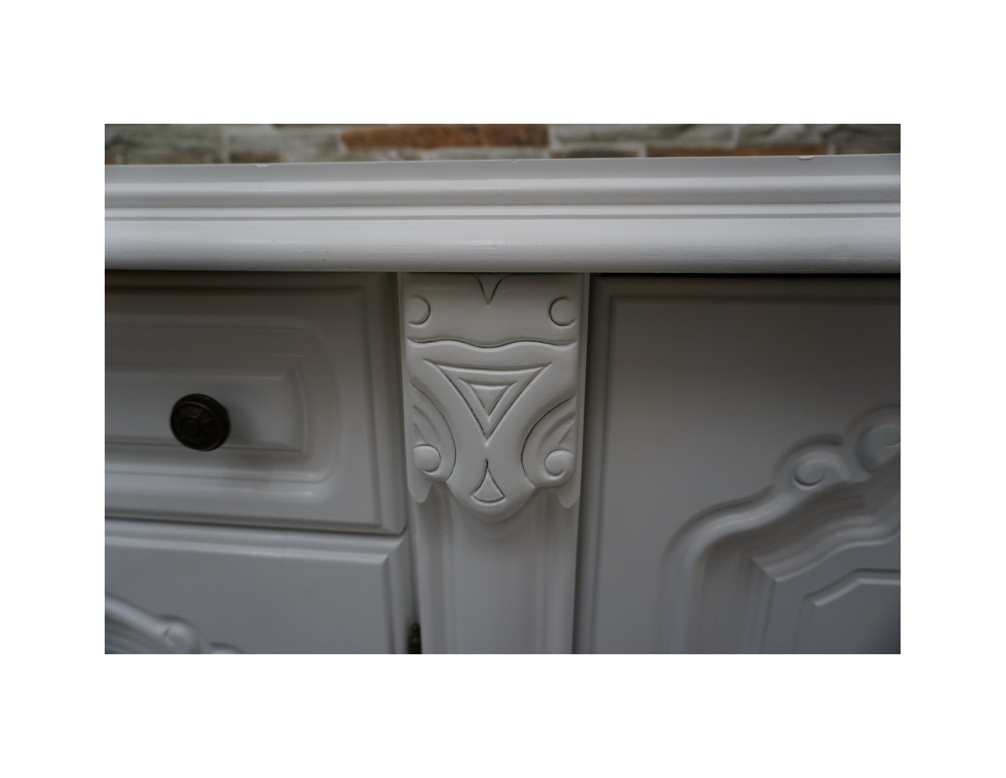 Stylowa komoda dębowa w kolorze białym, świeżo po profesjonalnej renowacji, w idealnym stanie – bez śladów użytkowania. Mebel charakteryzuje się klasycznym designem i funkcjonalnym układem przechowywania, łącząc estetykę z praktycznością.