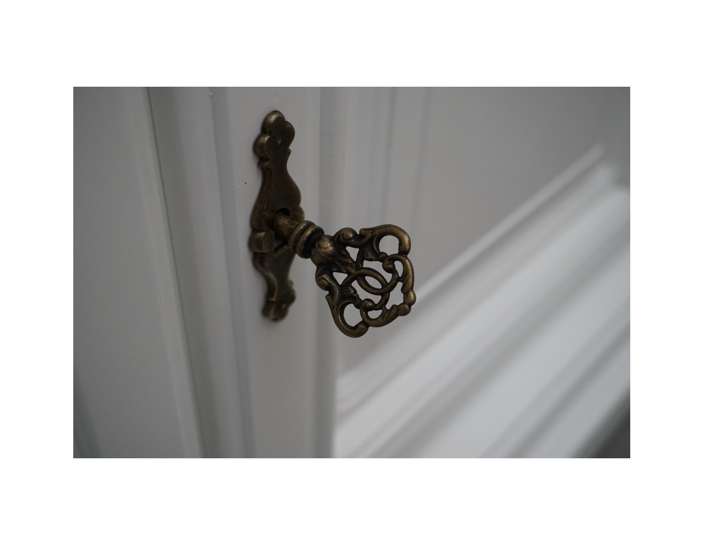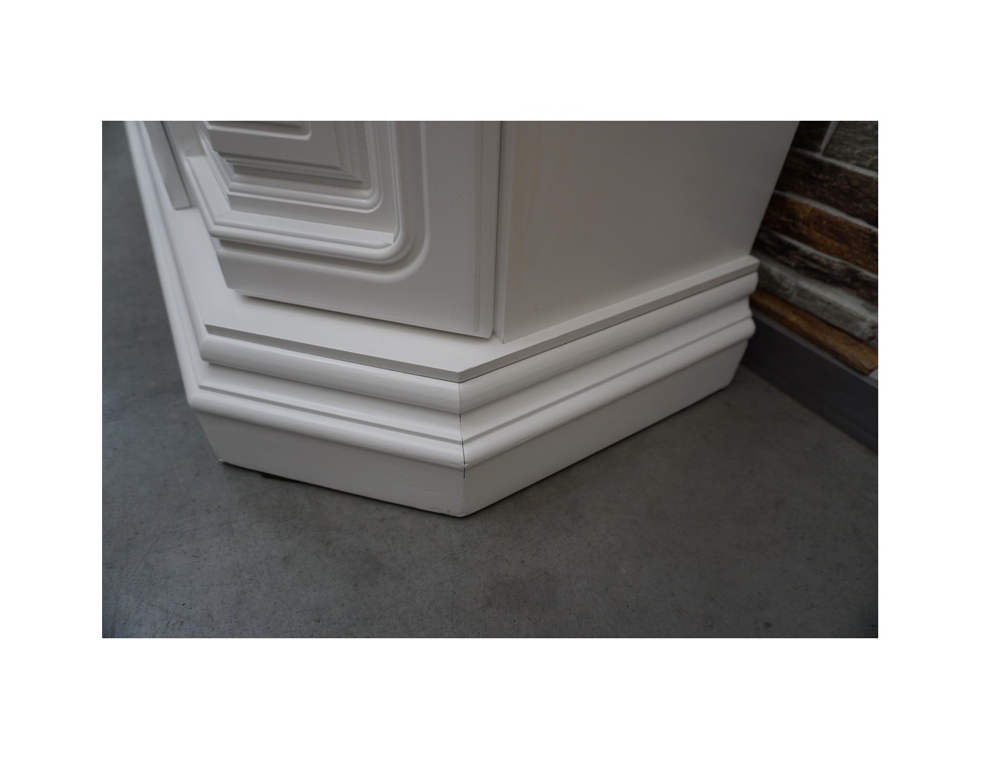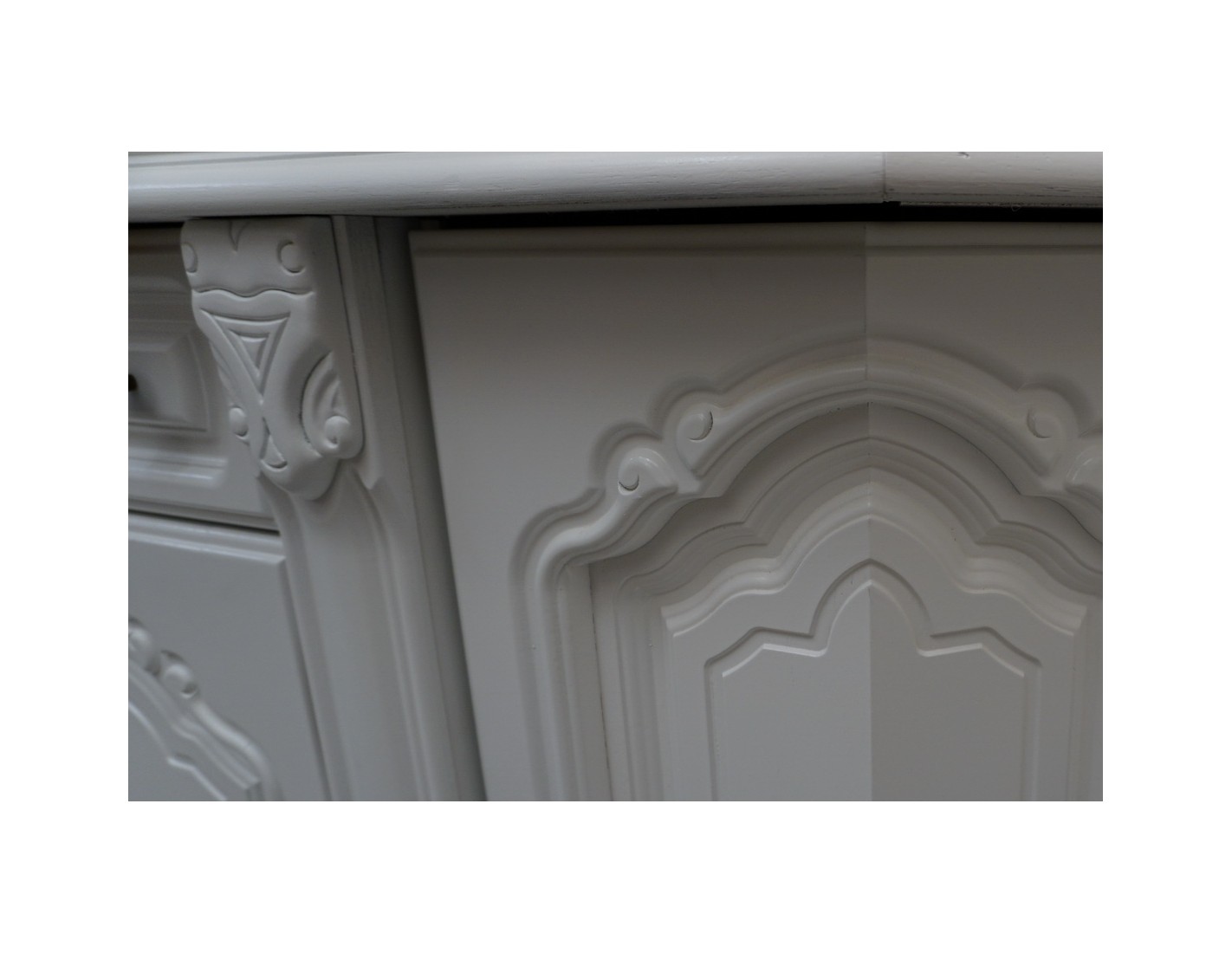 Stylowa komoda dębowa w kolorze białym, świeżo po profesjonalnej renowacji, w idealnym stanie – bez śladów użytkowania. Mebel charakteryzuje się klasycznym designem i funkcjonalnym układem przechowywania, łącząc estetykę z praktycznością.