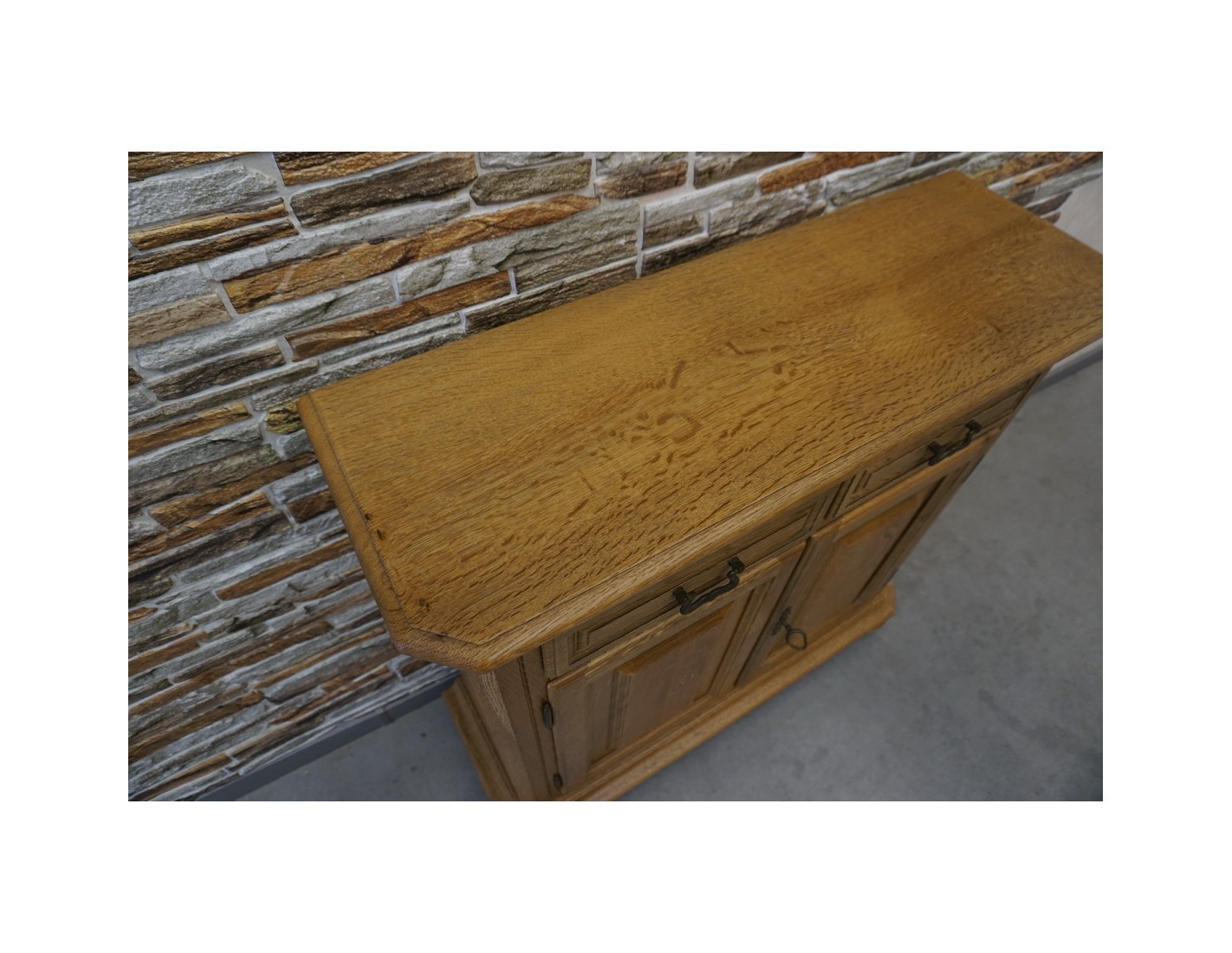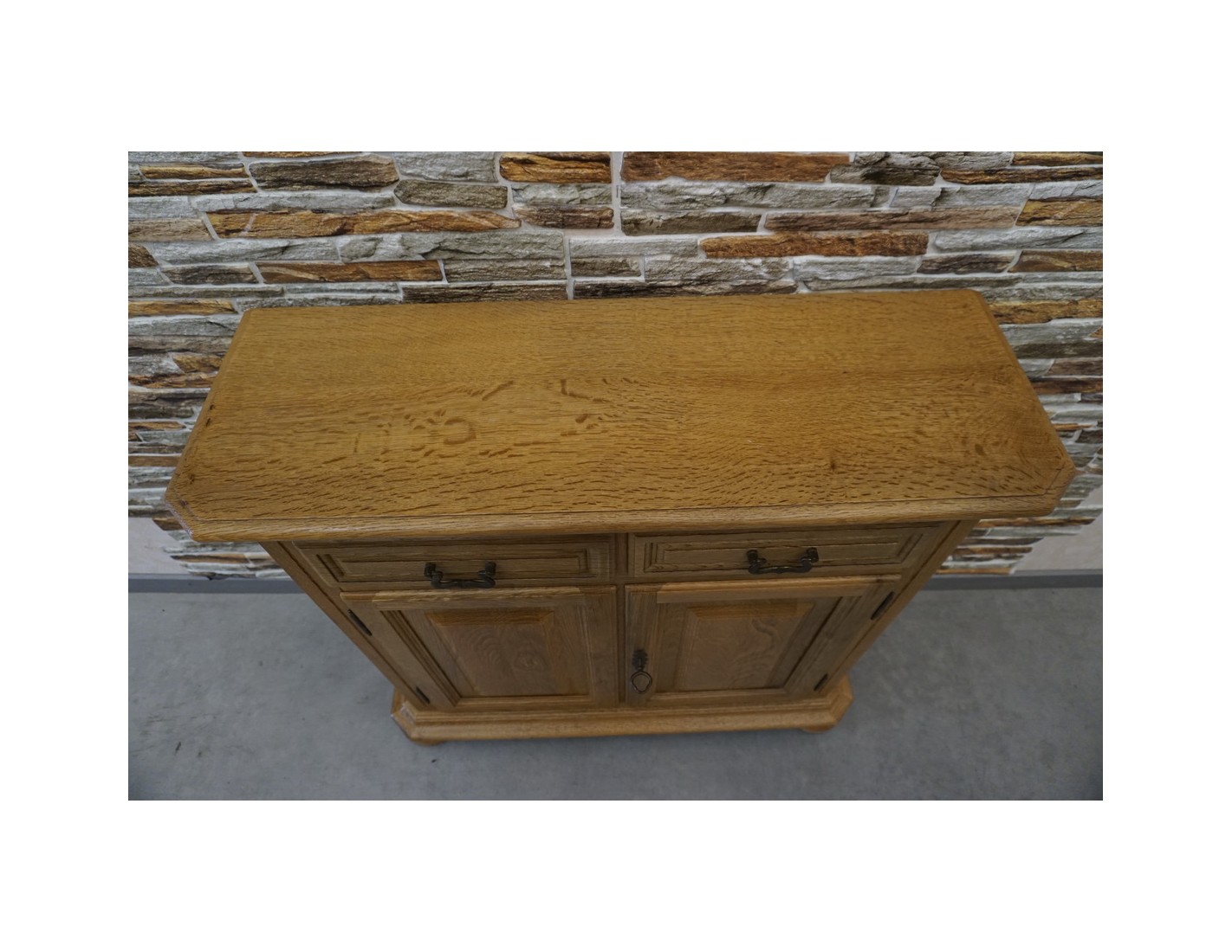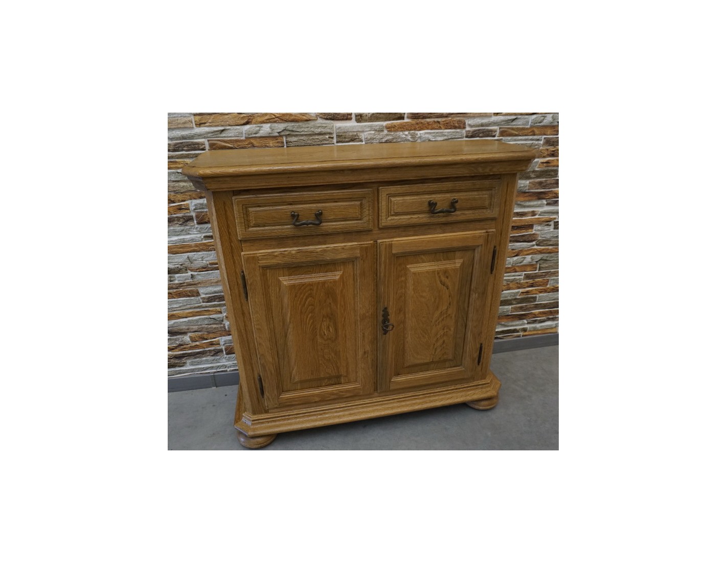 Kompaktowa komódka wykonana z litego dębu, idealna do przechowywania drobiazgów oraz mniejszych akcesoriów. Posiada dwie praktyczne szuflady i dwudrzwiową szafkę, które zapewniają wygodę użytkowania oraz estetyczny wygląd.