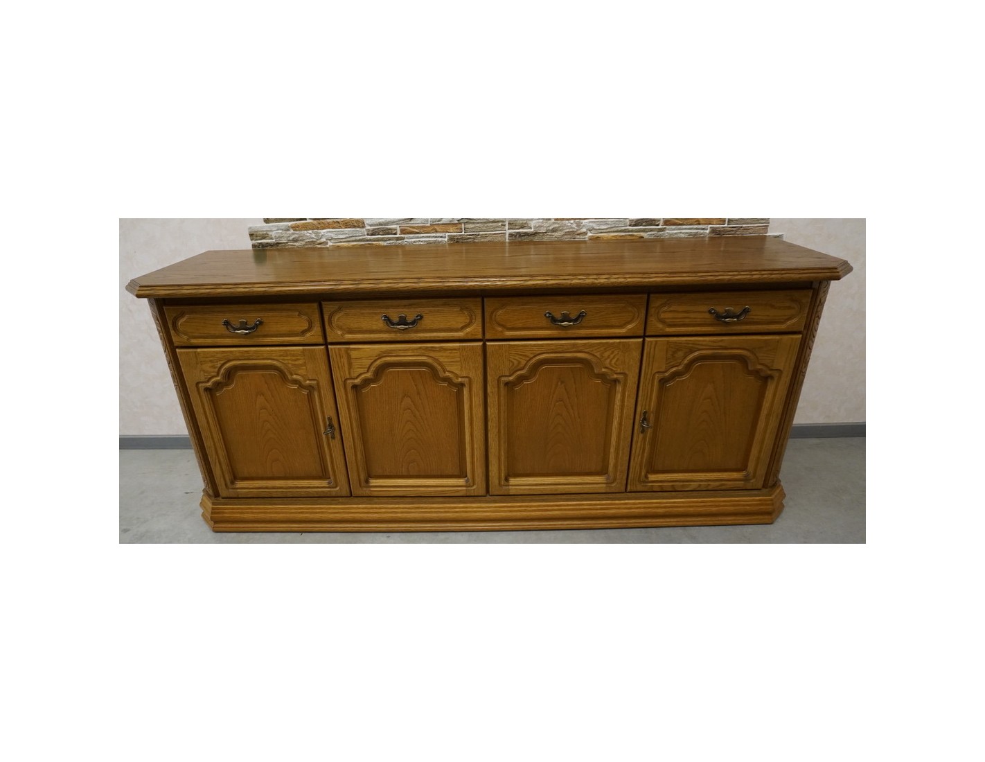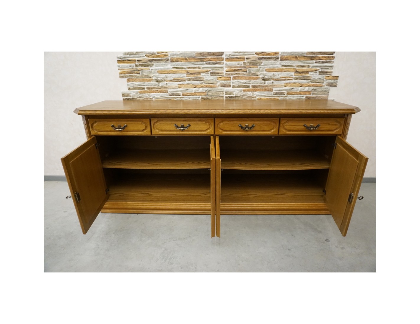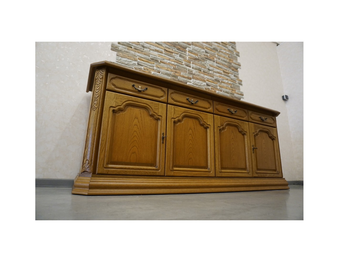 Przestronna i elegancka komoda dębowa, wyposażona w cztery drzwi oraz cztery funkcjonalne szuflady. Dzięki klasycznemu designowi oraz solidnemu wykonaniu mebel idealnie sprawdzi się w salonie, jadalni lub sypialni, zapewniając dużo miejsca do przechowywania.