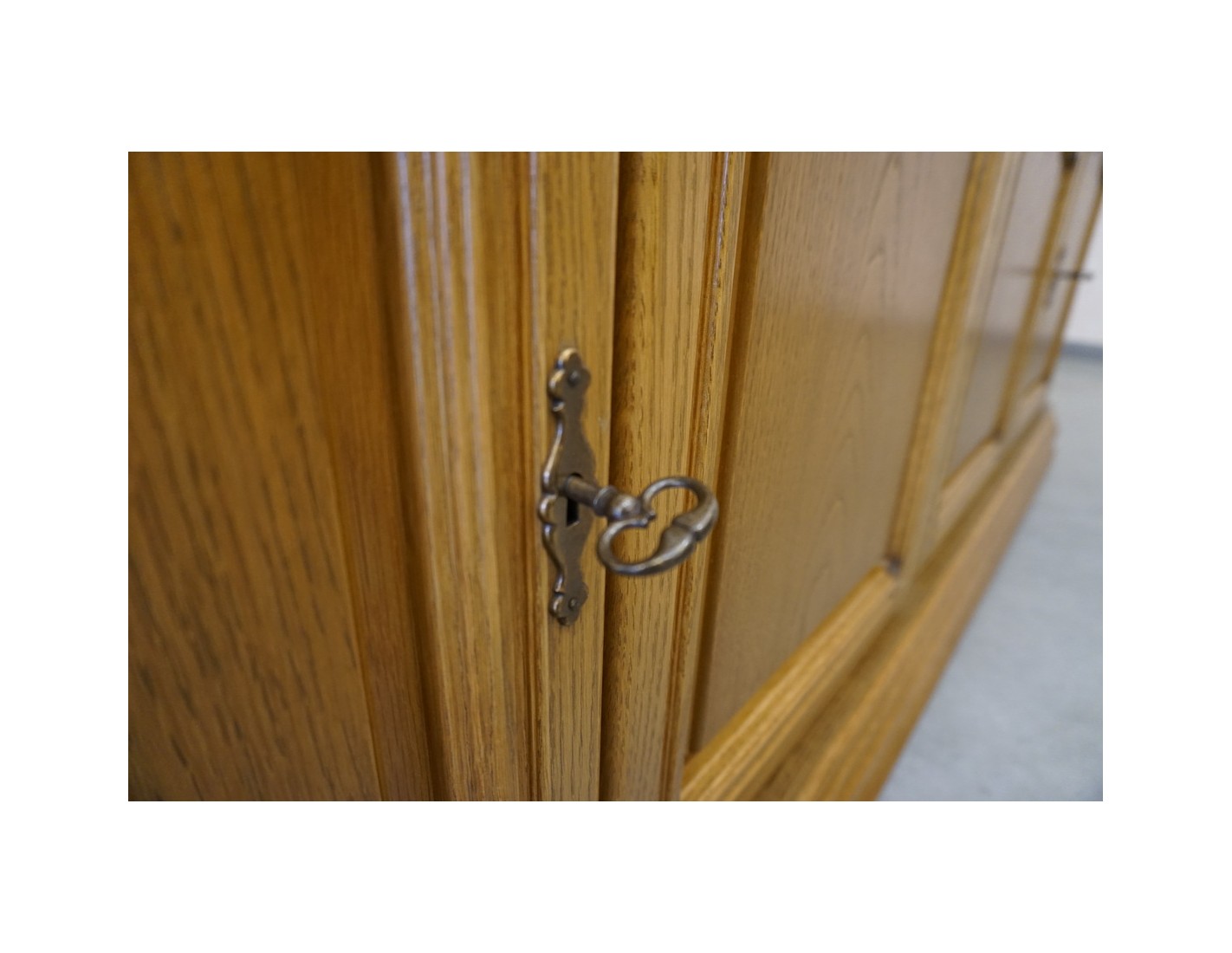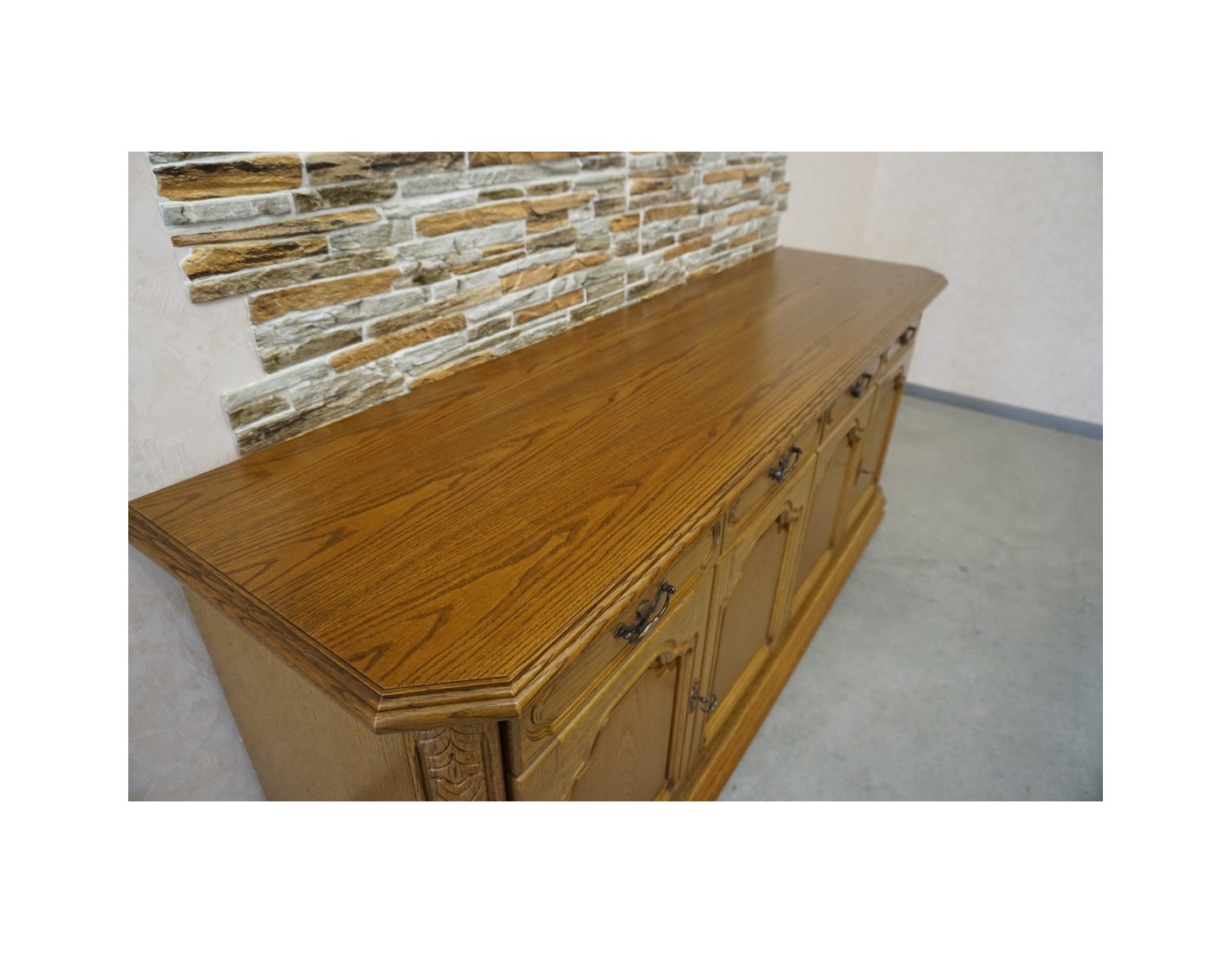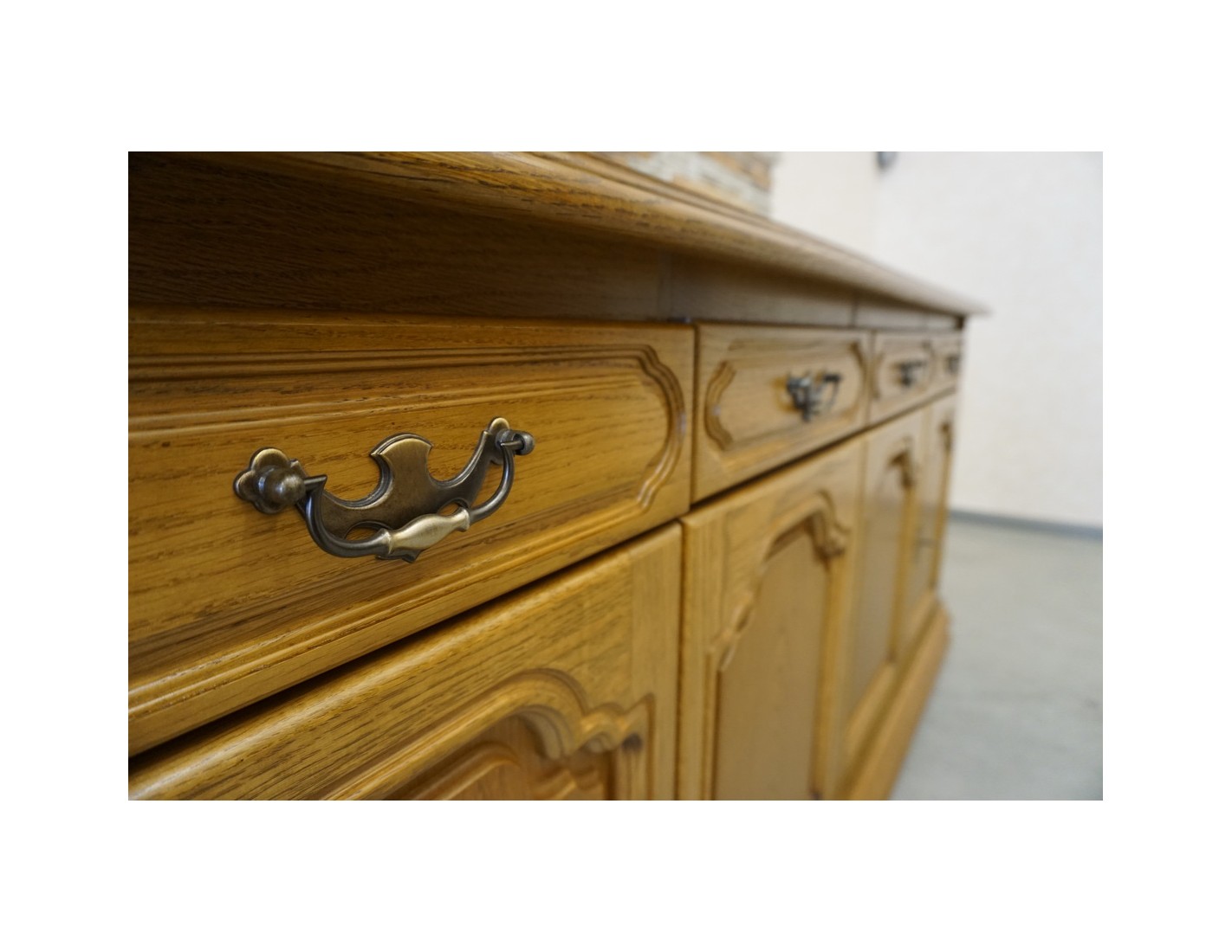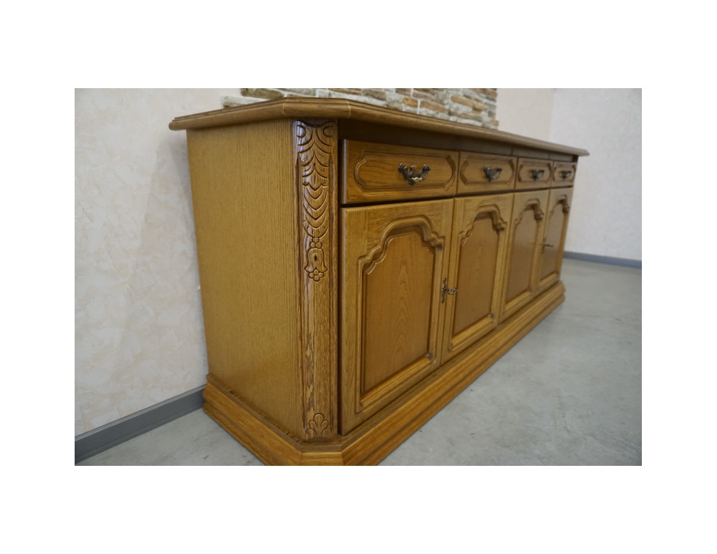 Przestronna i elegancka komoda dębowa, wyposażona w cztery drzwi oraz cztery funkcjonalne szuflady. Dzięki klasycznemu designowi oraz solidnemu wykonaniu mebel idealnie sprawdzi się w salonie, jadalni lub sypialni, zapewniając dużo miejsca do przechowywania.