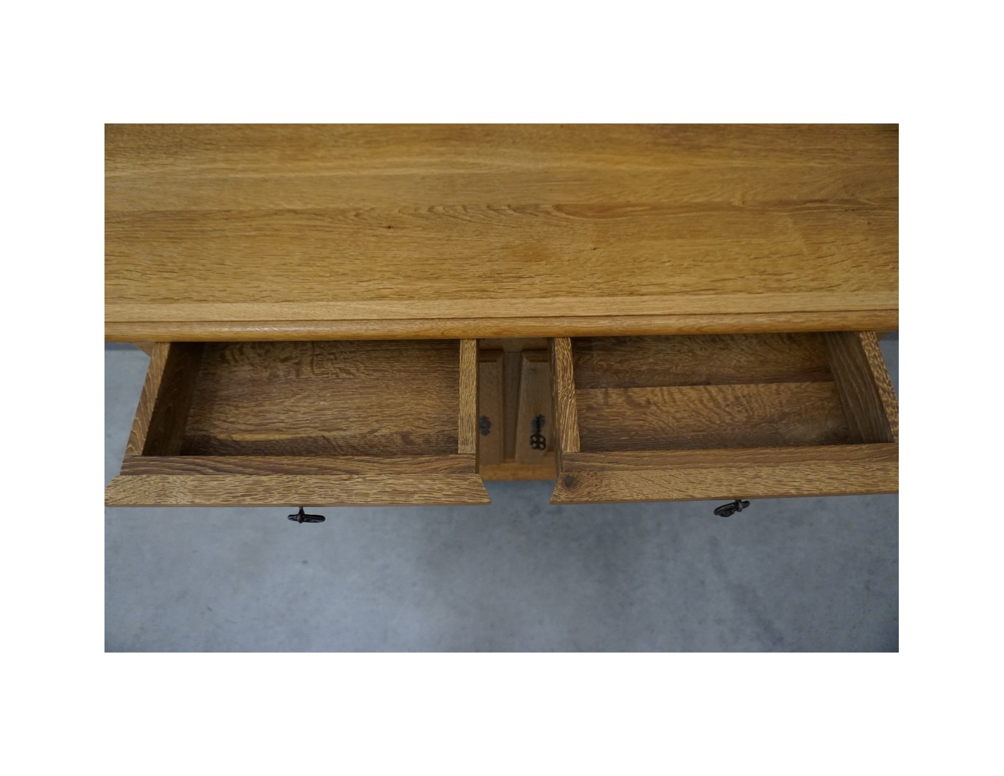 Funkcjonalna komoda wykonana z litego dębu, łącząca trwałość i elegancję. Wyposażona w dwie pojemne szafki z drzwiczkami, zapewnia dużo miejsca do przechowywania niezbędnych przedmiotów, zachowując przy tym kompaktowy rozmiar.