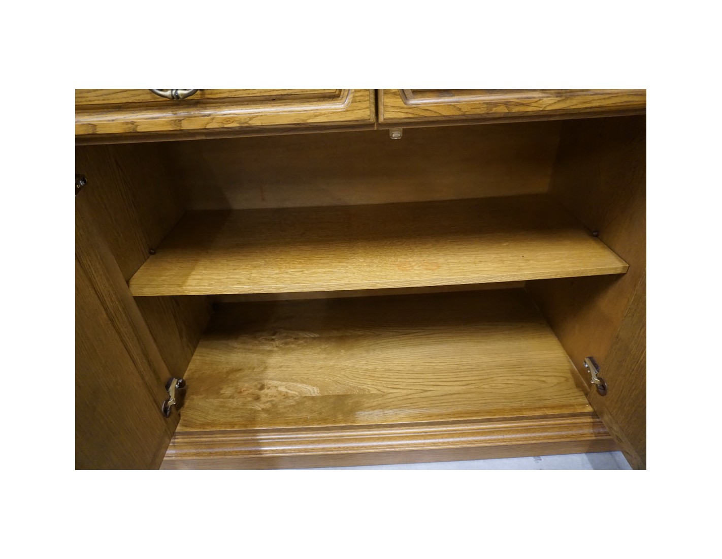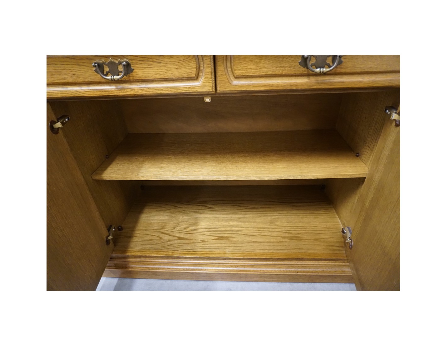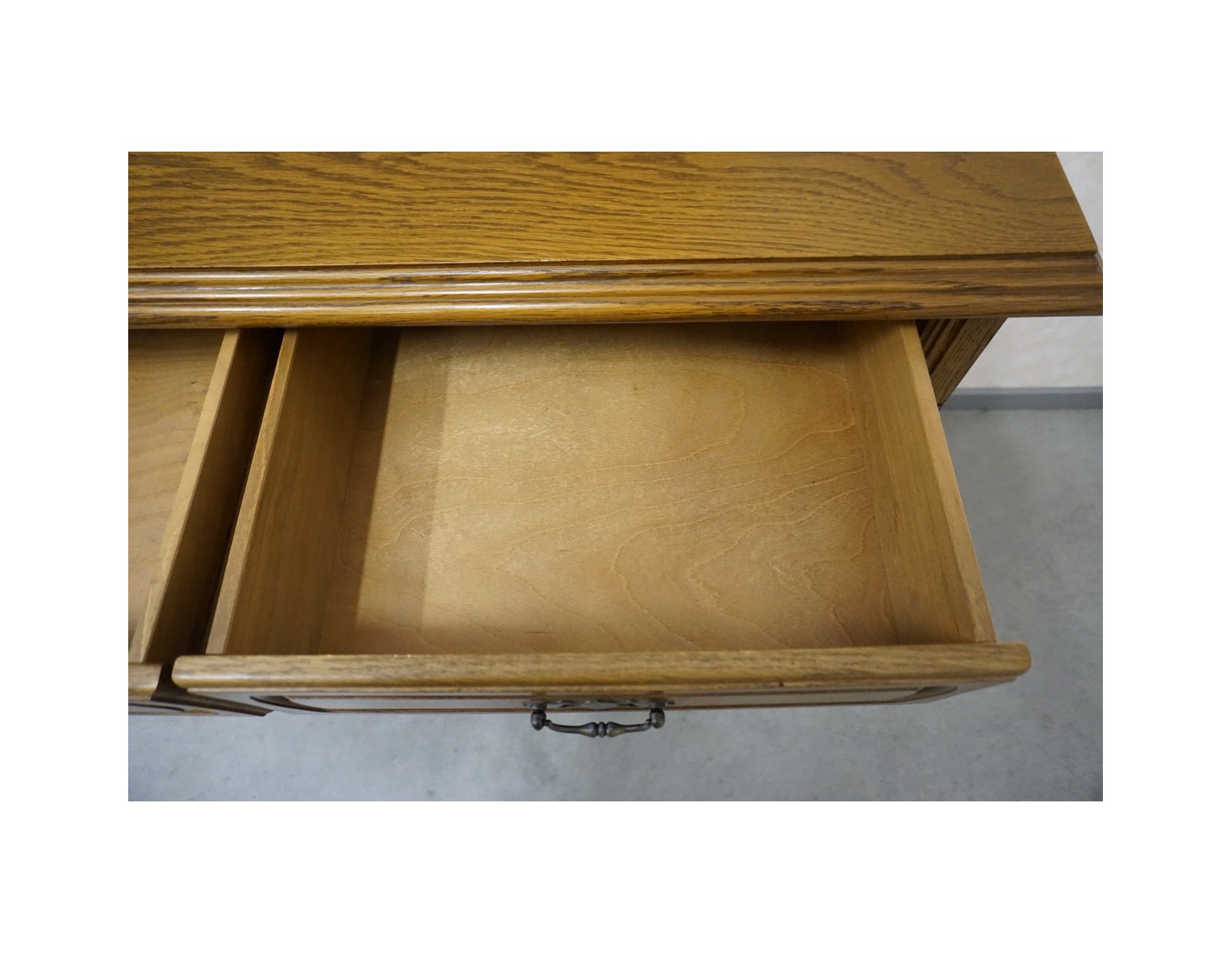 Komoda wyposażona jest w cztery pojemne szuflady oraz cztery drzwi, za którymi znajdują się praktyczne półki. To idealny mebel do przechowywania tekstyliów, naczyń lub dokumentów. Naturalny kolor dębu i klasyczna forma sprawiają, że komoda doskonale komponuje się z różnymi stylami wnętrz.