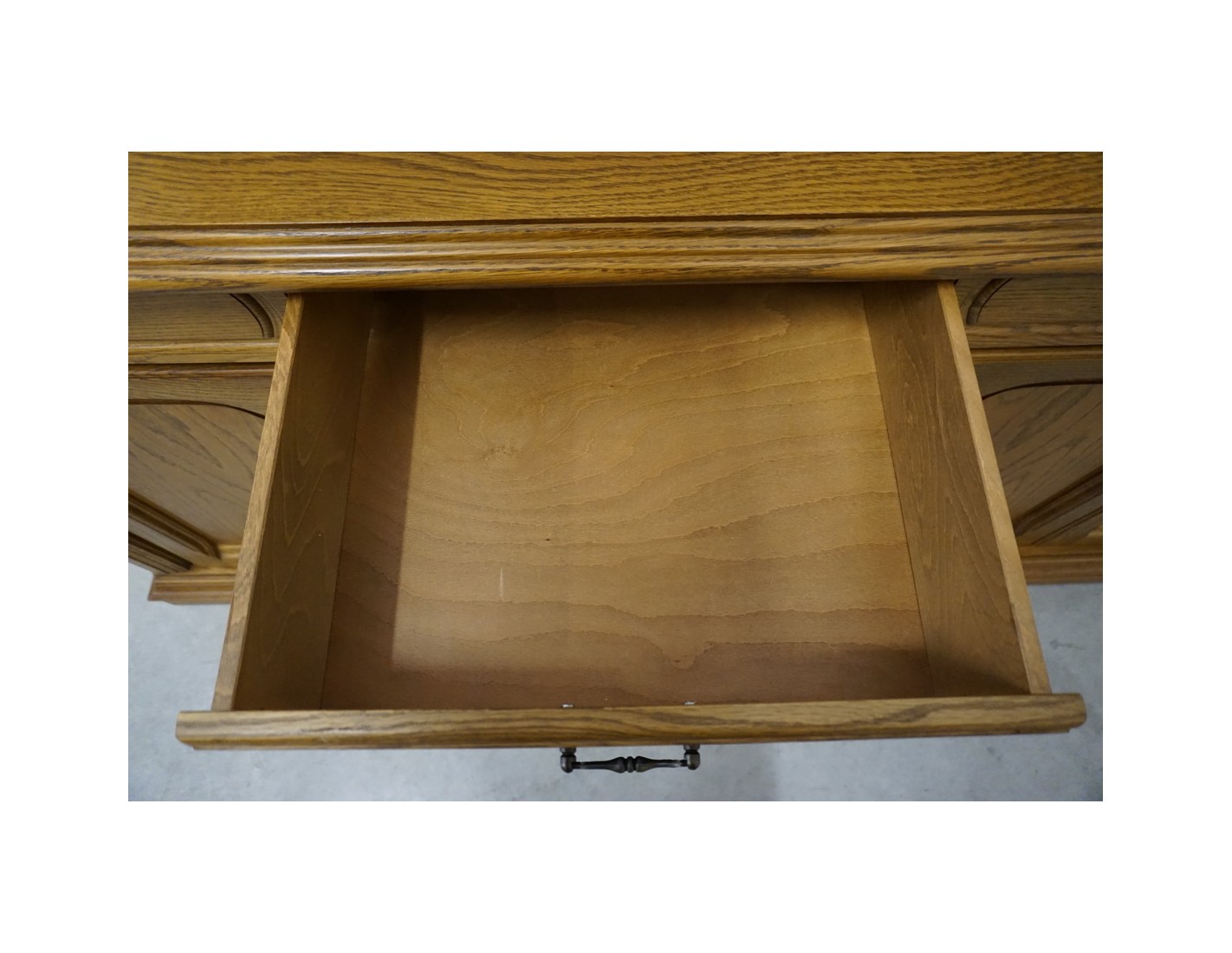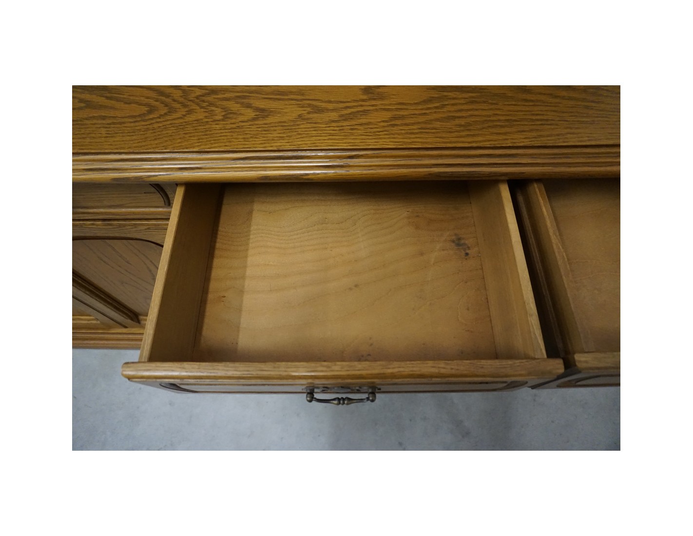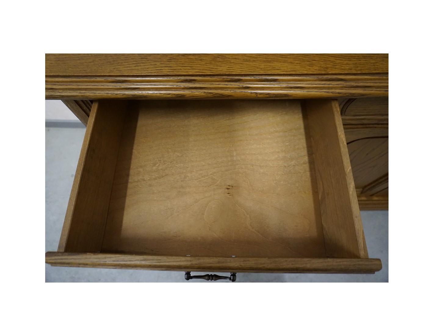 Komoda wyposażona jest w cztery pojemne szuflady oraz cztery drzwi, za którymi znajdują się praktyczne półki. To idealny mebel do przechowywania tekstyliów, naczyń lub dokumentów. Naturalny kolor dębu i klasyczna forma sprawiają, że komoda doskonale komponuje się z różnymi stylami wnętrz.