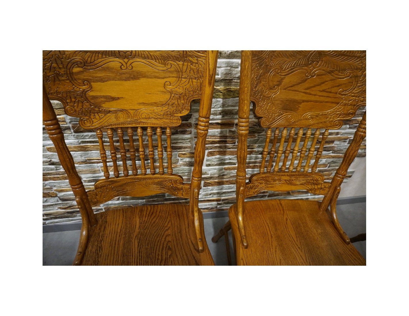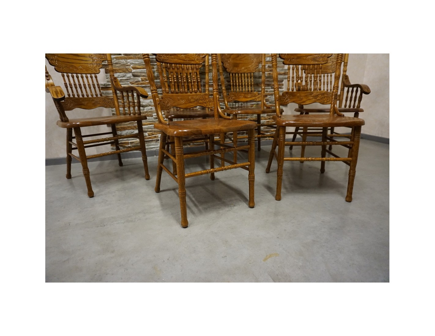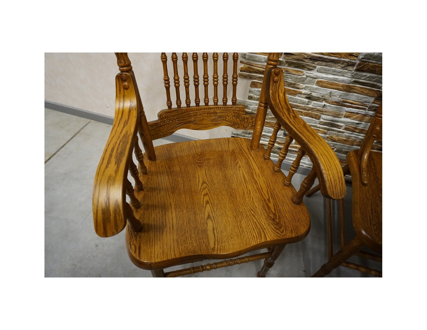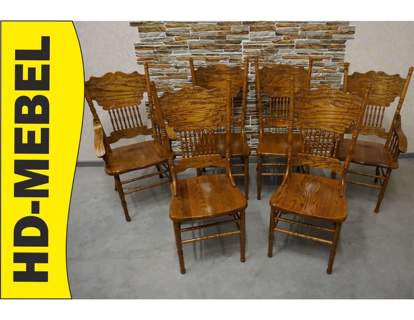 Elegancki zestaw krzeseł dębowych w stylu amerykańskim, który doskonale uzupełni wystrój jadalni, salonu lub gabinetu. W skład kompletu wchodzi 6 krzeseł: 2 krzesła z podłokietnikami i 4 krzesła bez podłokietników.