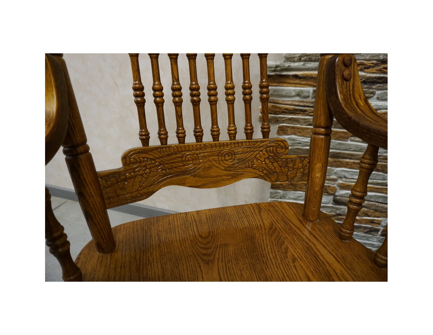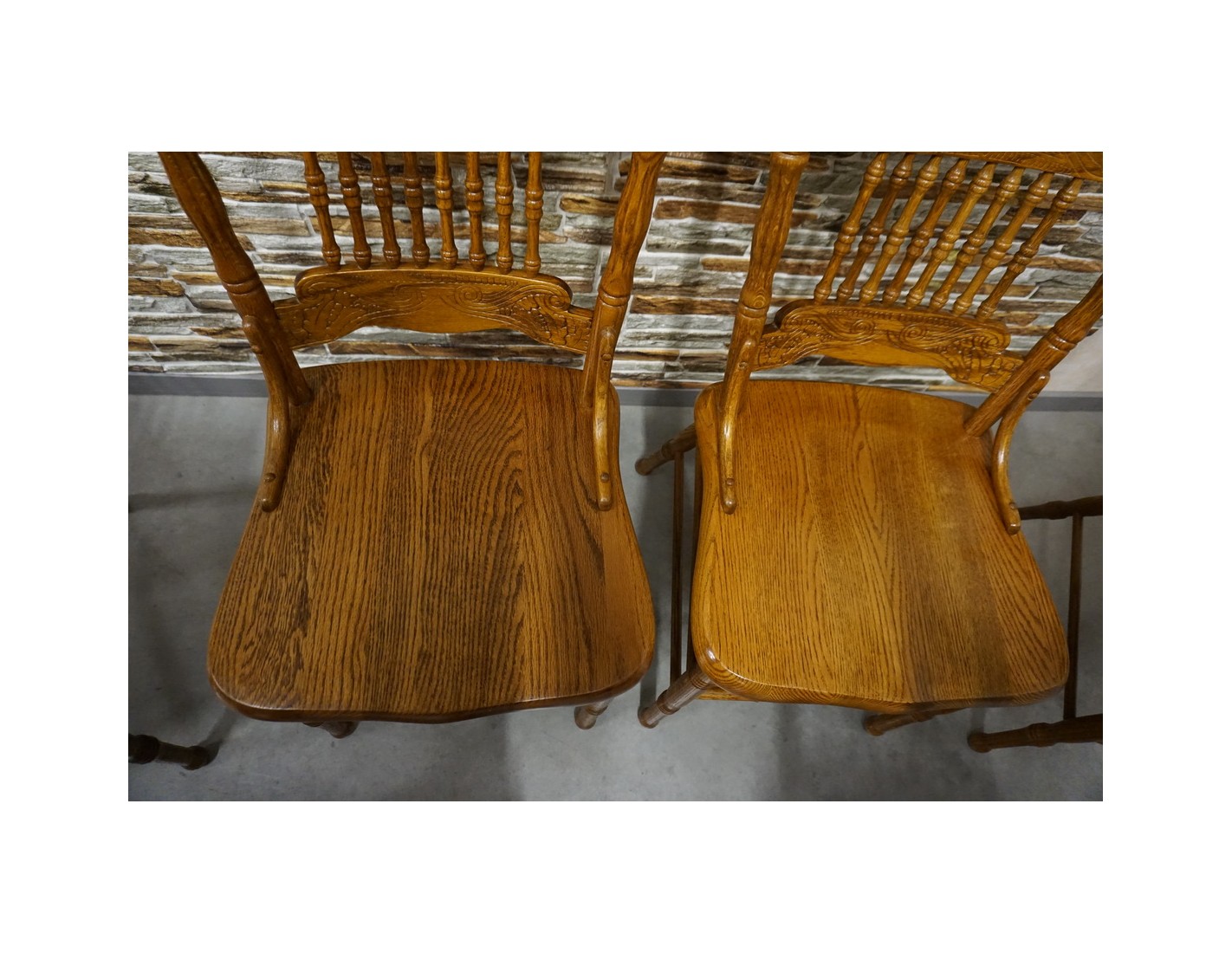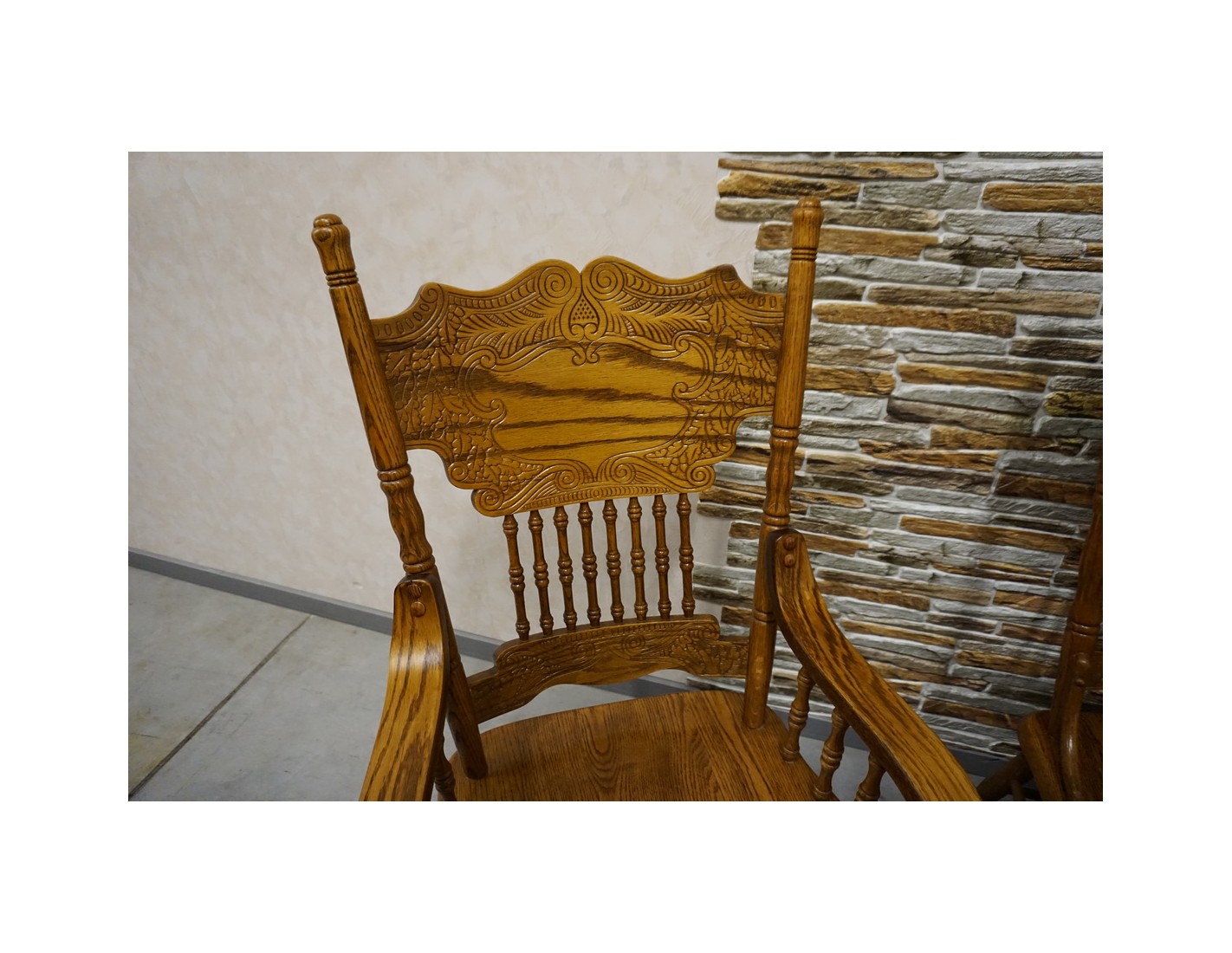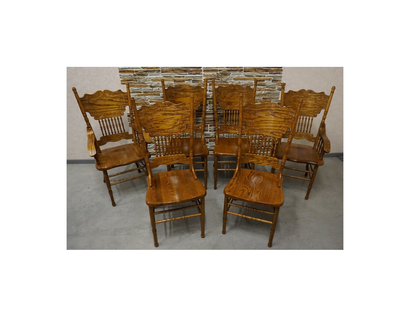 Elegancki zestaw krzeseł dębowych w stylu amerykańskim, który doskonale uzupełni wystrój jadalni, salonu lub gabinetu. W skład kompletu wchodzi 6 krzeseł: 2 krzesła z podłokietnikami i 4 krzesła bez podłokietników.