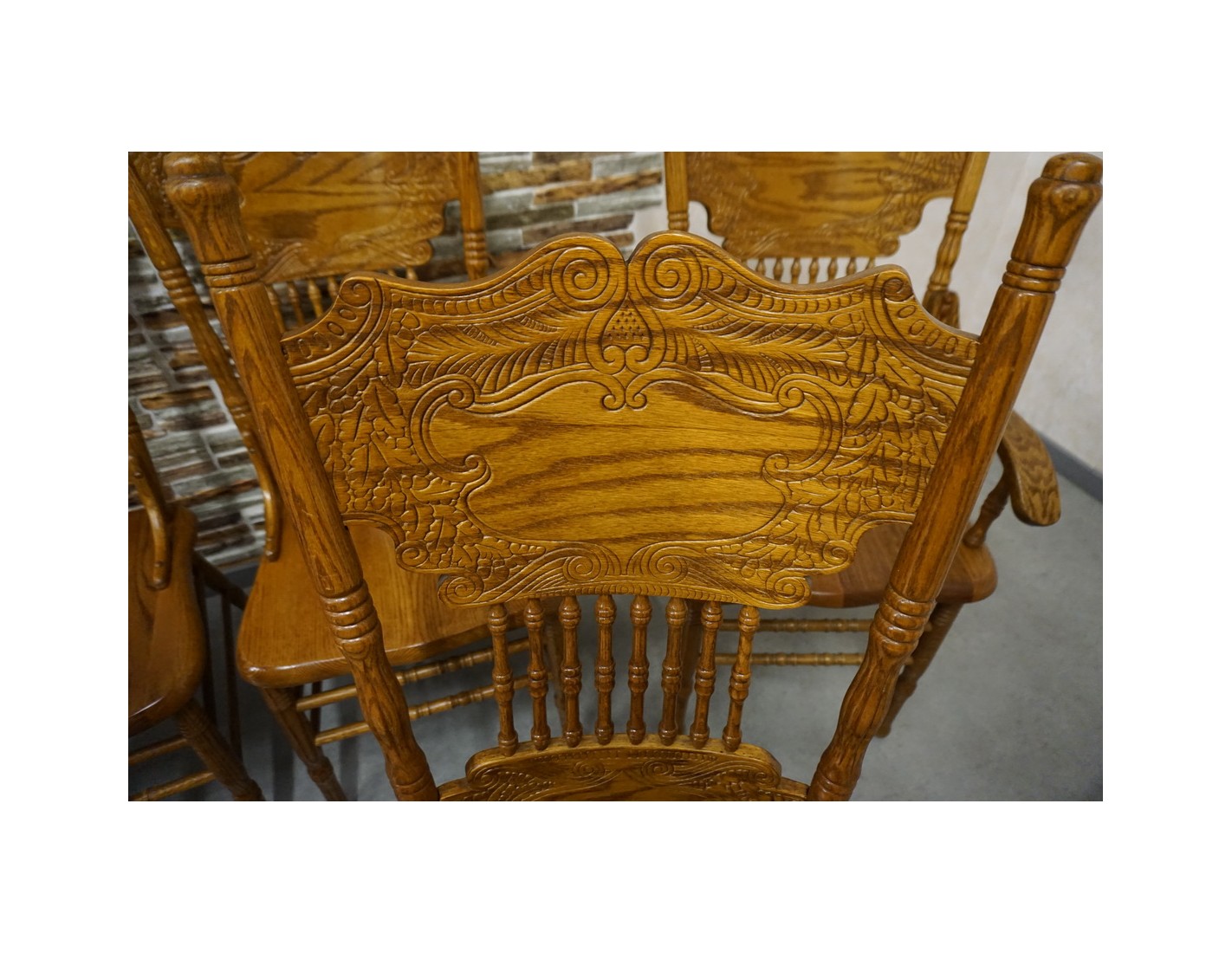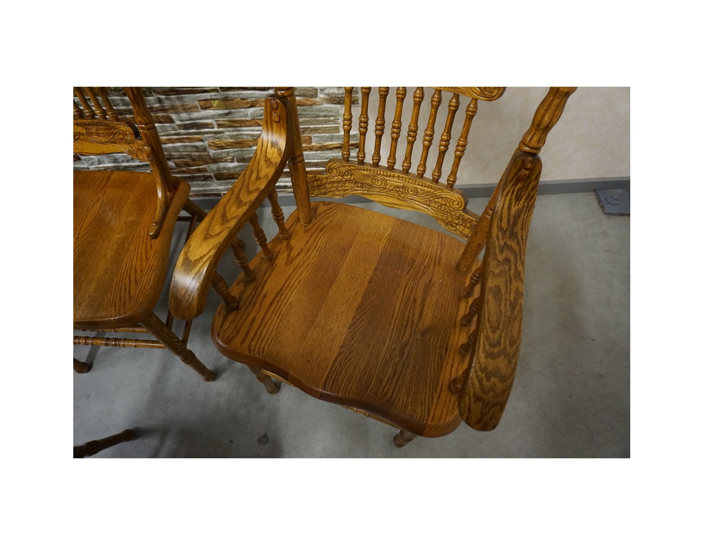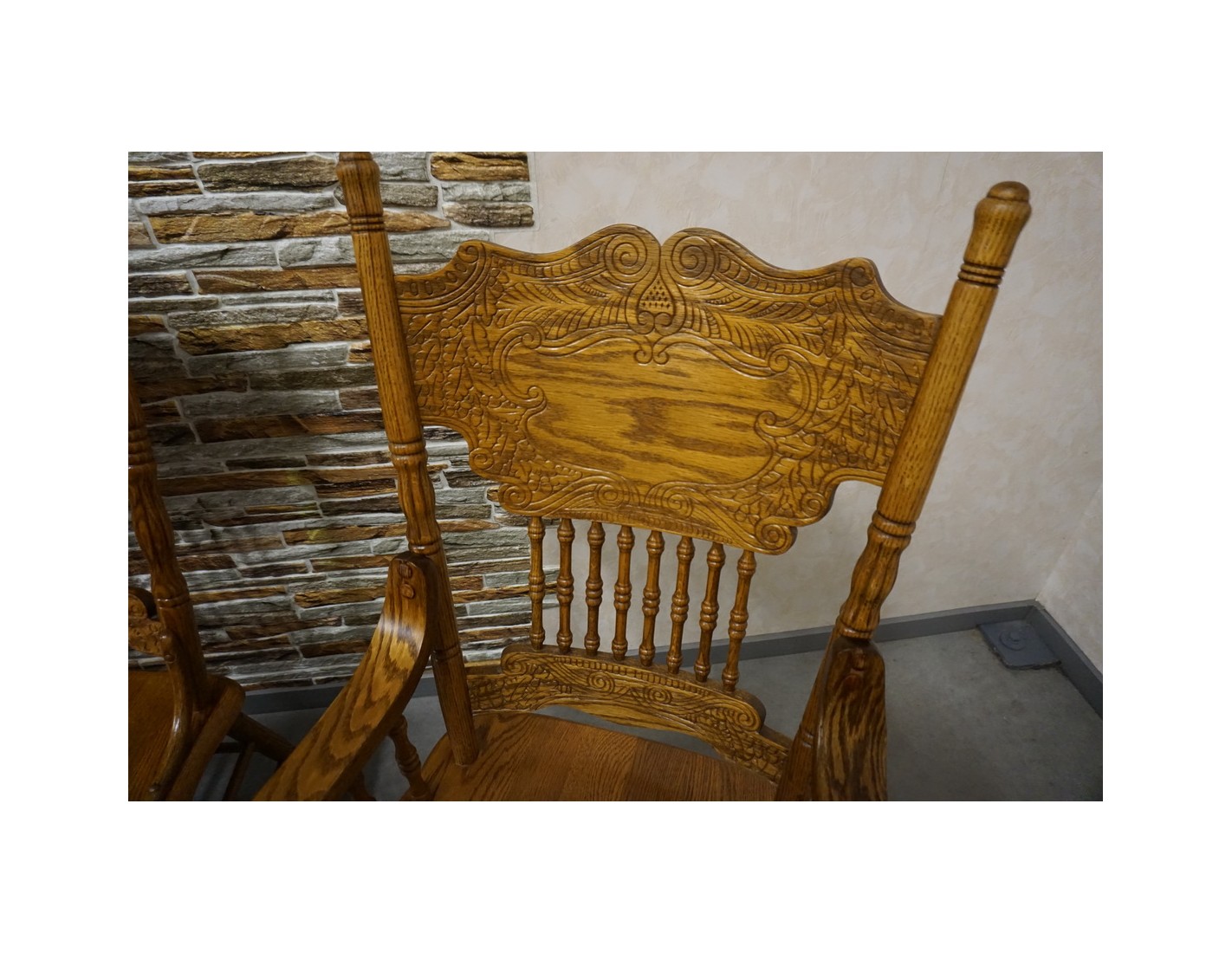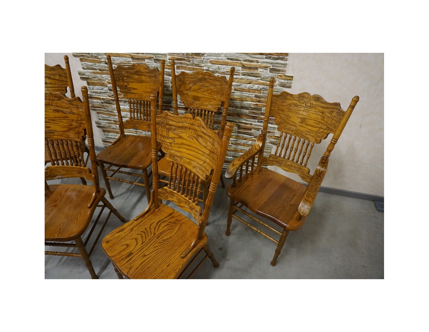 Elegancki zestaw krzeseł dębowych w stylu amerykańskim, który doskonale uzupełni wystrój jadalni, salonu lub gabinetu. W skład kompletu wchodzi 6 krzeseł: 2 krzesła z podłokietnikami i 4 krzesła bez podłokietników.
