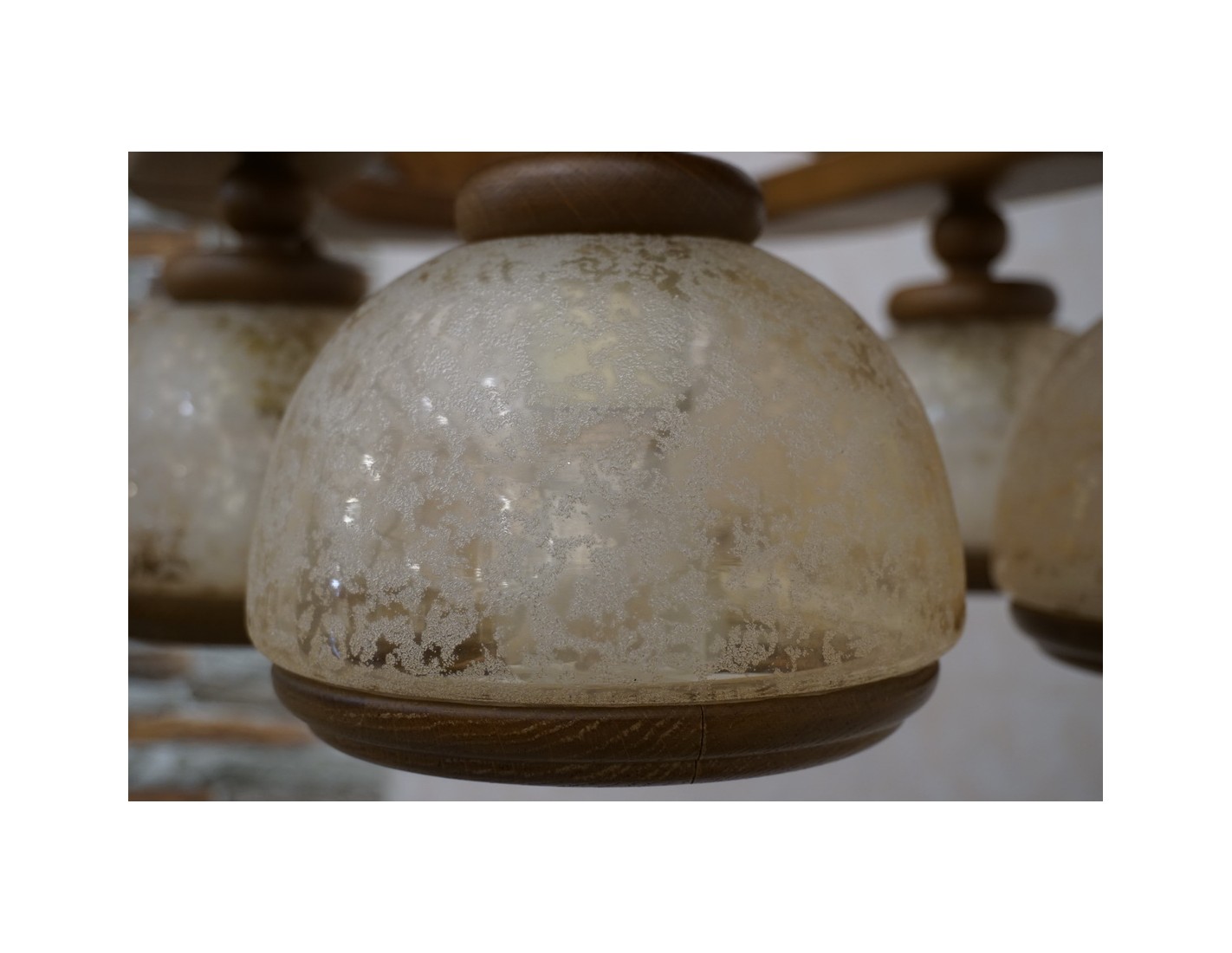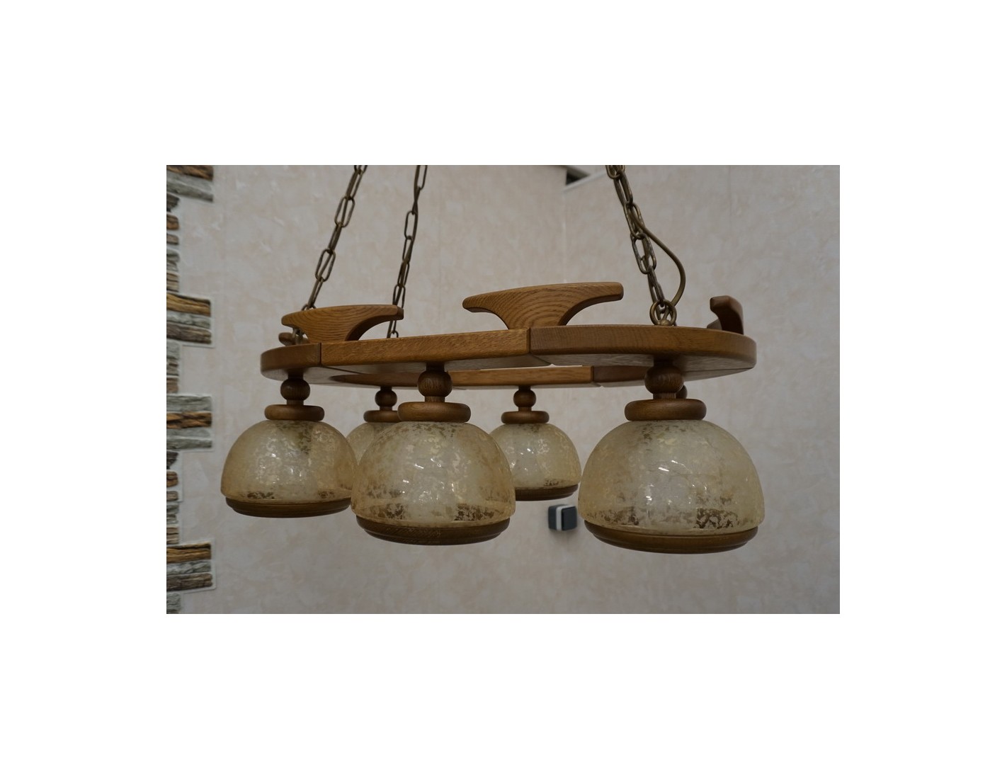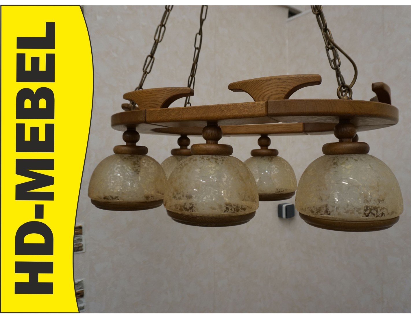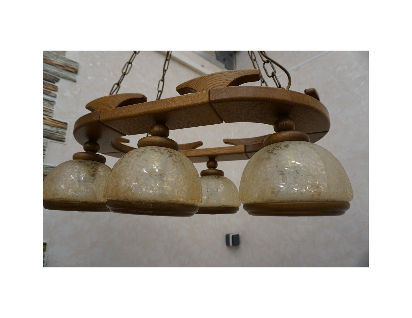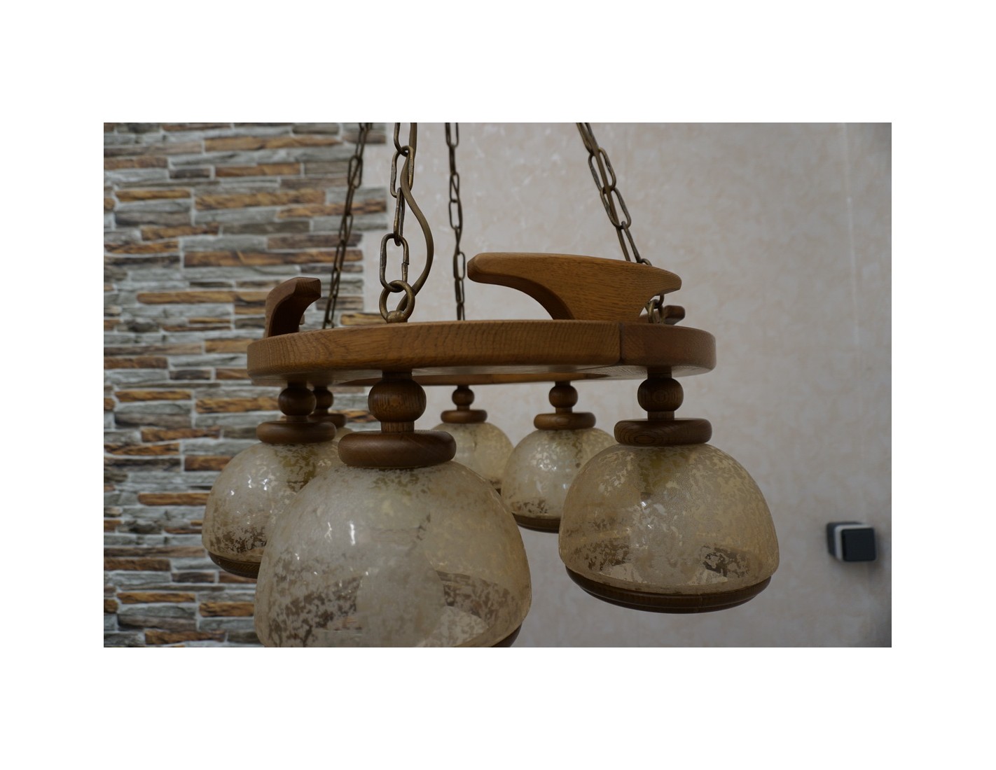 Żyrandol dębowy jest wykonany z najwyższej jakości drewna, co zapewnia jego trwałość i unikalny wygląd. Sześć kloszy równomiernie rozprasza światło, tworząc przytulną atmosferę idealną do salonu, jadalni lub sypialni.