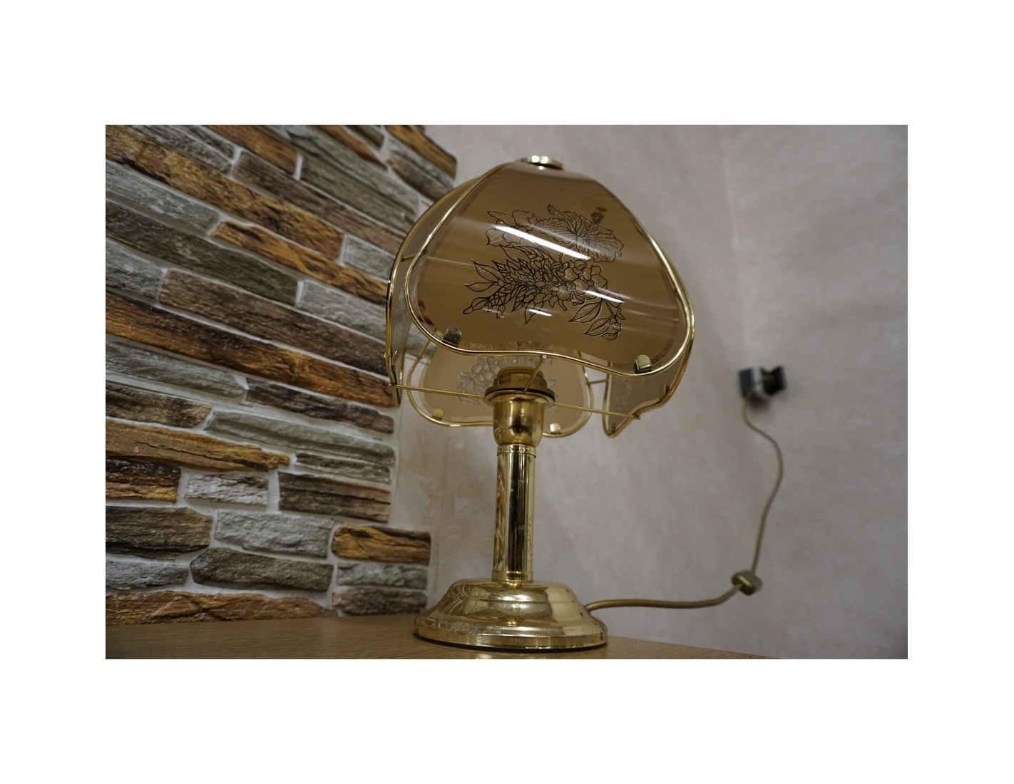 Stylowa lampka biurkowa z ozdobnym szklanym kloszem, wyposażona w gwint E24. Idealny dodatek do każdego biurka, łączący praktyczność z estetyką.