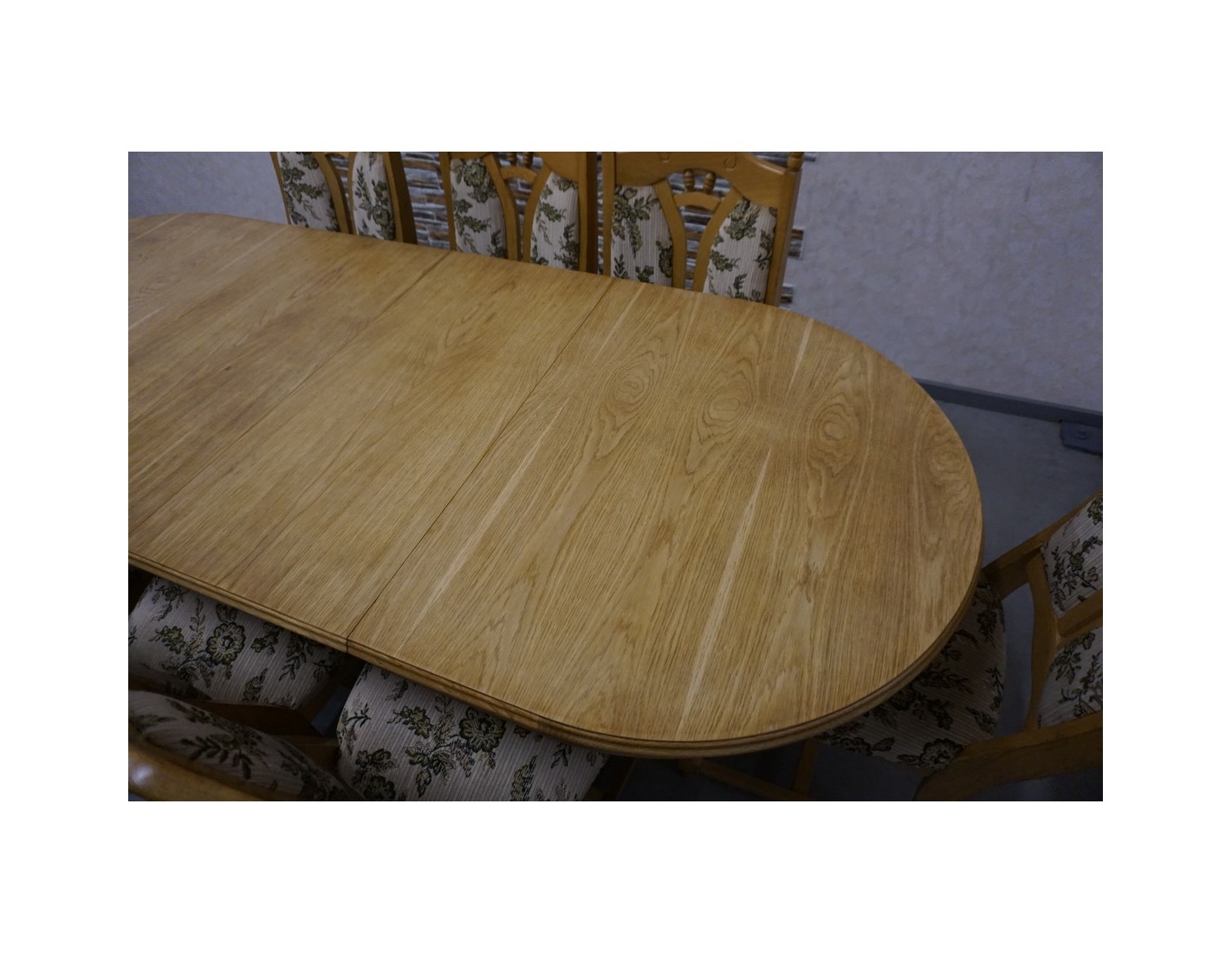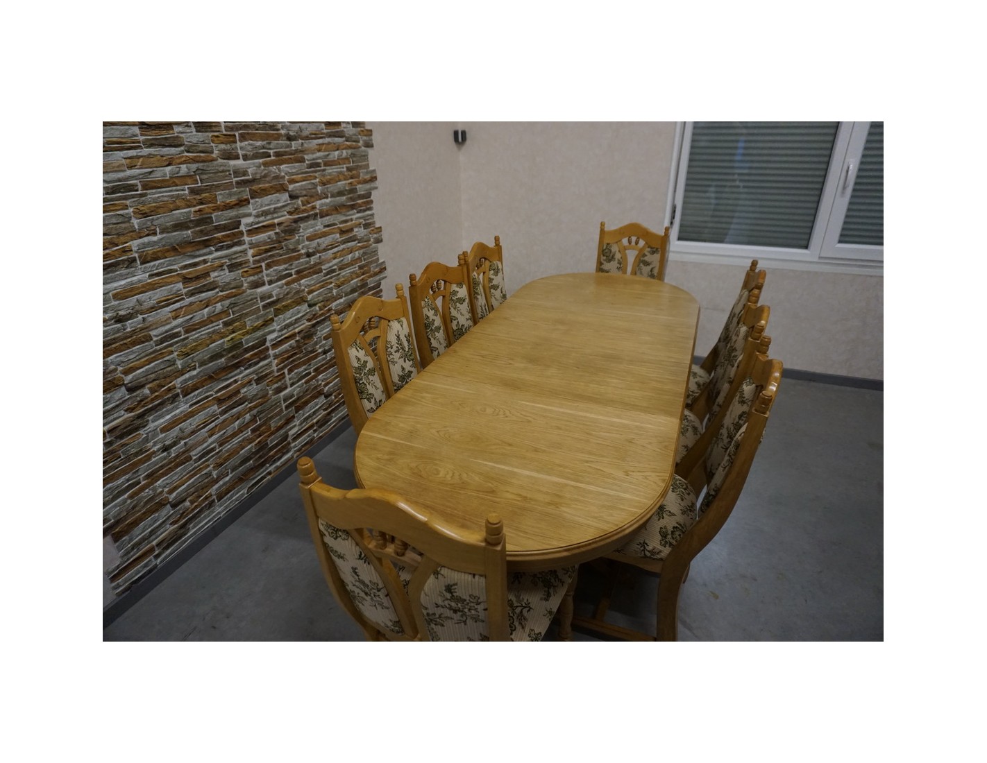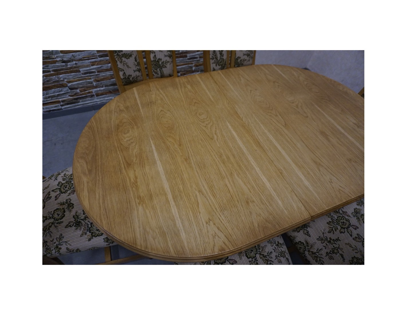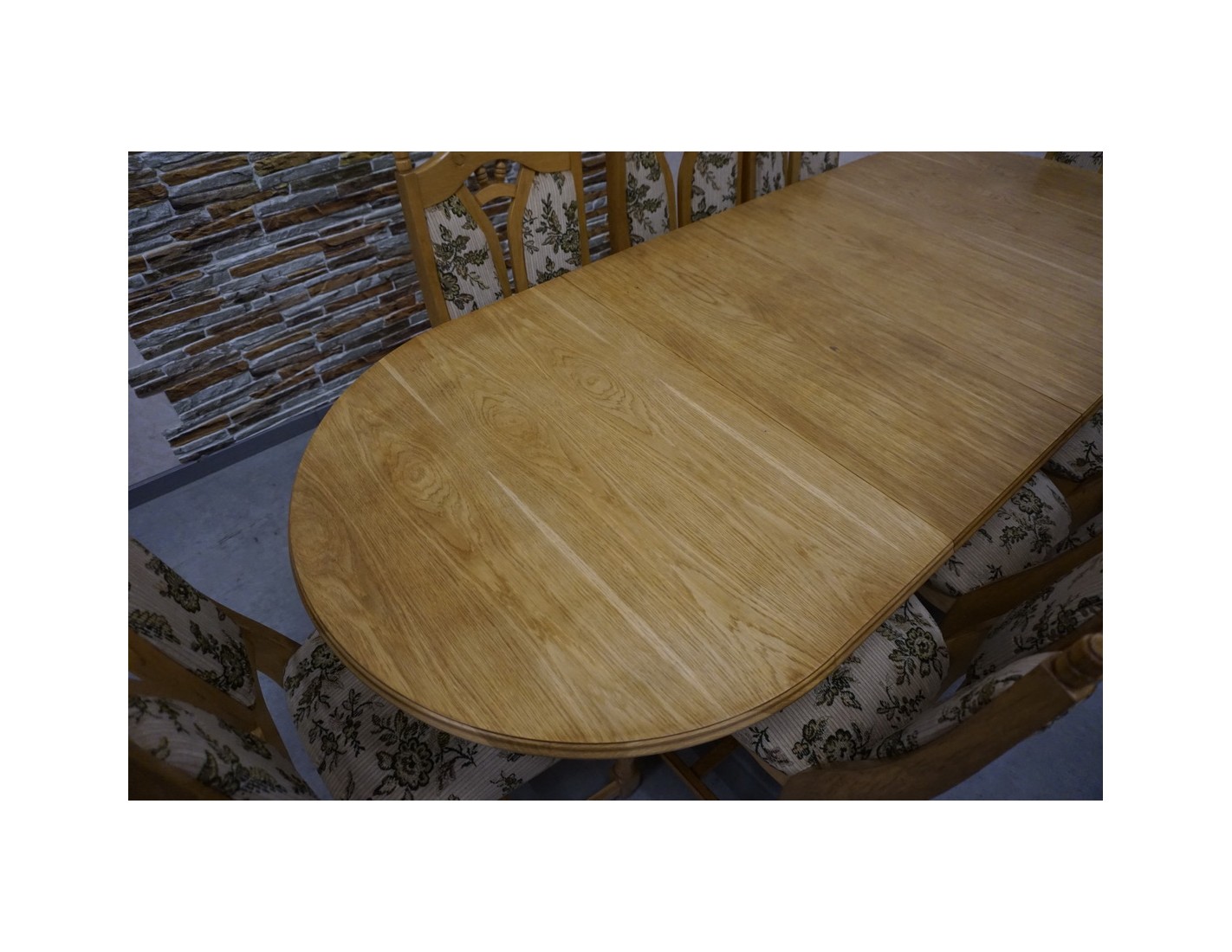 Elegancki zestaw do jadalni składający się z rozkładanego stołu dębowego oraz 8 wygodnych krzeseł. Stół idealnie nadaje się do większych spotkań, oferując możliwość rozłożenia, aby pomieścić więcej osób.