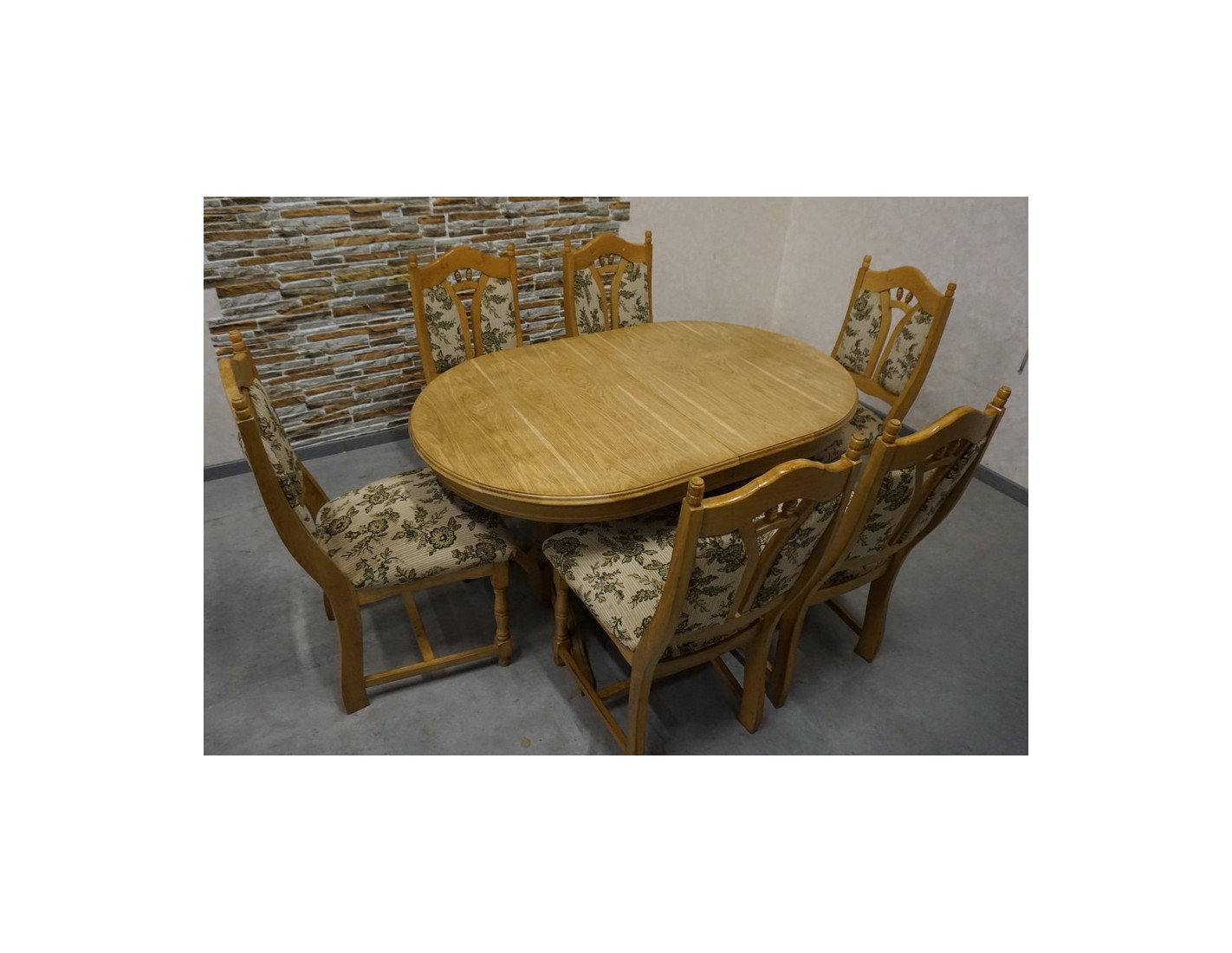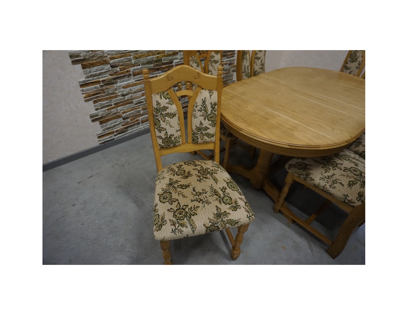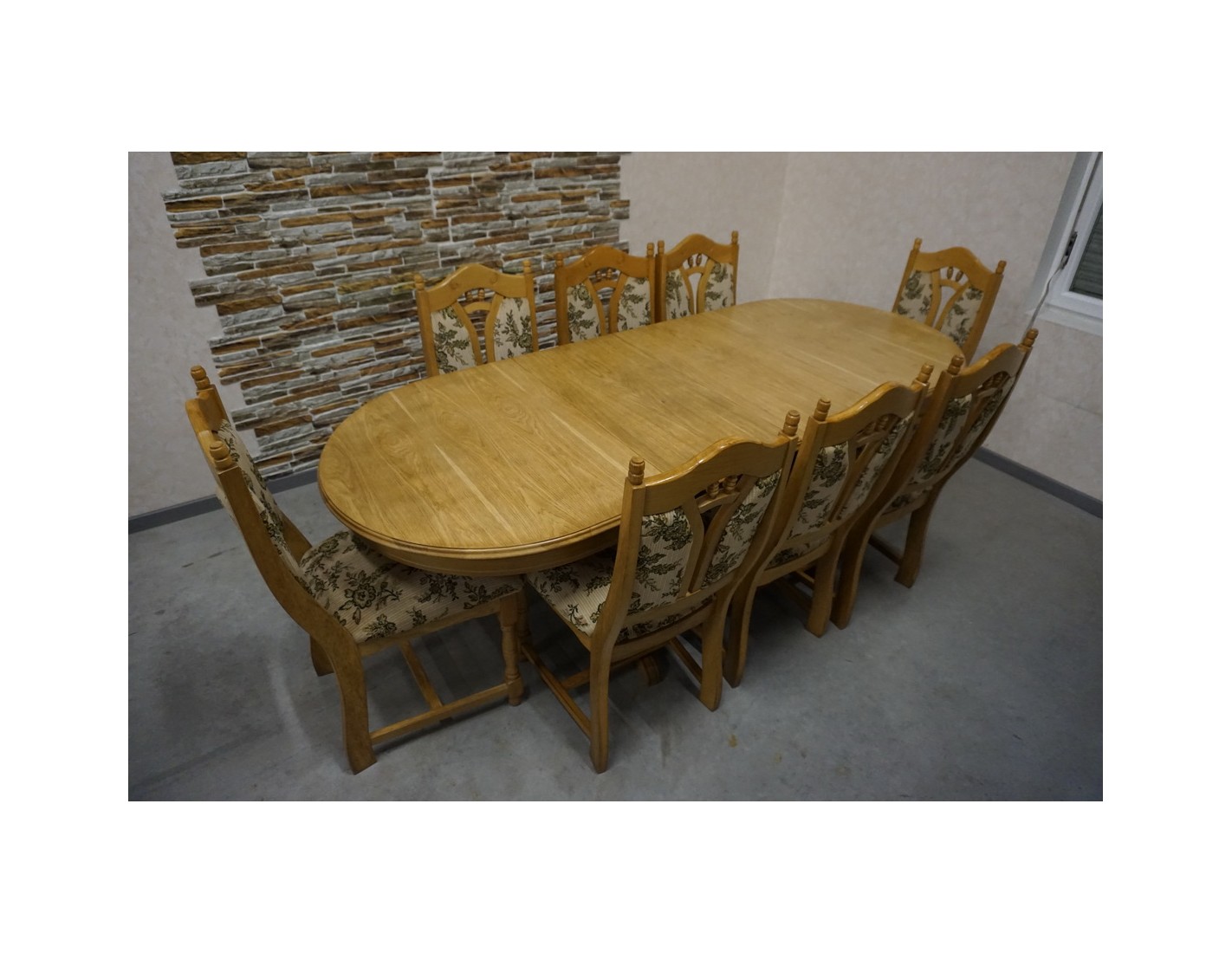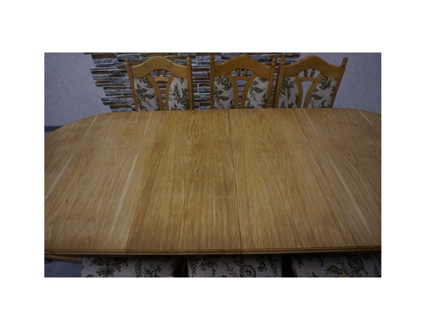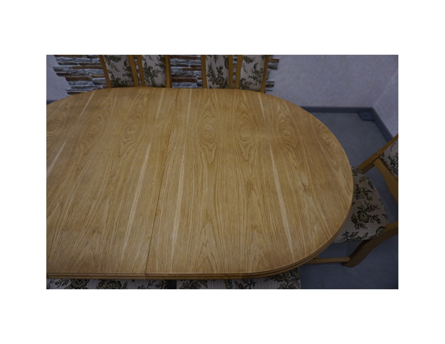 Elegancki zestaw do jadalni składający się z rozkładanego stołu dębowego oraz 8 wygodnych krzeseł. Stół idealnie nadaje się do większych spotkań, oferując możliwość rozłożenia, aby pomieścić więcej osób.