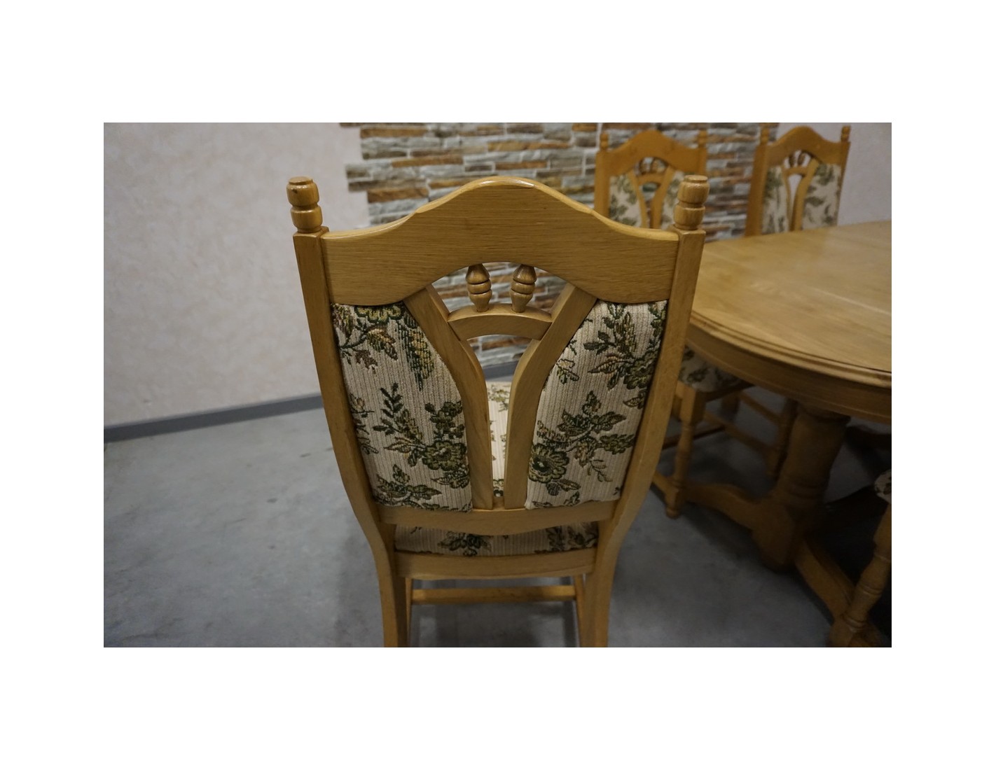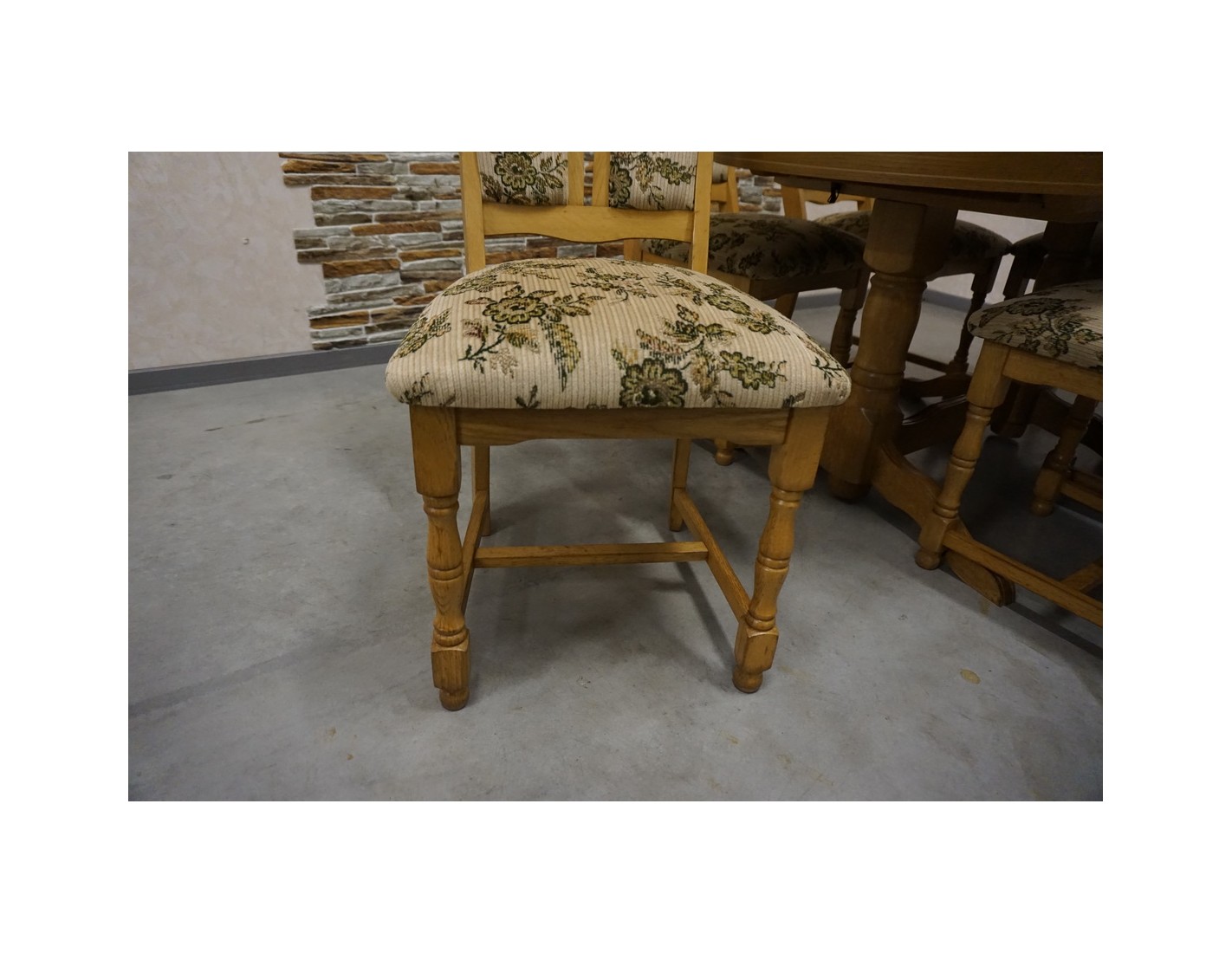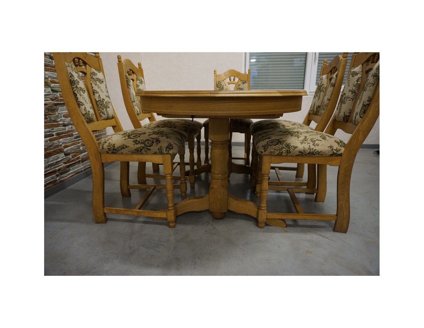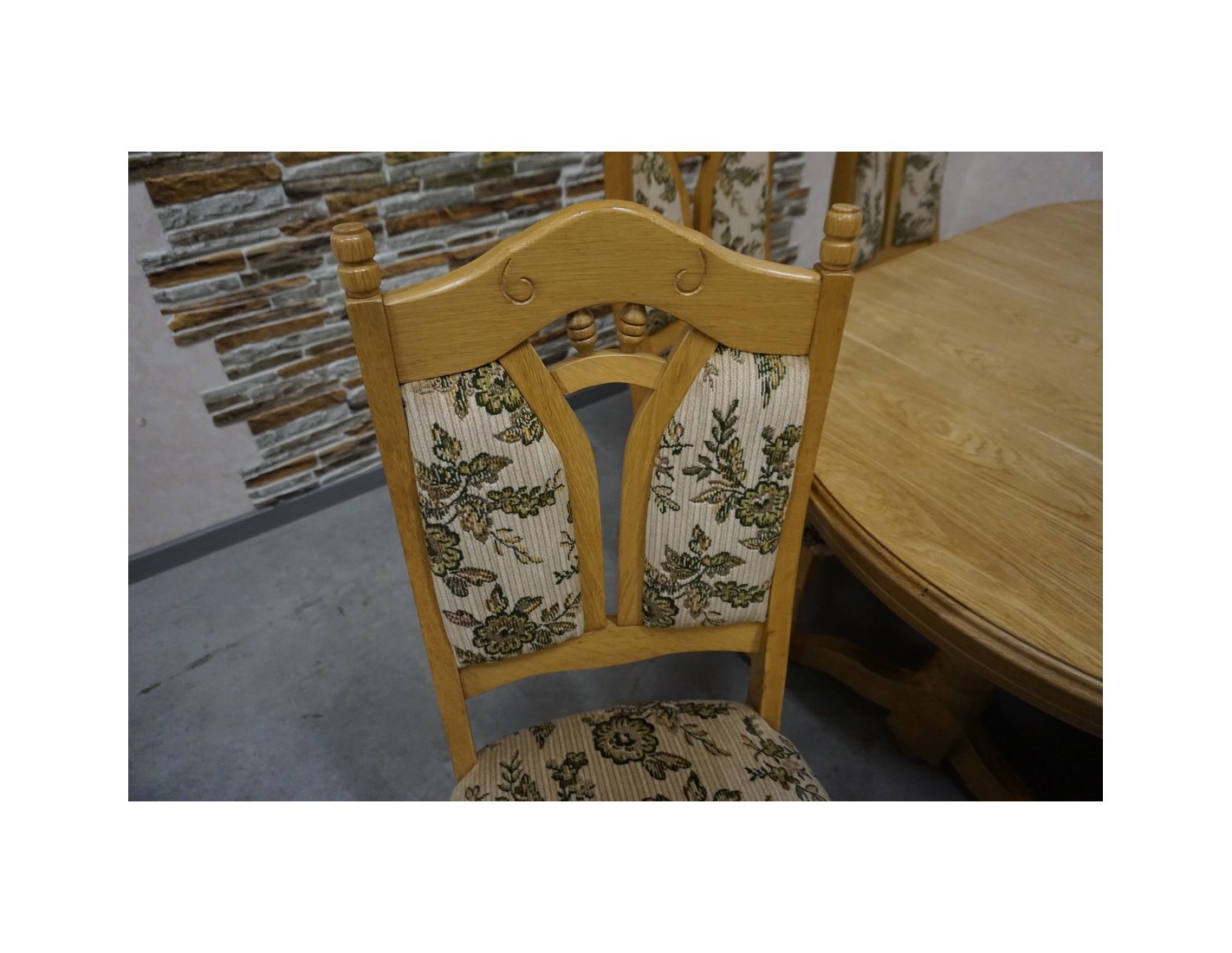 Elegancki zestaw do jadalni składający się z rozkładanego stołu dębowego oraz 8 wygodnych krzeseł. Stół idealnie nadaje się do większych spotkań, oferując możliwość rozłożenia, aby pomieścić więcej osób.