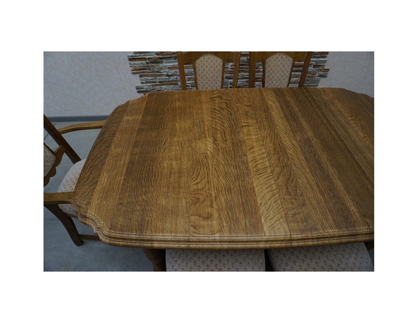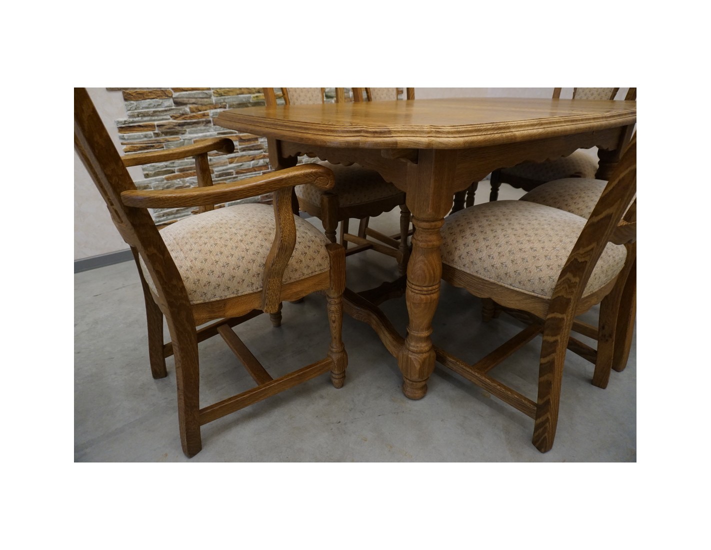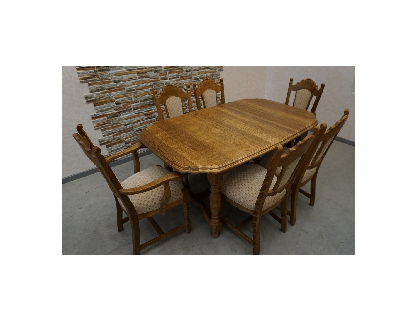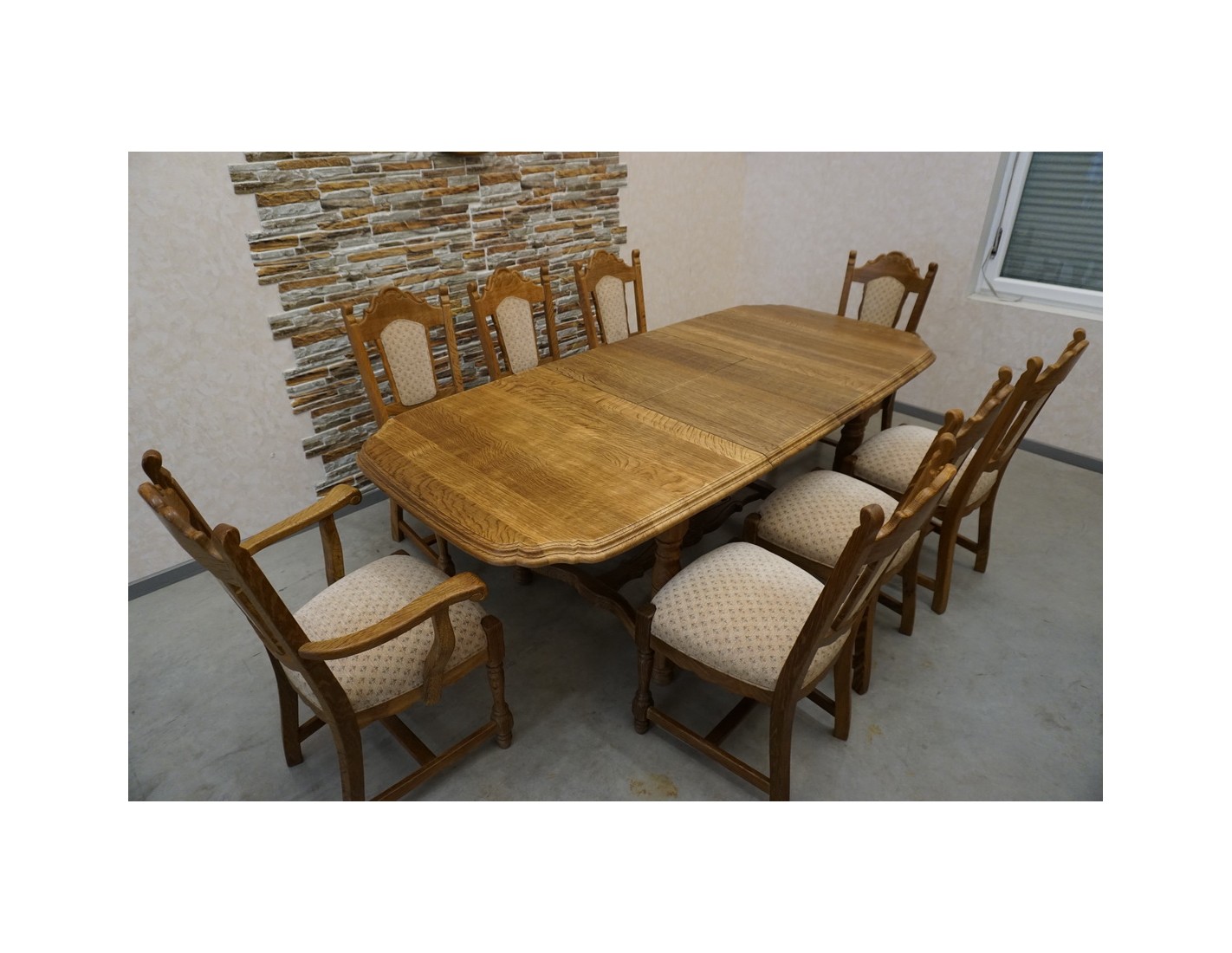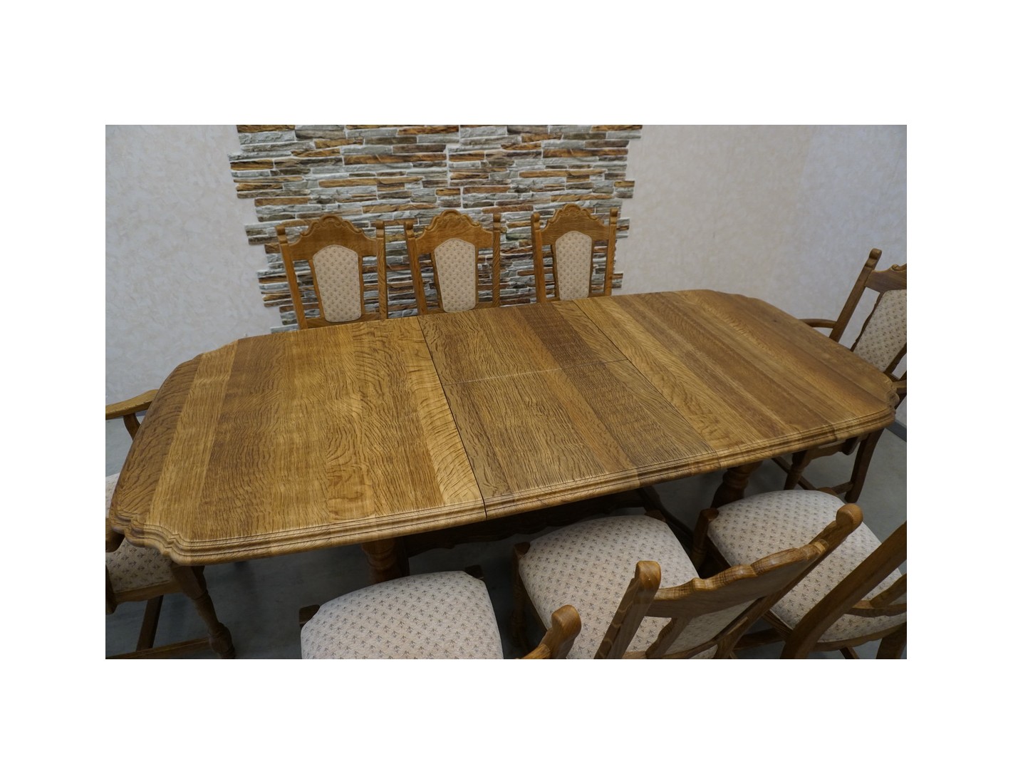 Elegancki i solidny zestaw jadalniany wykonany z litego dębu to doskonała propozycja dla osób ceniących naturalne materiały i funkcjonalność. Składa się z rozkładanego stołu oraz ośmiu komfortowych krzeseł – sześciu mniejszych i dwóch większych. Klasyczne wzornictwo w połączeniu z trwałością drewna sprawdzi się zarówno w przestronnej jadalni, jak i w salonie.
