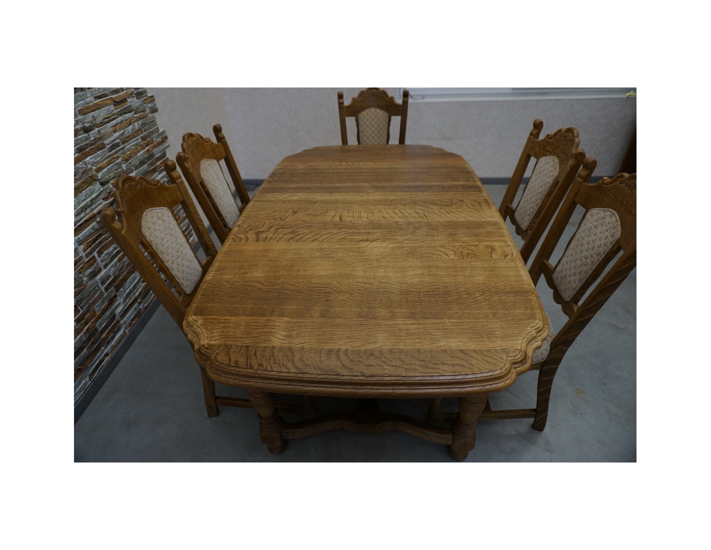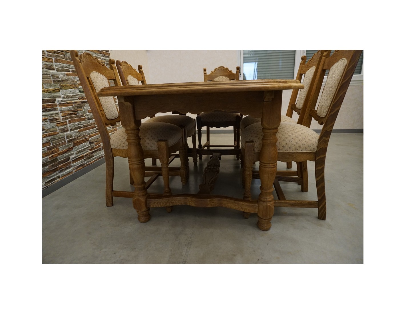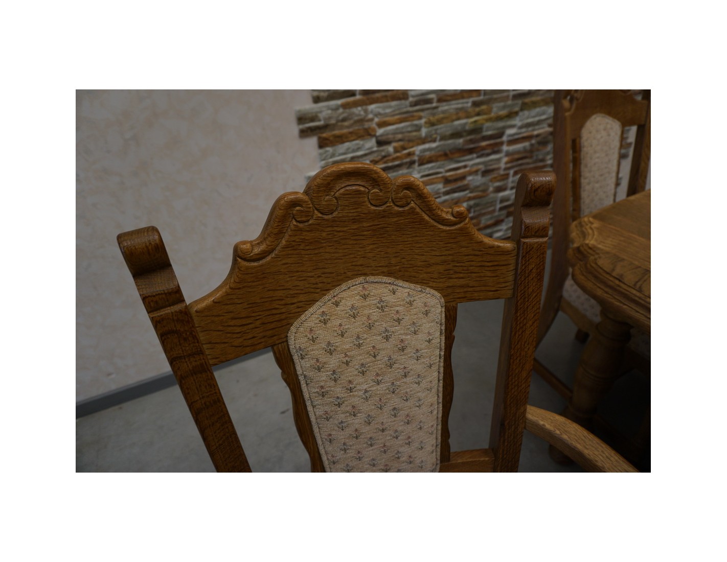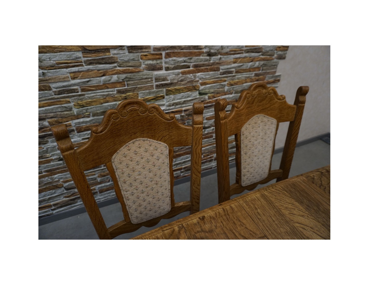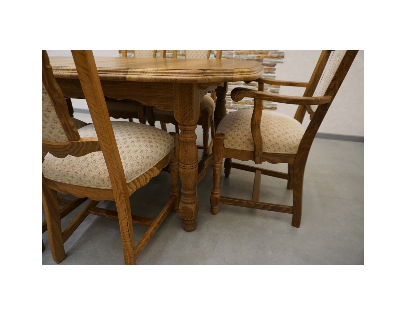 Elegancki i solidny zestaw jadalniany wykonany z litego dębu to doskonała propozycja dla osób ceniących naturalne materiały i funkcjonalność. Składa się z rozkładanego stołu oraz ośmiu komfortowych krzeseł – sześciu mniejszych i dwóch większych. Klasyczne wzornictwo w połączeniu z trwałością drewna sprawdzi się zarówno w przestronnej jadalni, jak i w salonie.