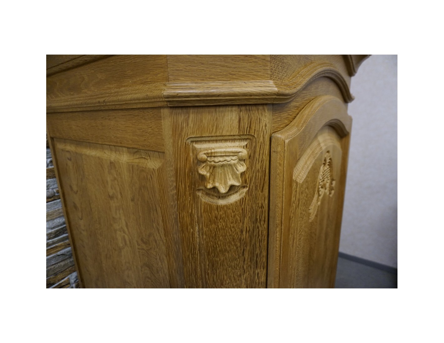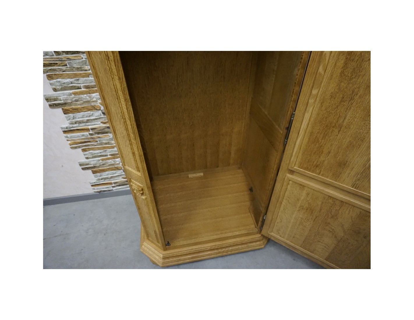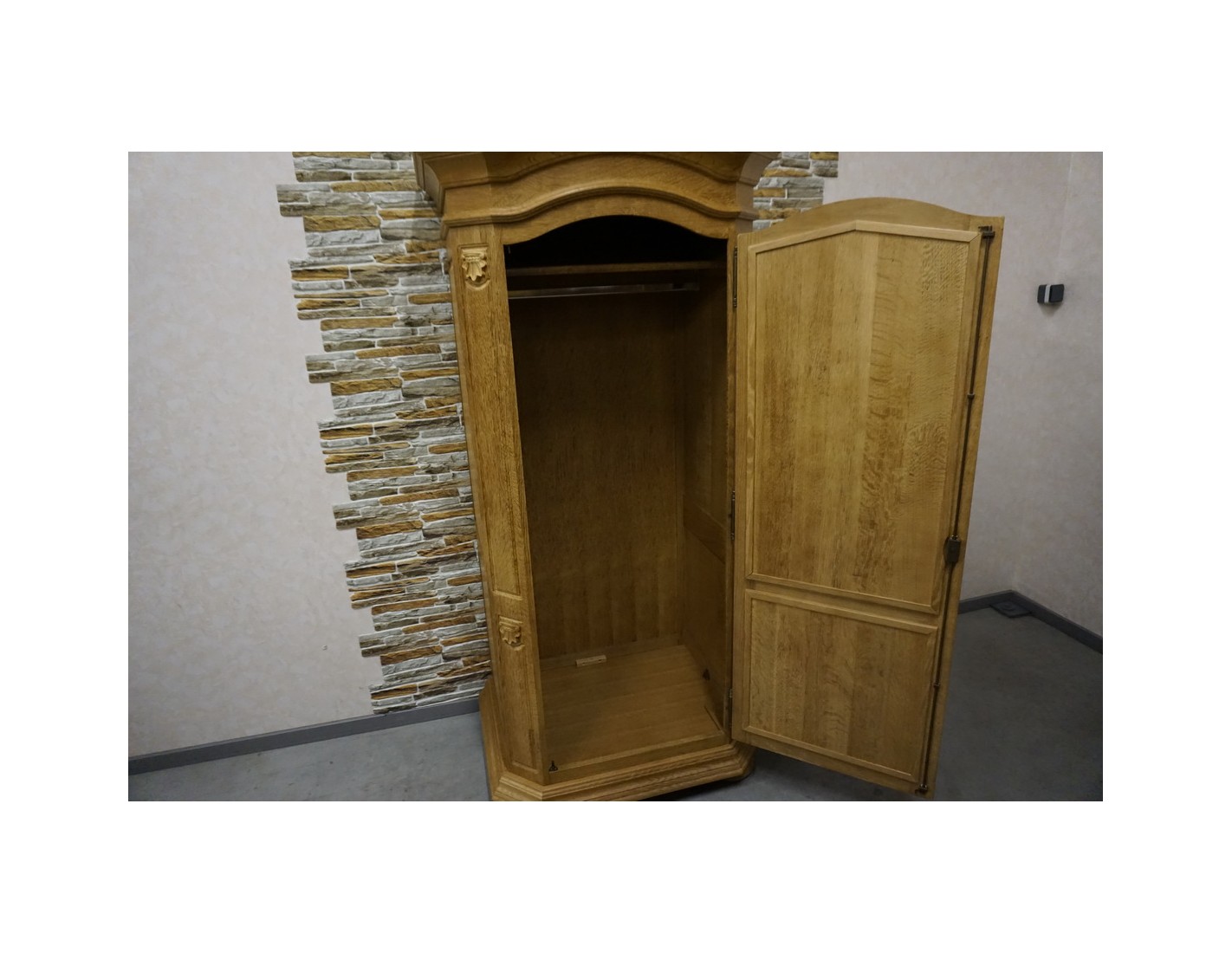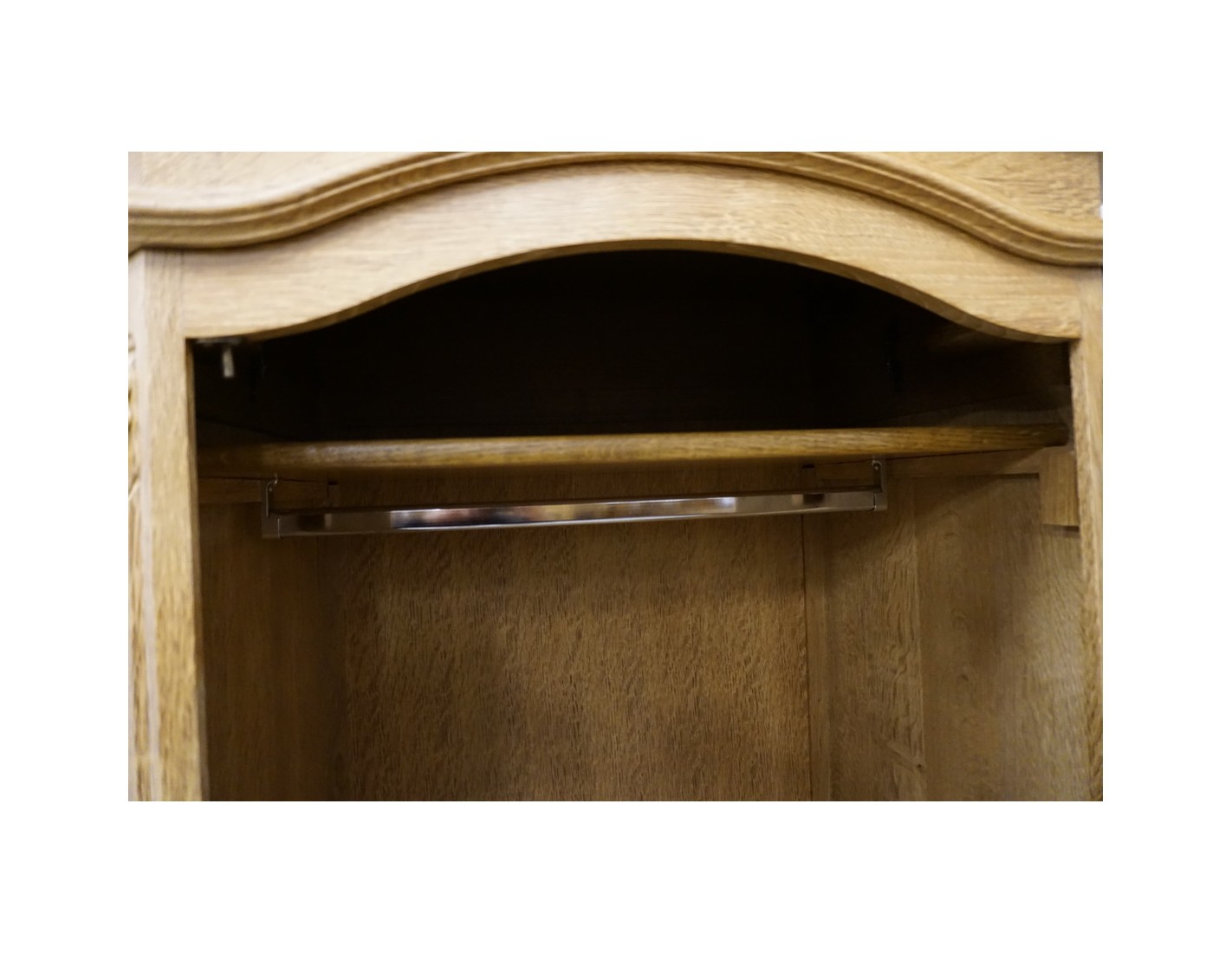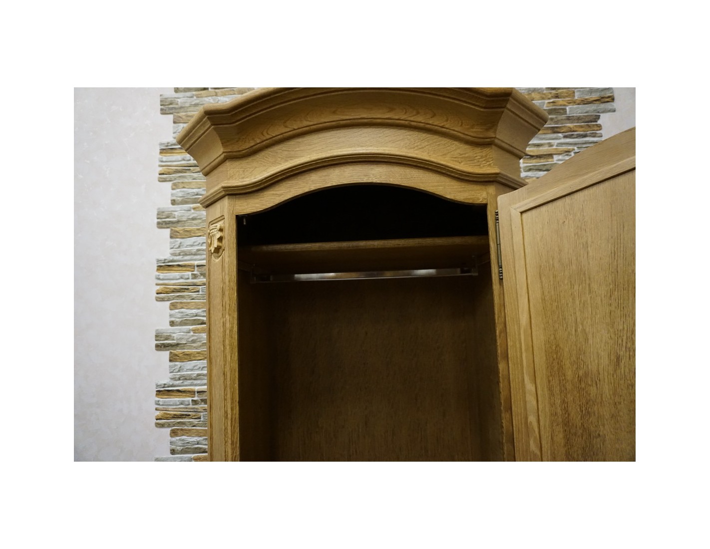 Wewnątrz szafy znajduje się drążek na ubrania, który umożliwia wygodne zawieszanie odzieży. Naturalne wykończenie dębowe podkreśla szlachetność drewna i nadaje wnętrzu ciepłego, ponadczasowego charakteru.