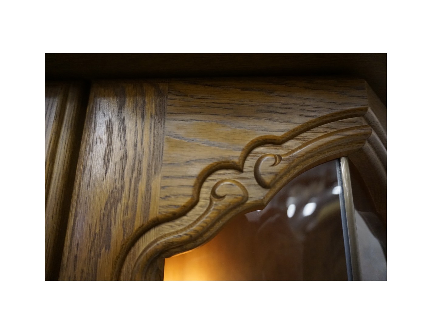 Stylowa witryna narożna wykonana z dębu, idealna do eleganckiego zagospodarowania przestrzeni narożnej w salonie czy jadalni. Podświetlenie oraz szklane półki podkreślają eksponowane przedmioty, nadając wnętrzu nowoczesny i szykowny charakter.