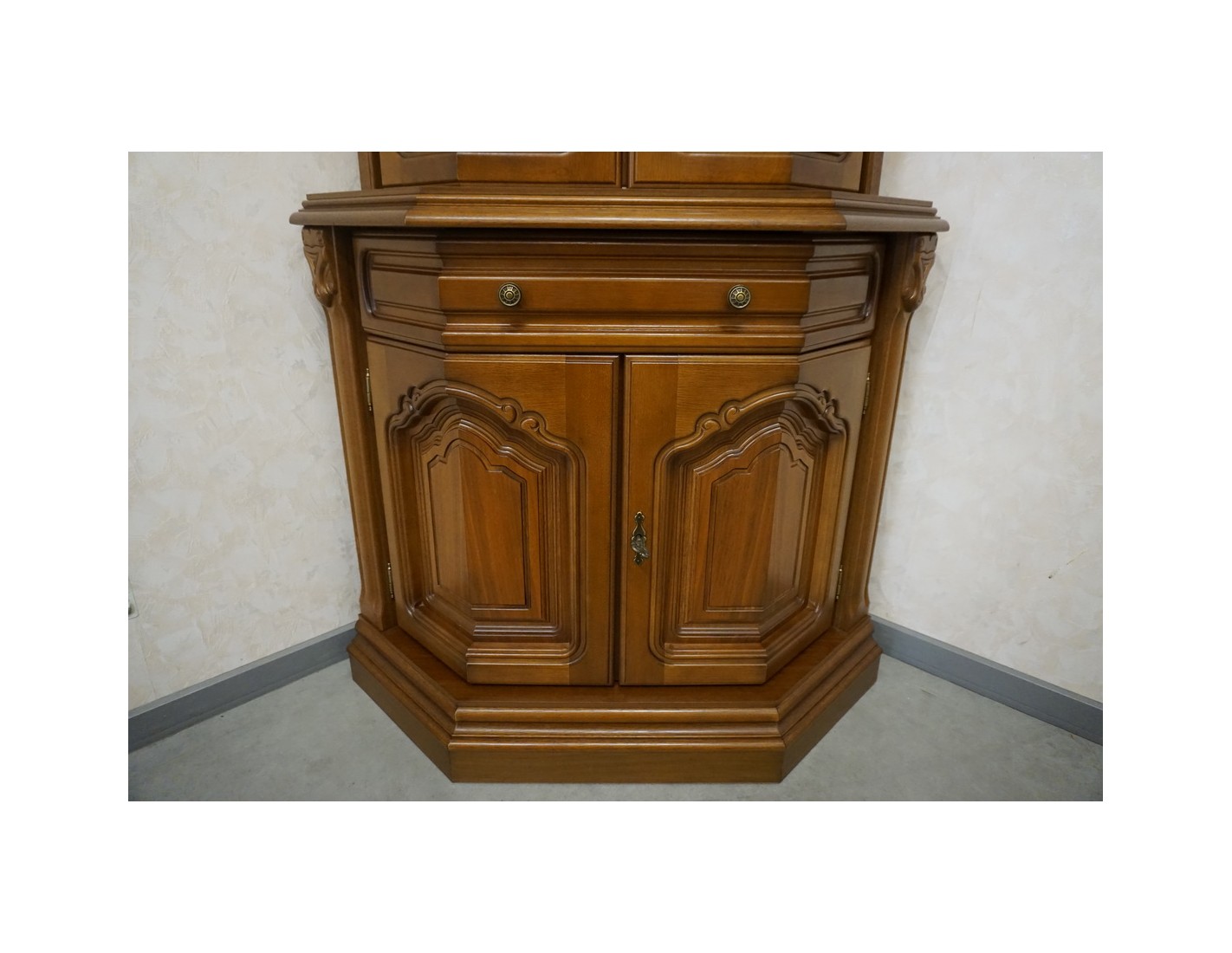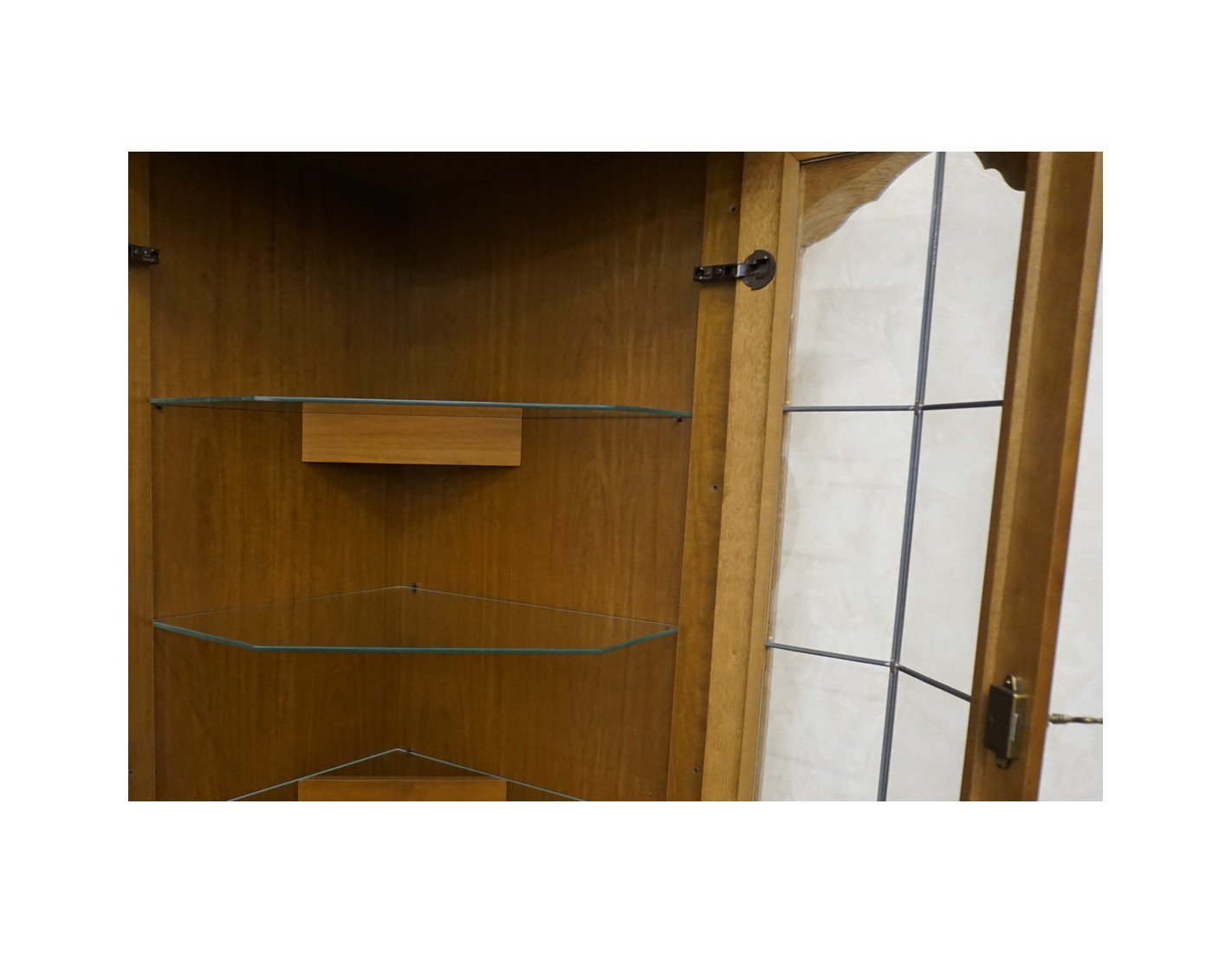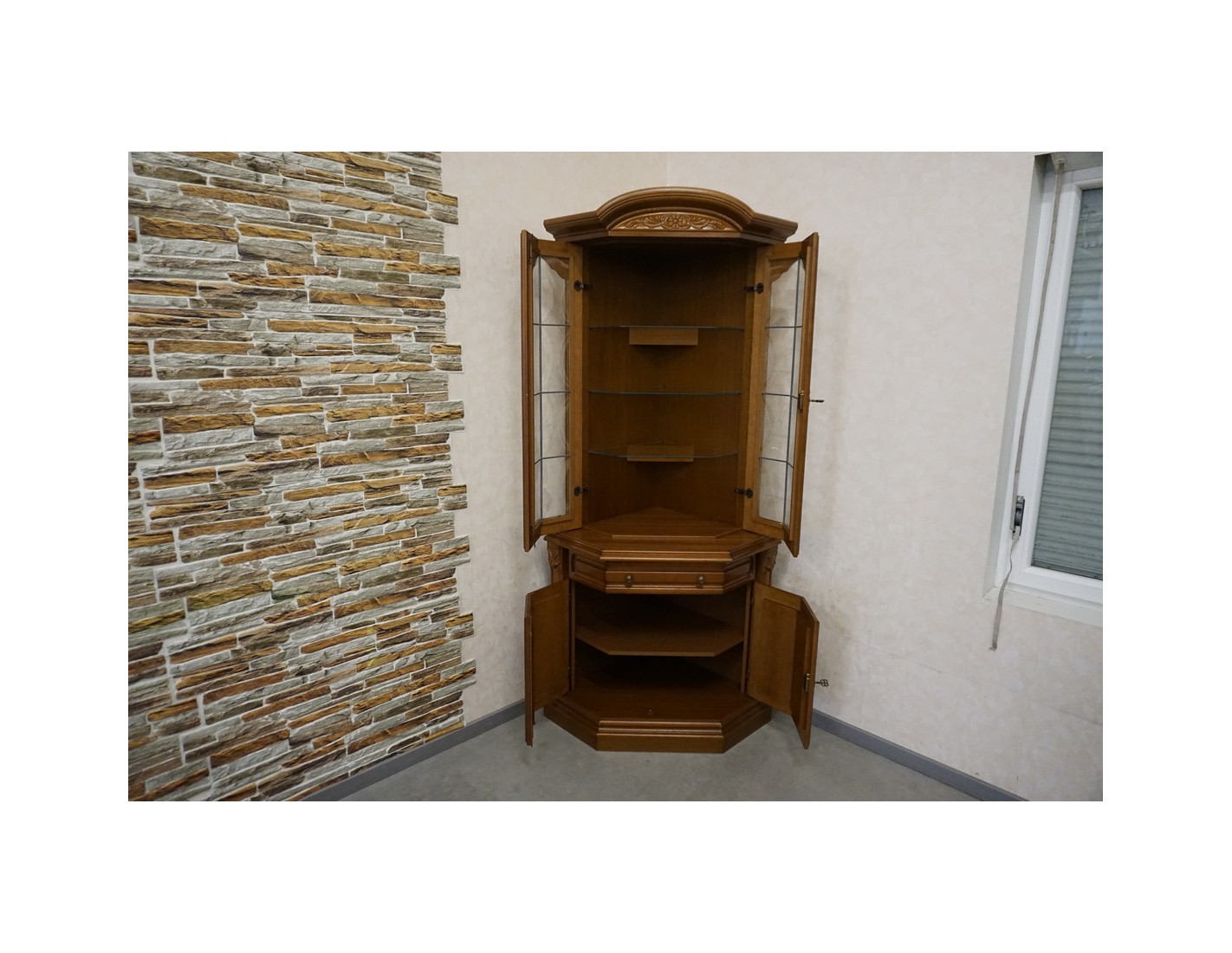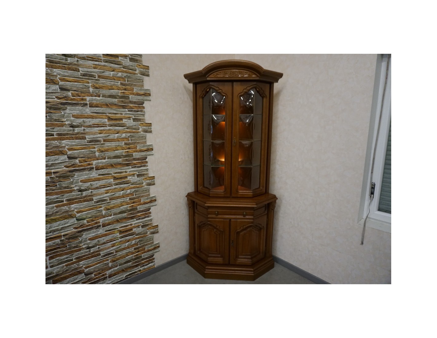 Elegancka witryna narożna w kolorze orzecha, wyposażona w podświetlenie, które efektownie eksponuje zawartość. Idealna do salonu, jadalni lub gabinetu, doskonale sprawdzi się do przechowywania dekoracji, szkła lub książek.