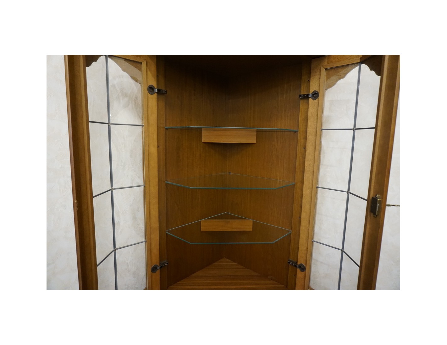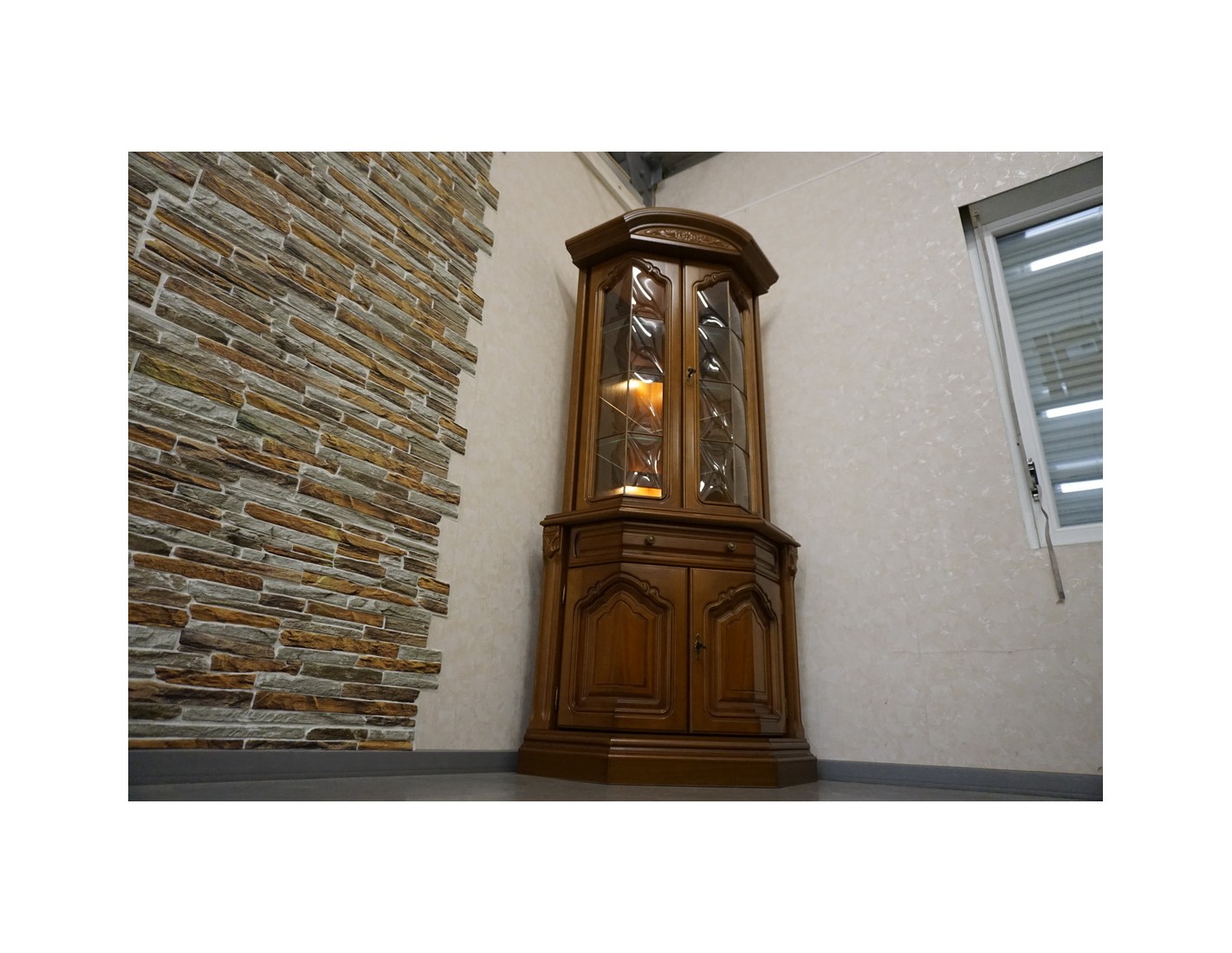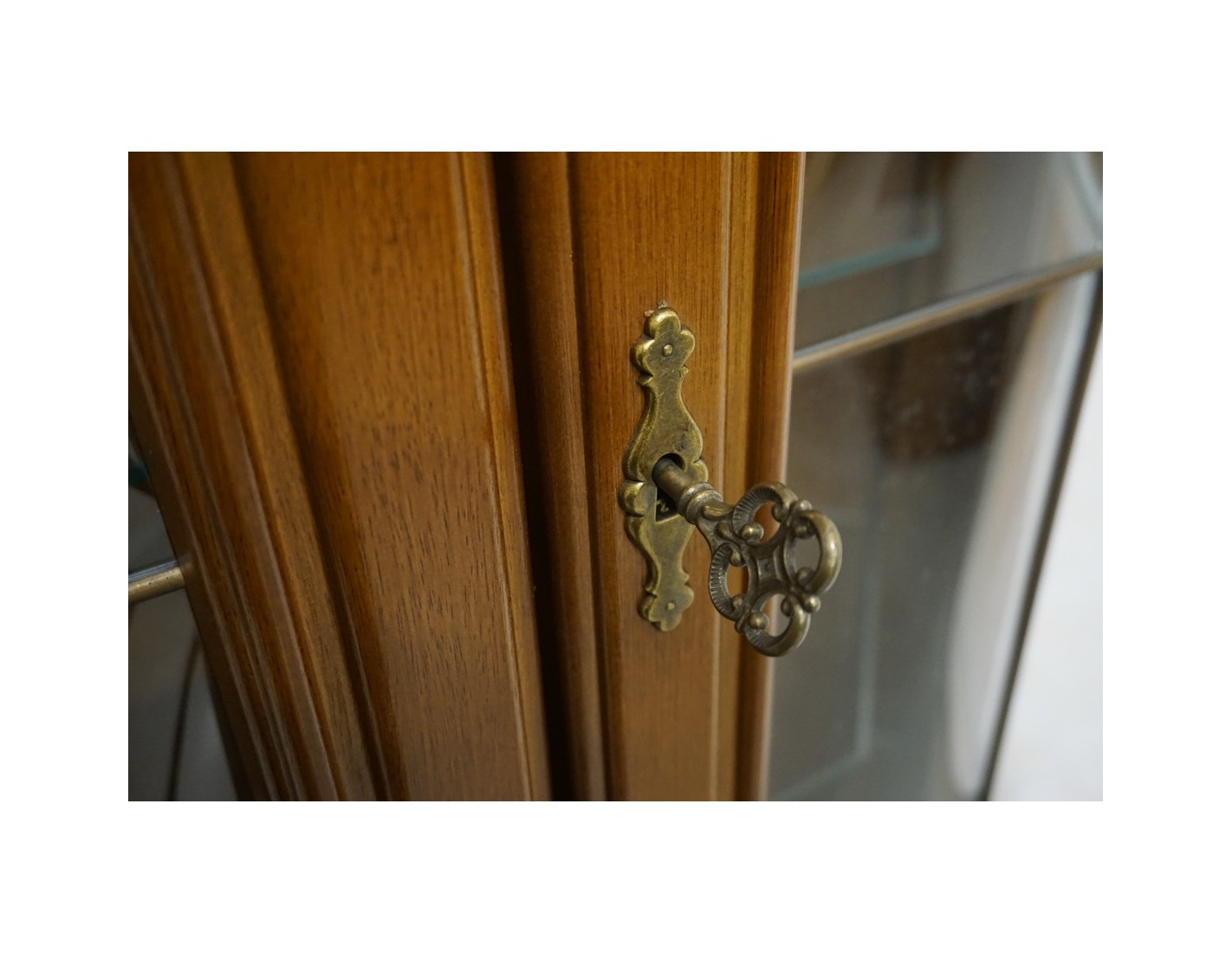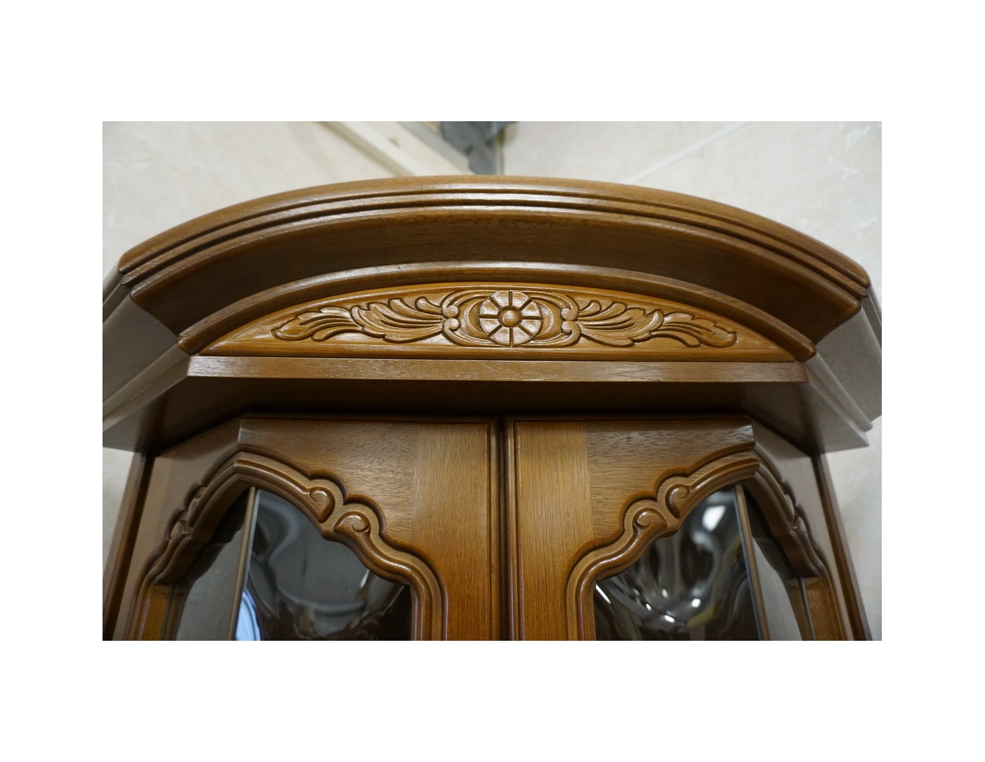 Elegancka witryna narożna w kolorze orzecha, wyposażona w podświetlenie, które efektownie eksponuje zawartość. Idealna do salonu, jadalni lub gabinetu, doskonale sprawdzi się do przechowywania dekoracji, szkła lub książek.