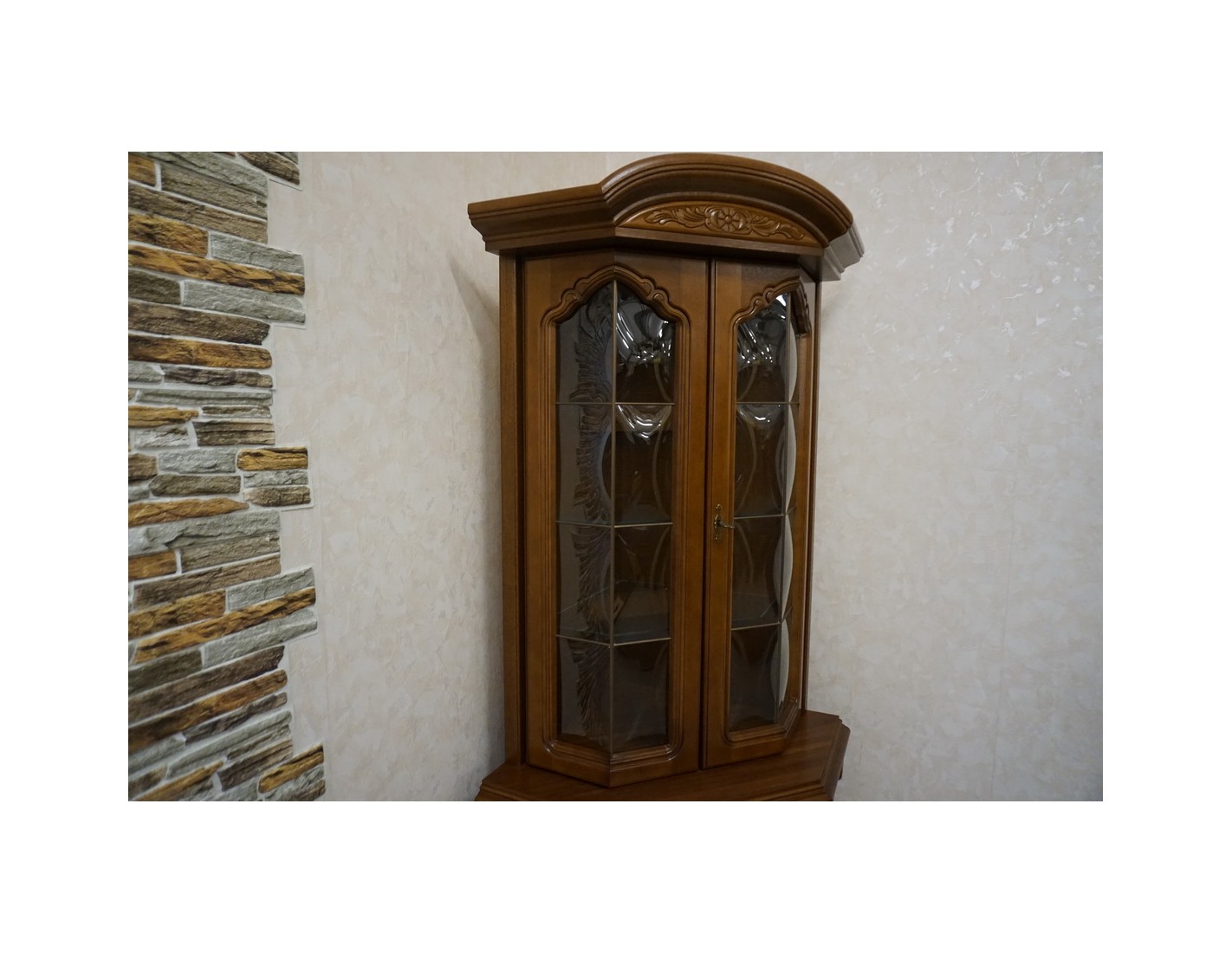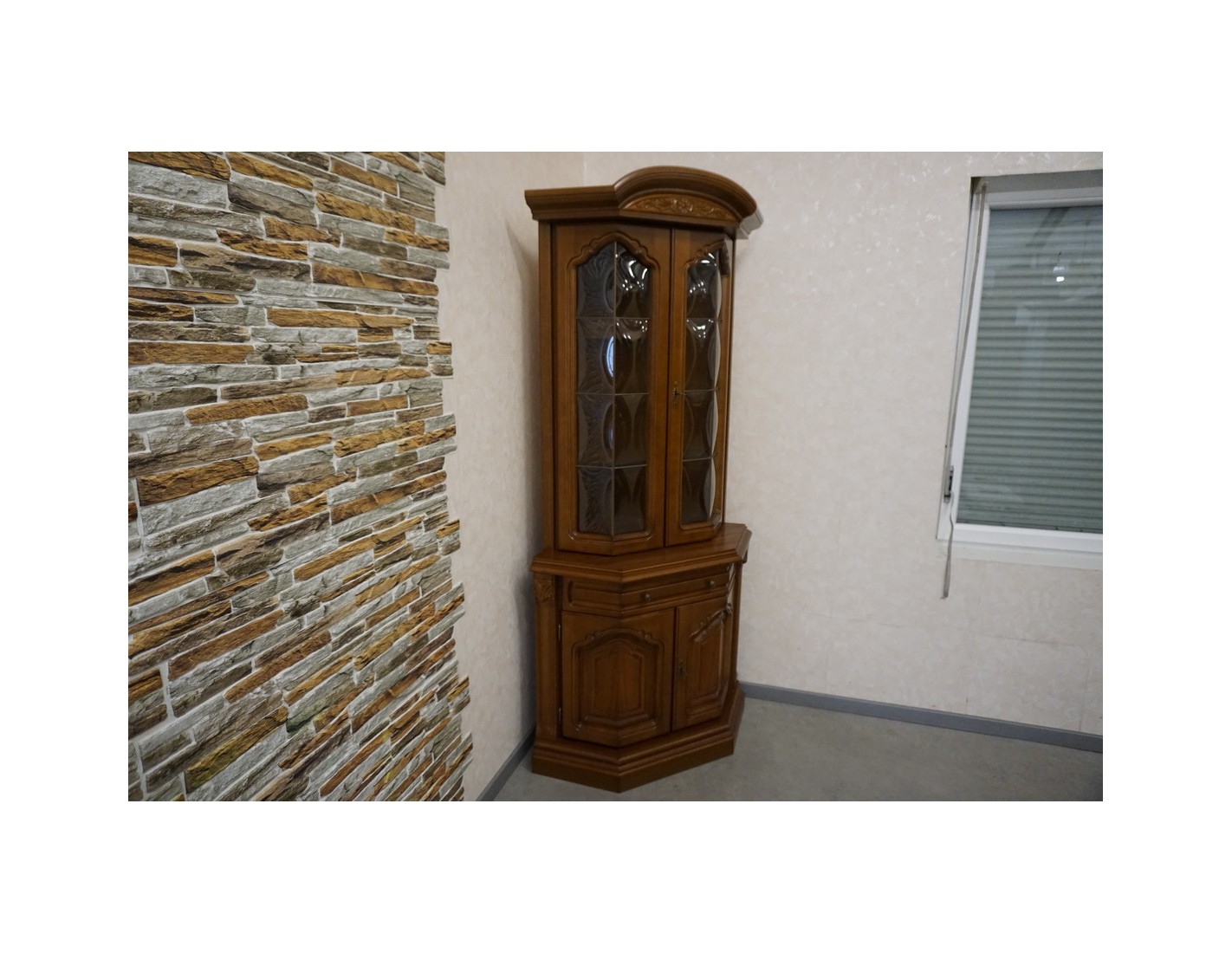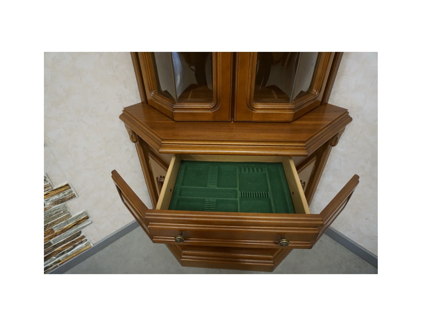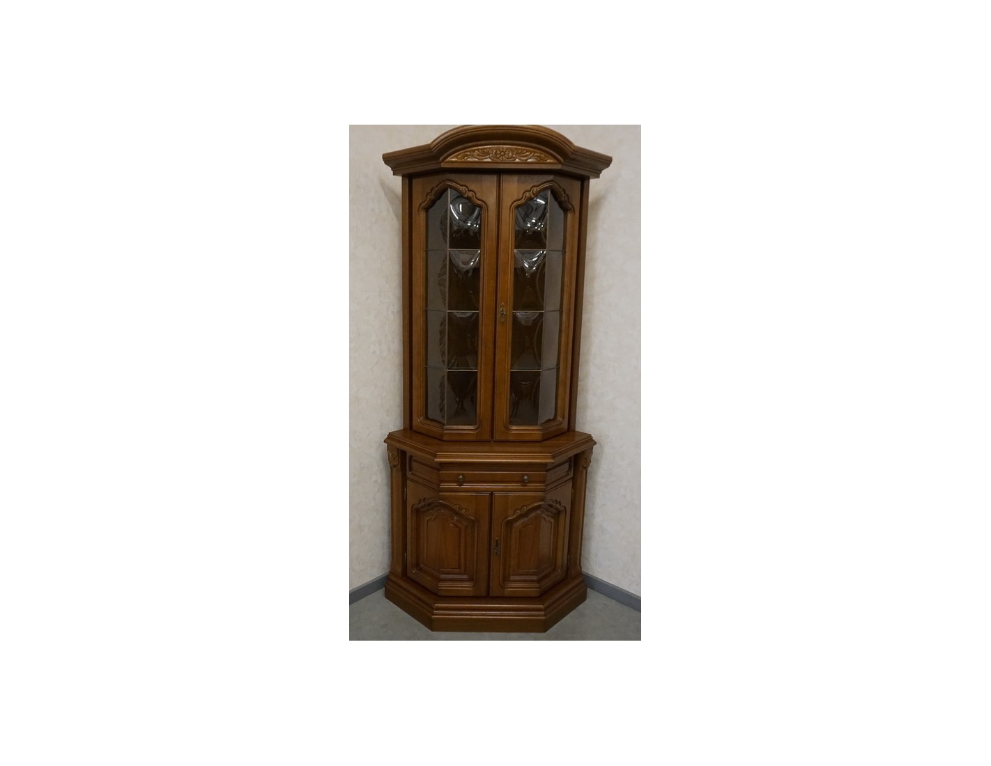 Elegancka witryna narożna w kolorze orzecha, wyposażona w podświetlenie, które efektownie eksponuje zawartość. Idealna do salonu, jadalni lub gabinetu, doskonale sprawdzi się do przechowywania dekoracji, szkła lub książek.