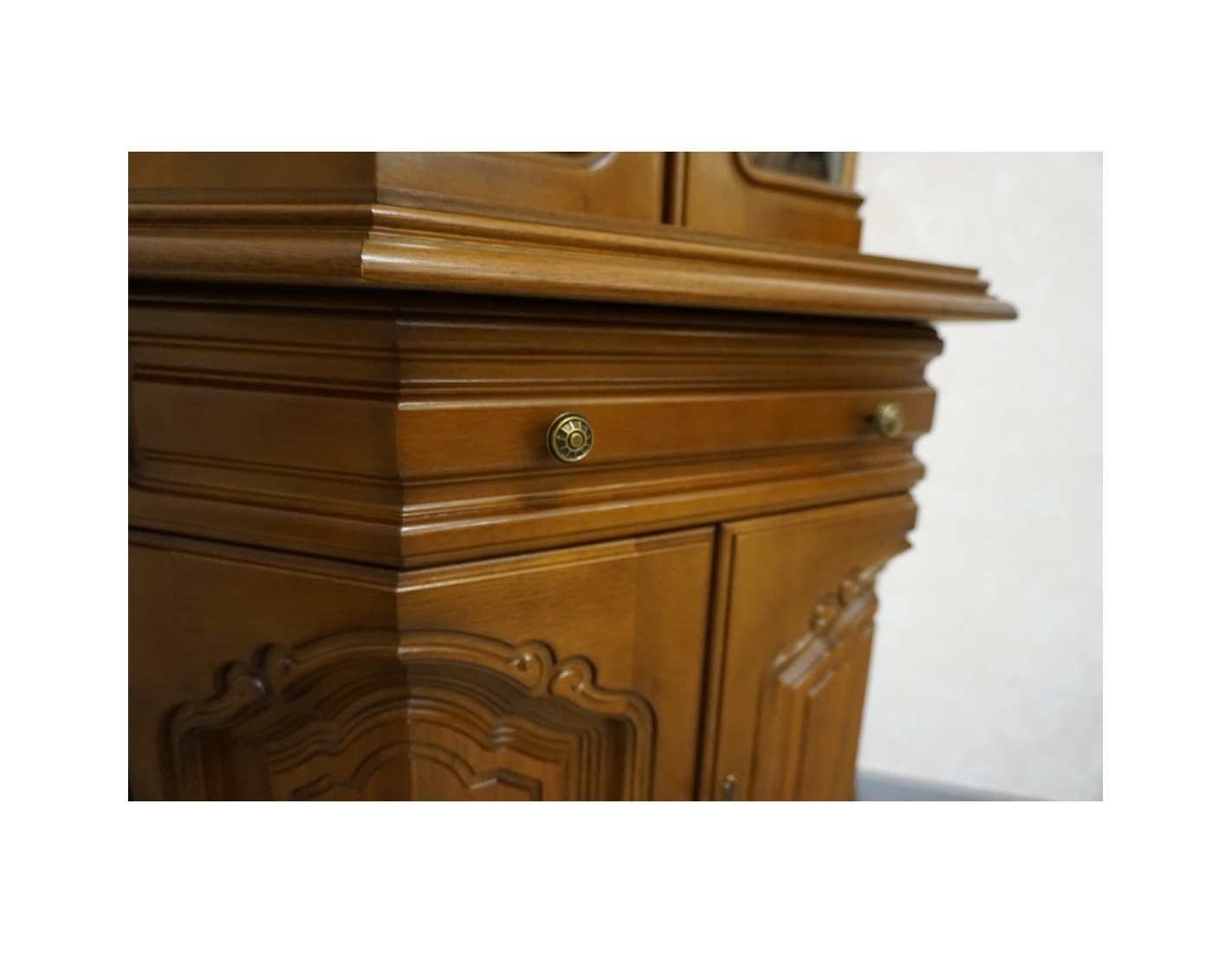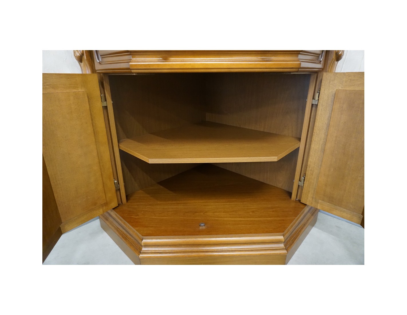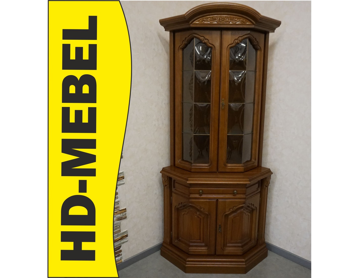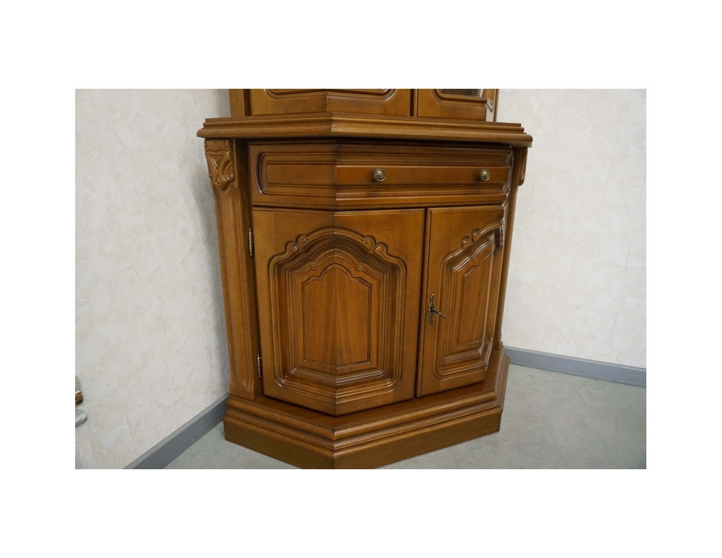 Elegancka witryna narożna w kolorze orzecha, wyposażona w podświetlenie, które efektownie eksponuje zawartość. Idealna do salonu, jadalni lub gabinetu, doskonale sprawdzi się do przechowywania dekoracji, szkła lub książek.