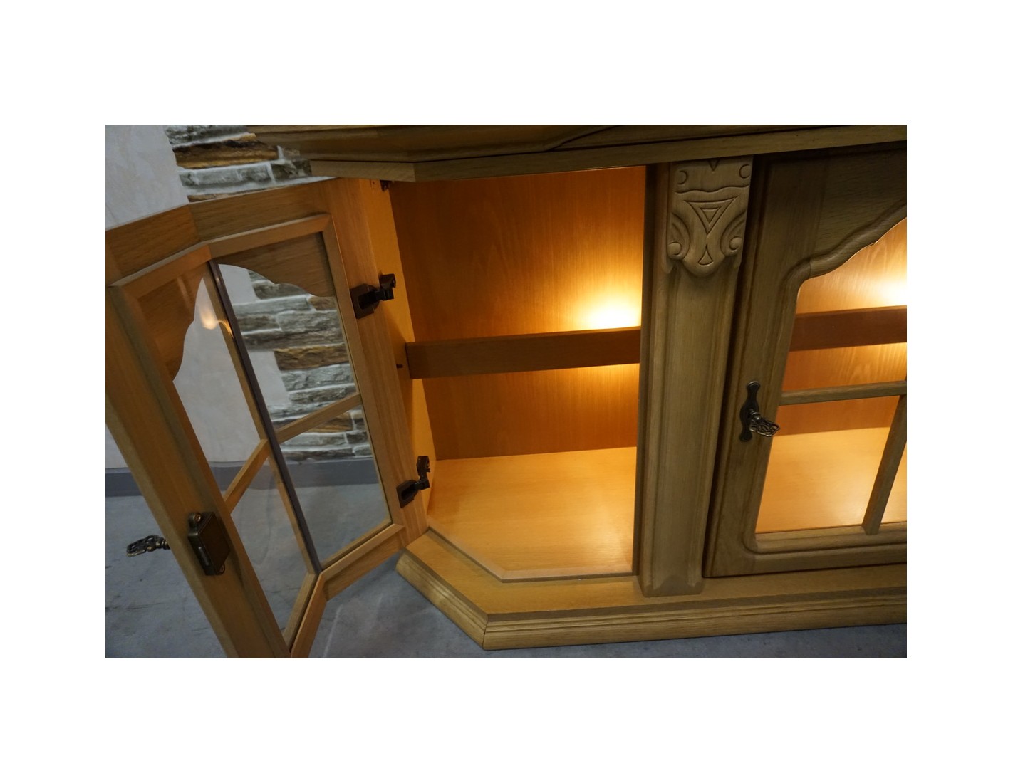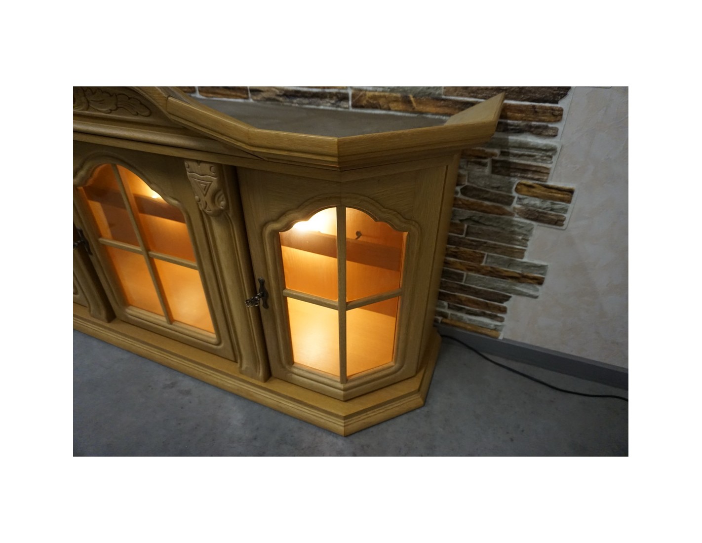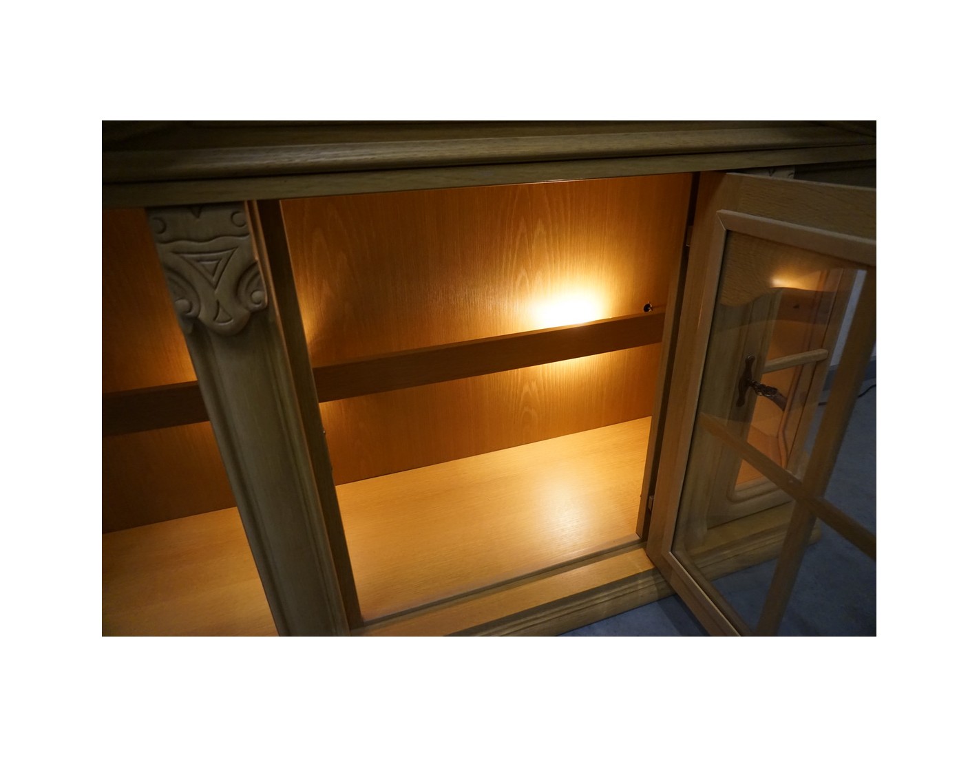 Witrynka doskonale pasuje do salonu, jadalni lub gabinetu, dodając przestrzeni lekkości i elegancji. Jasny dąb w połączeniu z podświetleniem podkreśla piękno przechowywanych przedmiotów.