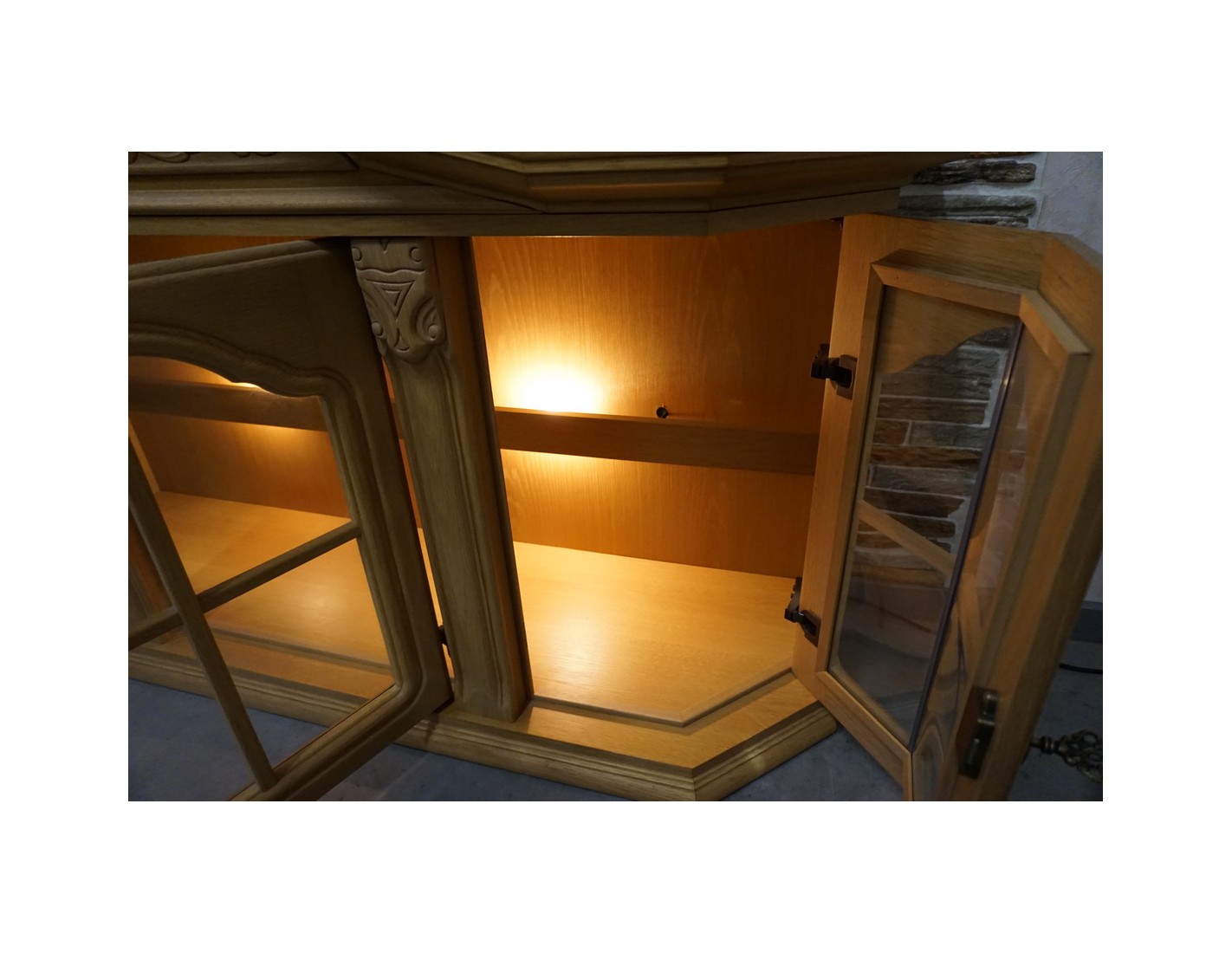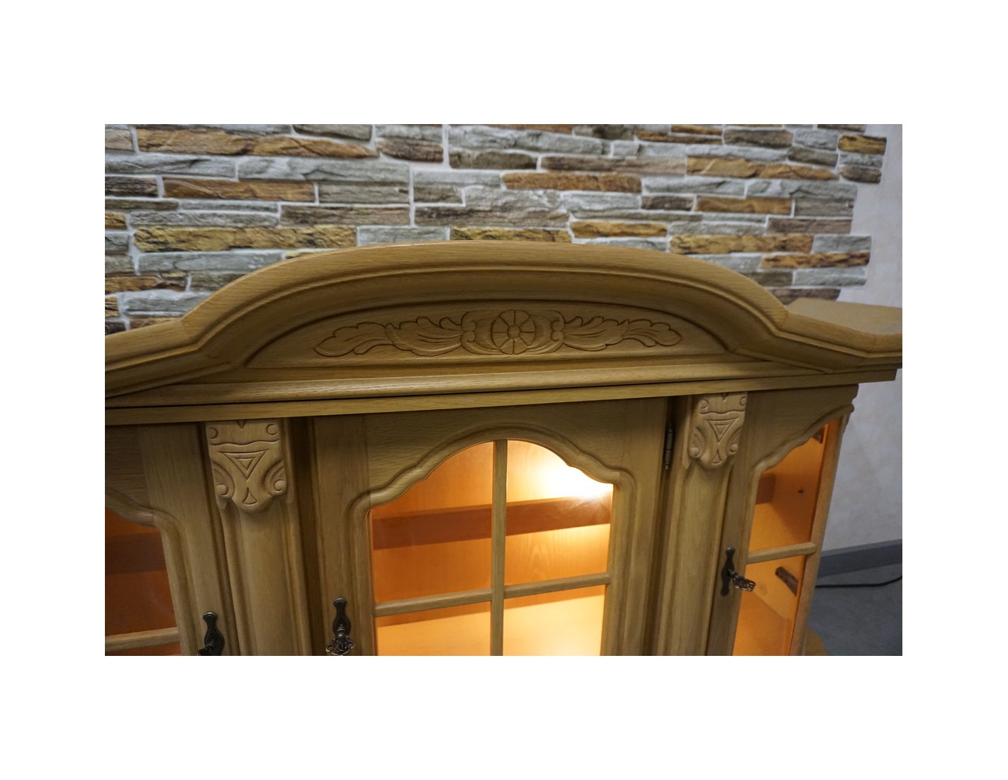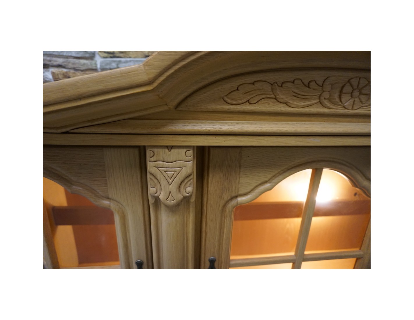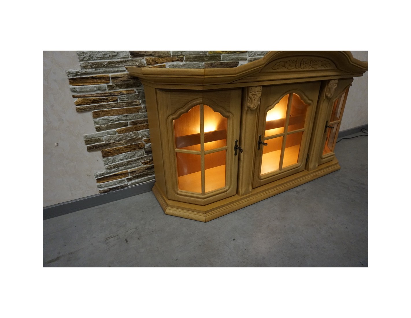 Witrynka doskonale pasuje do salonu, jadalni lub gabinetu, dodając przestrzeni lekkości i elegancji. Jasny dąb w połączeniu z podświetleniem podkreśla piękno przechowywanych przedmiotów.