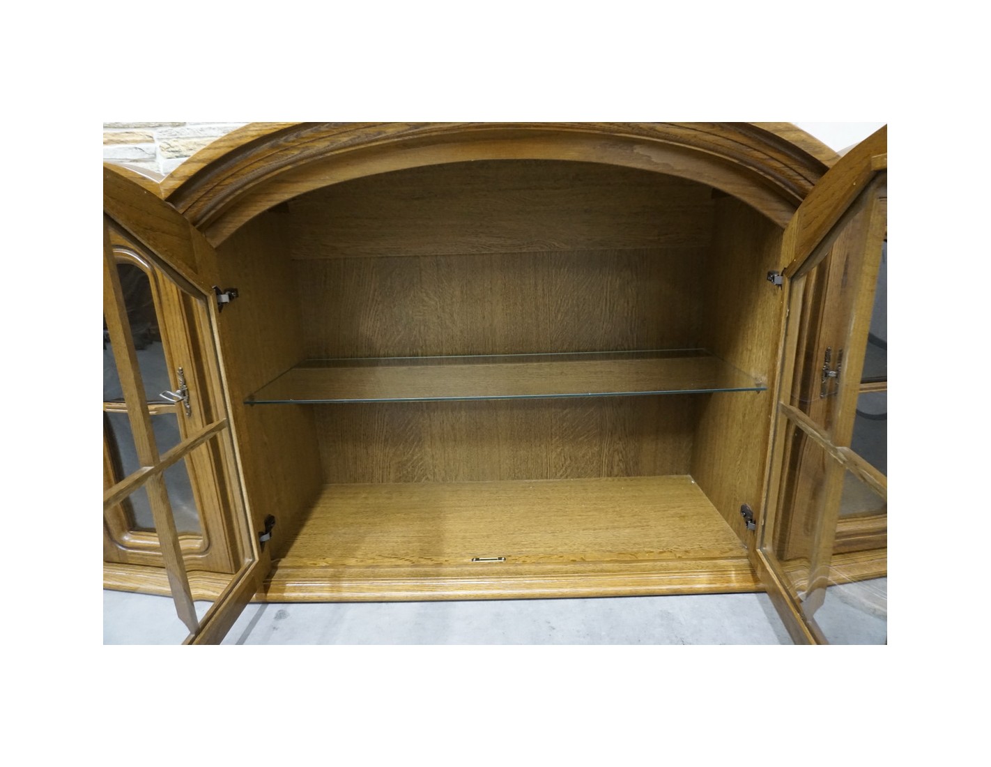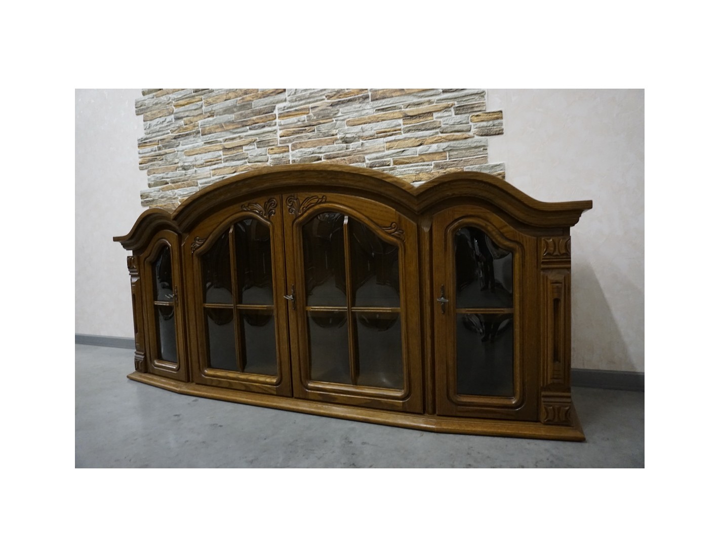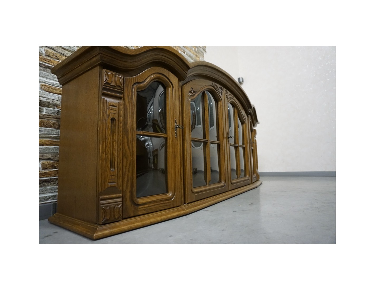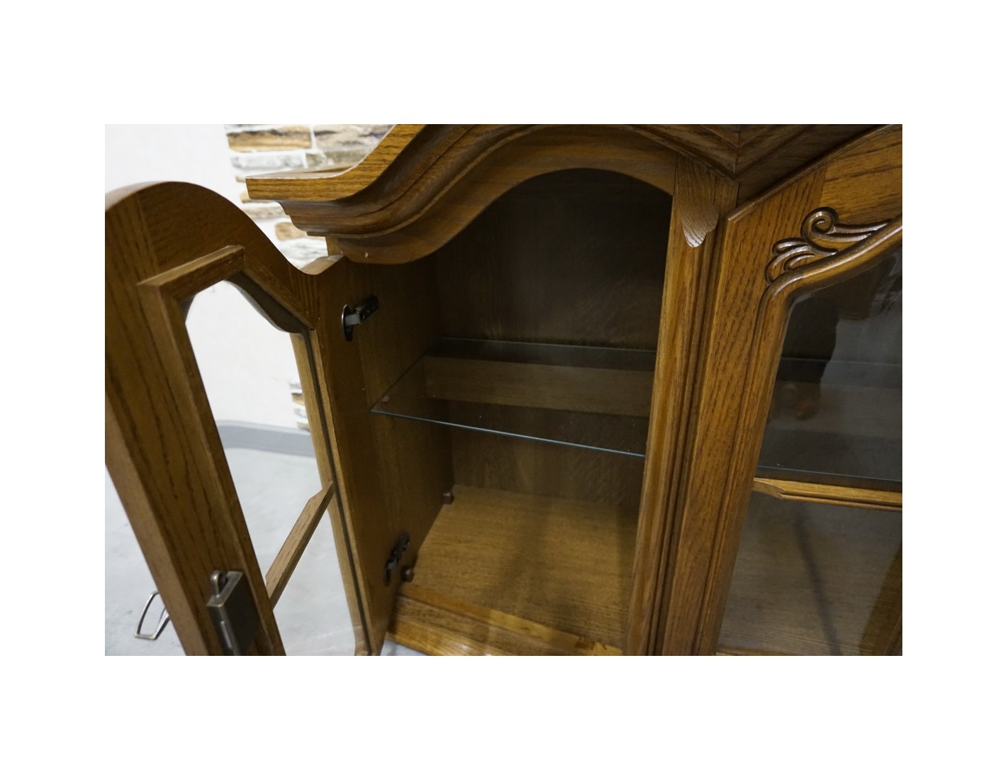 Elegancka i funkcjonalna witrynka wisząca wykonana z dębu, idealna do salonu, jadalni lub kuchni. Dzięki większej szerokości oferuje dużo miejsca do przechowywania i estetycznej ekspozycji szkła, porcelany lub dekoracji.