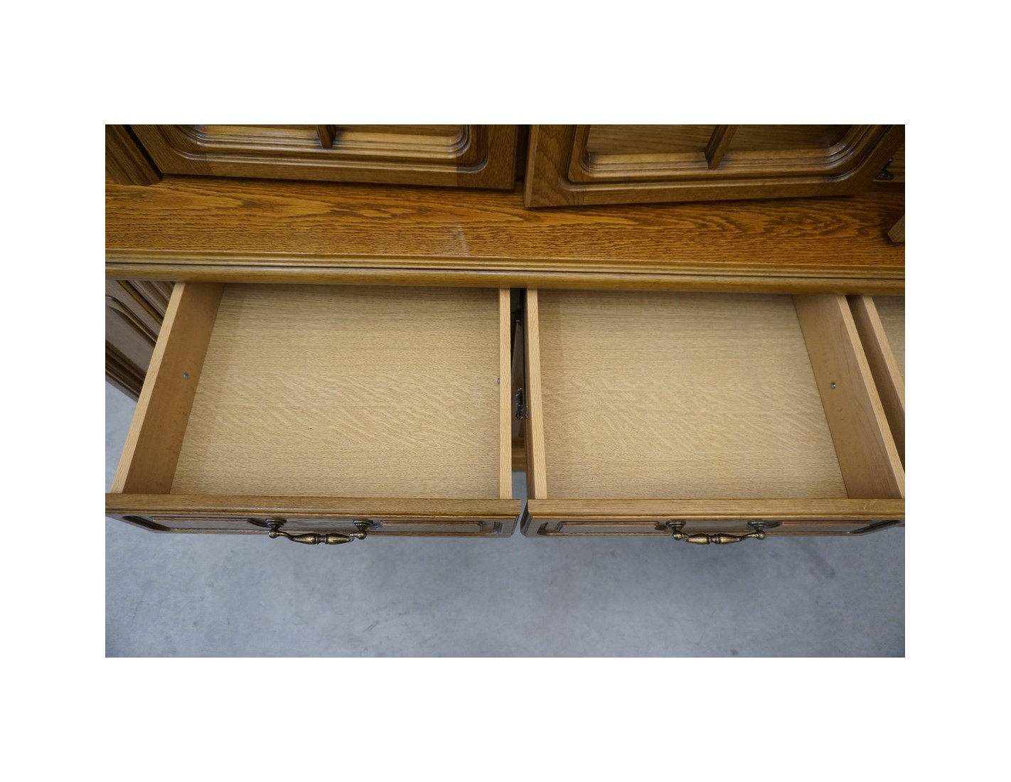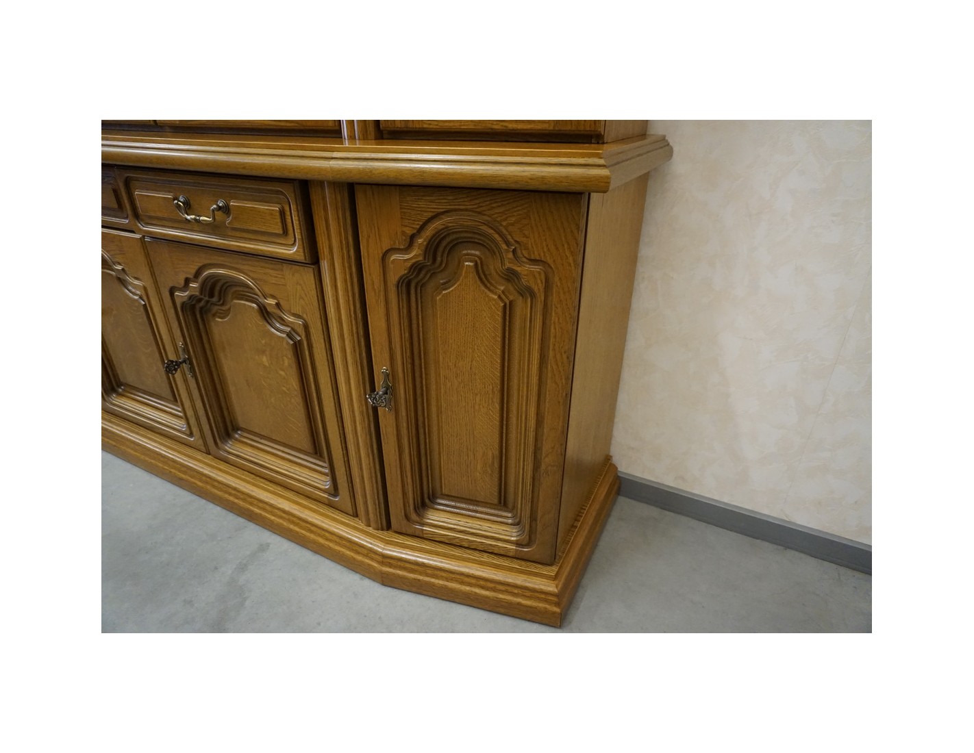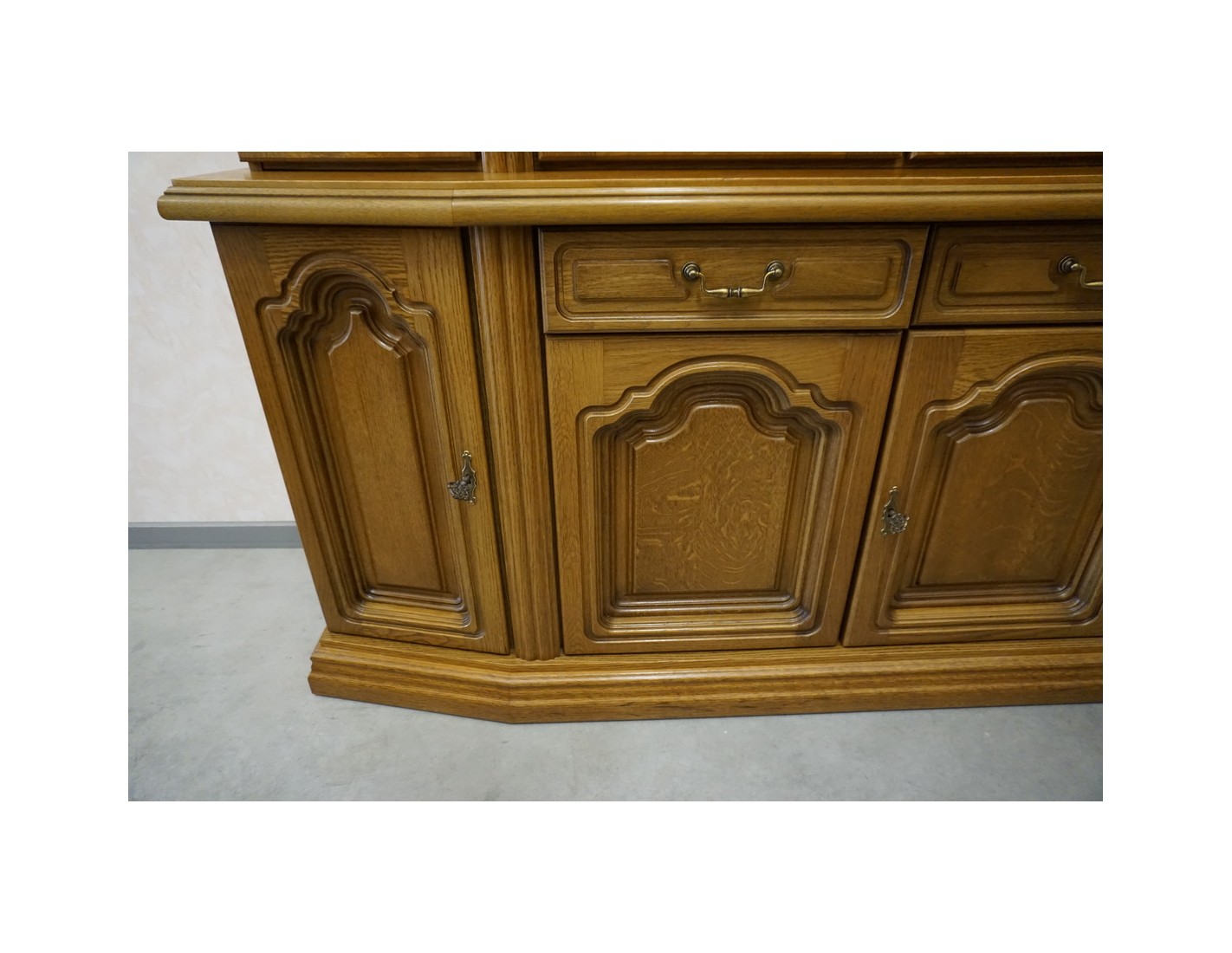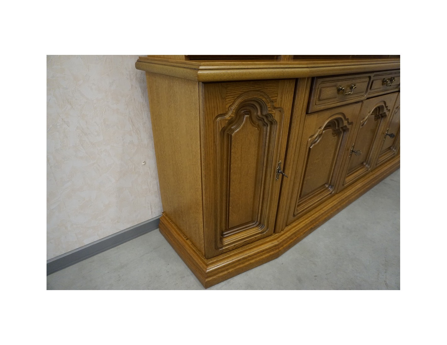 TA DUŻA WITRYNA Z KOMODĄ DĘBOWA TO PRAWDZIWA PERŁA WNĘTRZA, ŁĄCZĄCA W SOBIE FUNKCJONALNOŚĆ Z WYRAFINOWANYM STYLEM. O SZEROKOŚCI 219 CM, GŁĘBOKOŚCI 47 CM I IMPONUJĄCEJ WYSOKOŚCI 201 CM, TA WITRYNA OFERUJE OBFITOŚĆ PRZESTRZENI DO PRZECHOWYWANIA I EKSPONOWANIA RÓŻNORODNYCH PRZEDMIOTÓW.