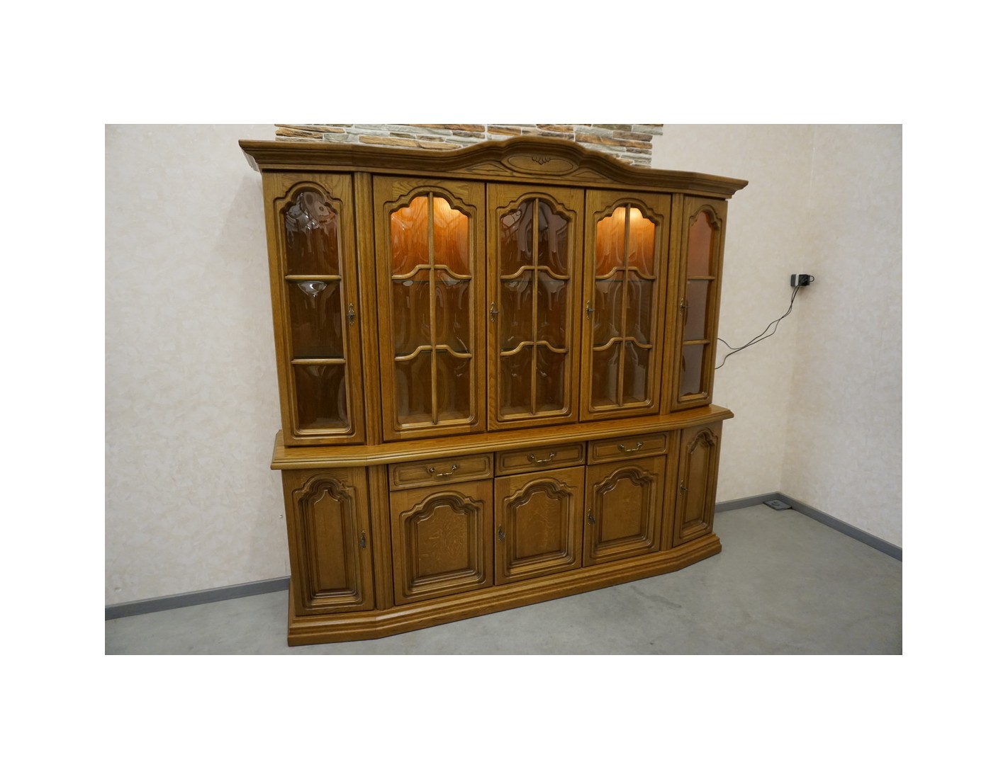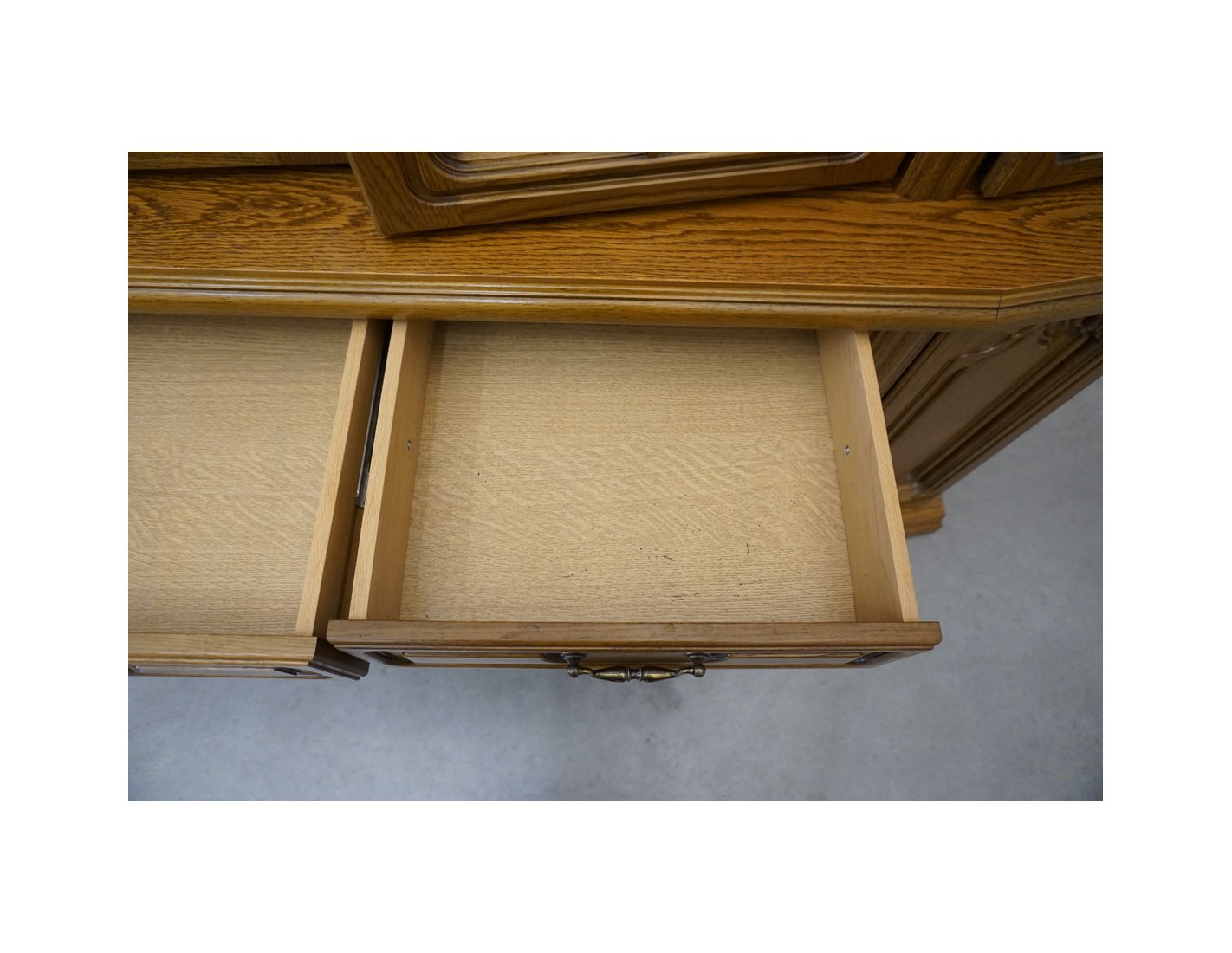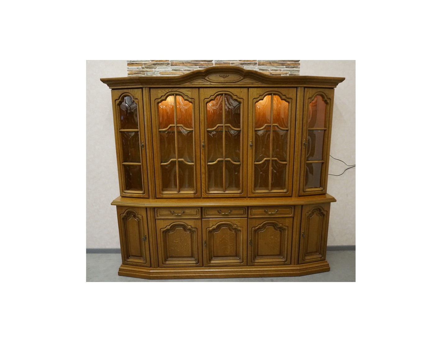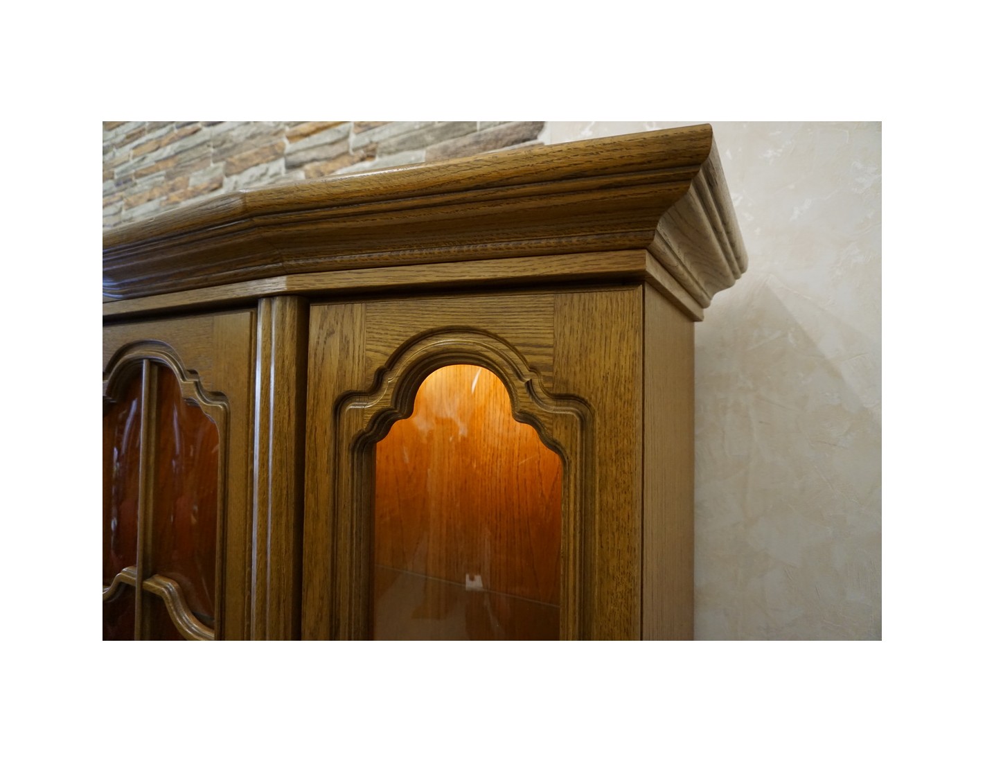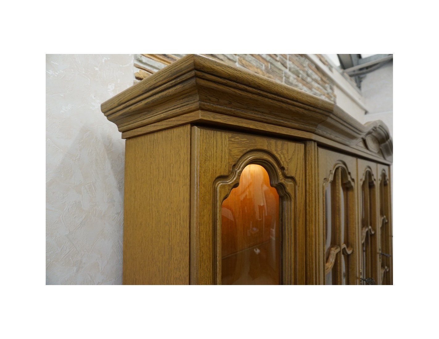 TA DUŻA WITRYNA Z KOMODĄ DĘBOWA TO PRAWDZIWA PERŁA WNĘTRZA, ŁĄCZĄCA W SOBIE FUNKCJONALNOŚĆ Z WYRAFINOWANYM STYLEM. O SZEROKOŚCI 219 CM, GŁĘBOKOŚCI 47 CM I IMPONUJĄCEJ WYSOKOŚCI 201 CM, TA WITRYNA OFERUJE OBFITOŚĆ PRZESTRZENI DO PRZECHOWYWANIA I EKSPONOWANIA RÓŻNORODNYCH PRZEDMIOTÓW.
