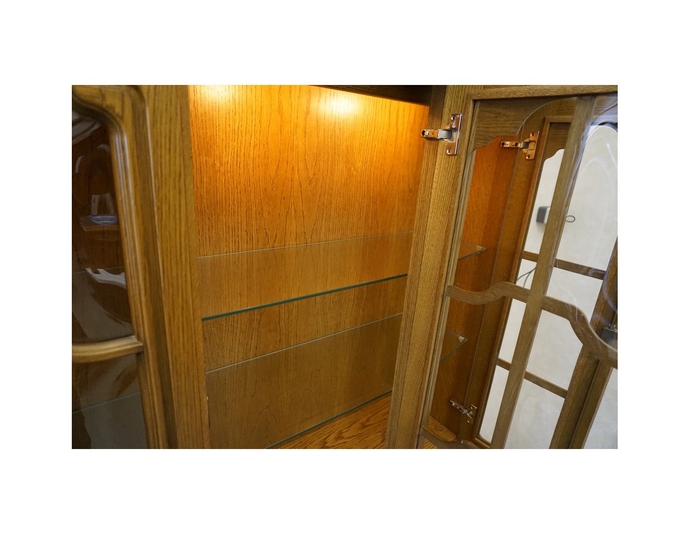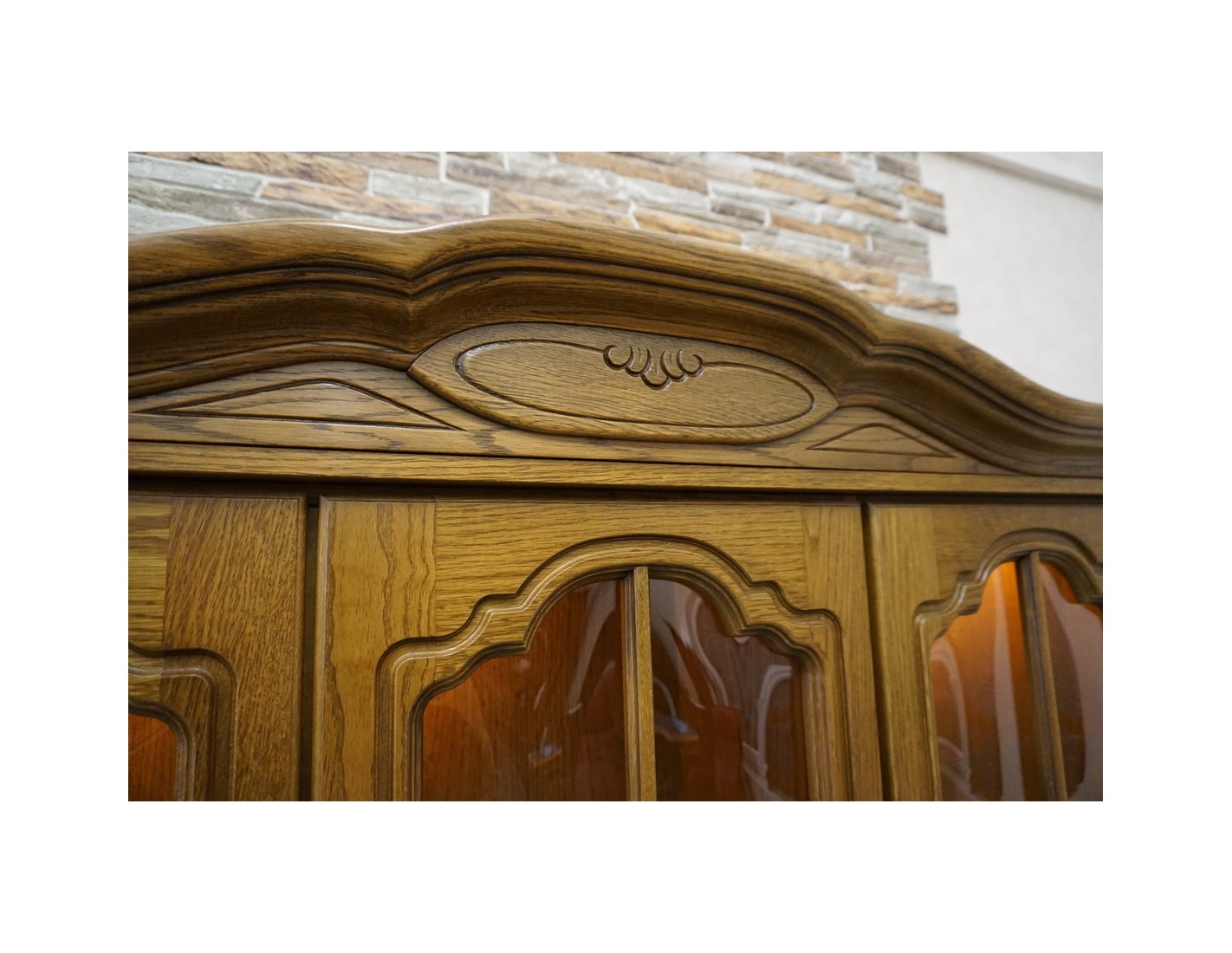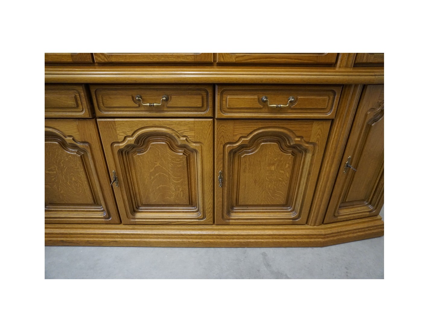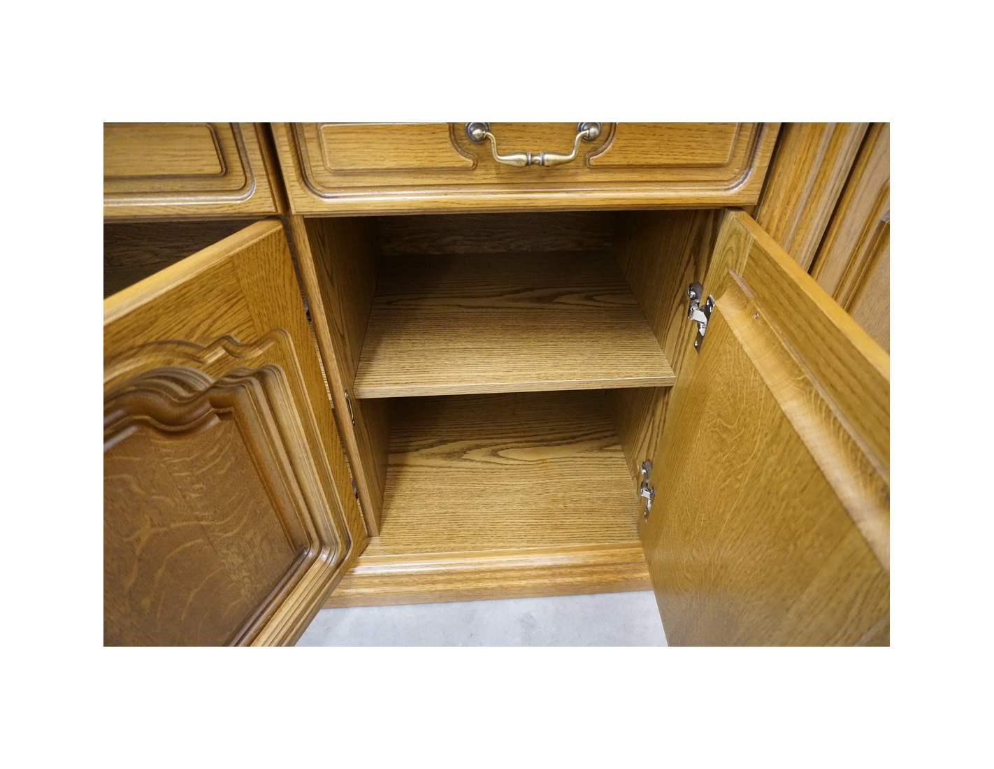 TA DUŻA WITRYNA Z KOMODĄ DĘBOWA TO PRAWDZIWA PERŁA WNĘTRZA, ŁĄCZĄCA W SOBIE FUNKCJONALNOŚĆ Z WYRAFINOWANYM STYLEM. O SZEROKOŚCI 219 CM, GŁĘBOKOŚCI 47 CM I IMPONUJĄCEJ WYSOKOŚCI 201 CM, TA WITRYNA OFERUJE OBFITOŚĆ PRZESTRZENI DO PRZECHOWYWANIA I EKSPONOWANIA RÓŻNORODNYCH PRZEDMIOTÓW.