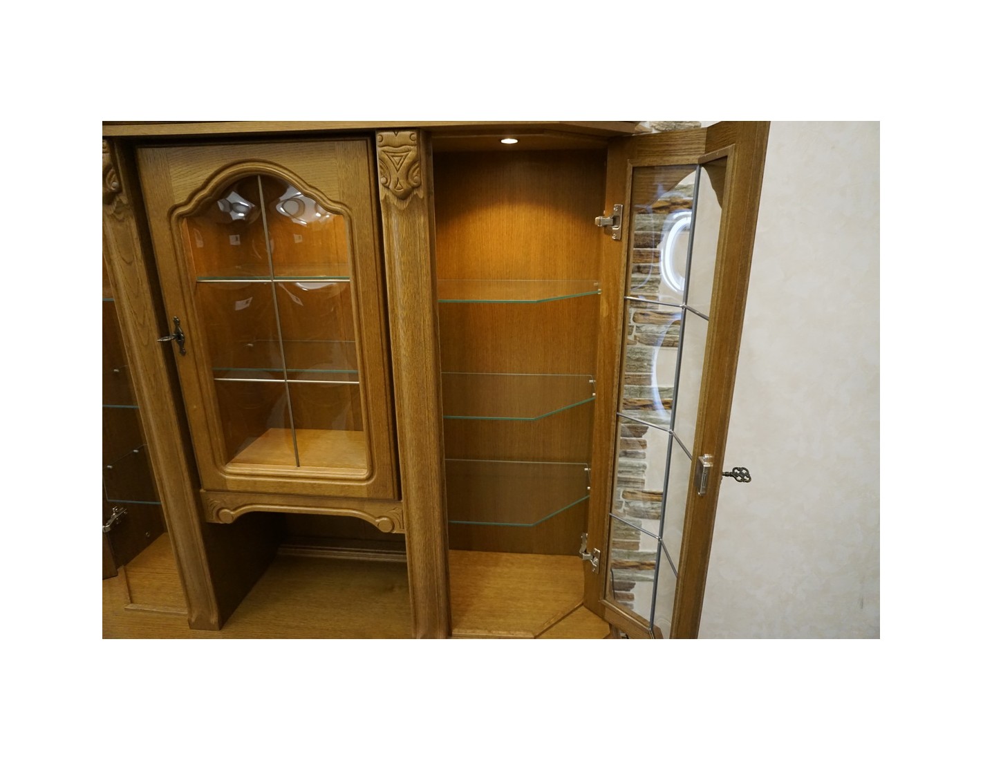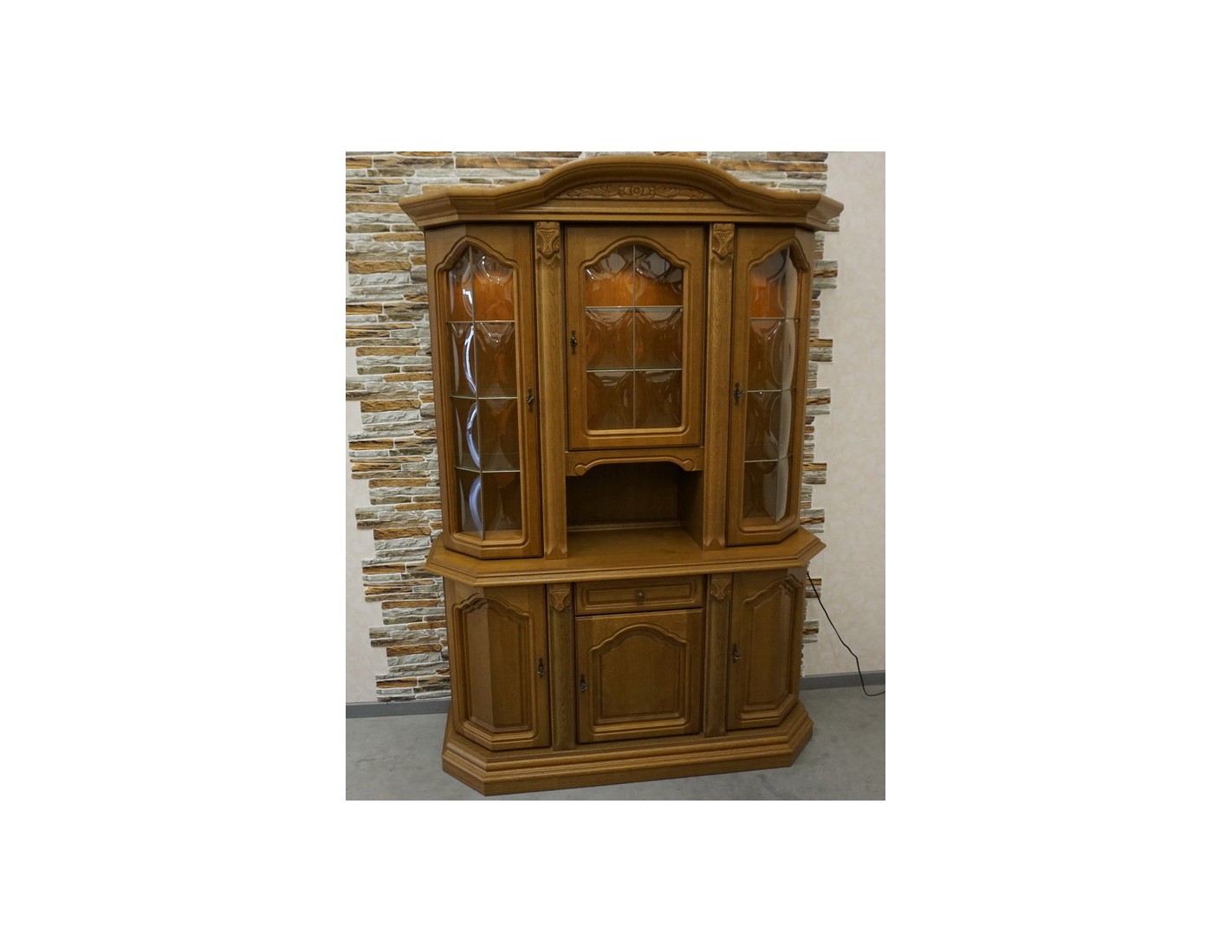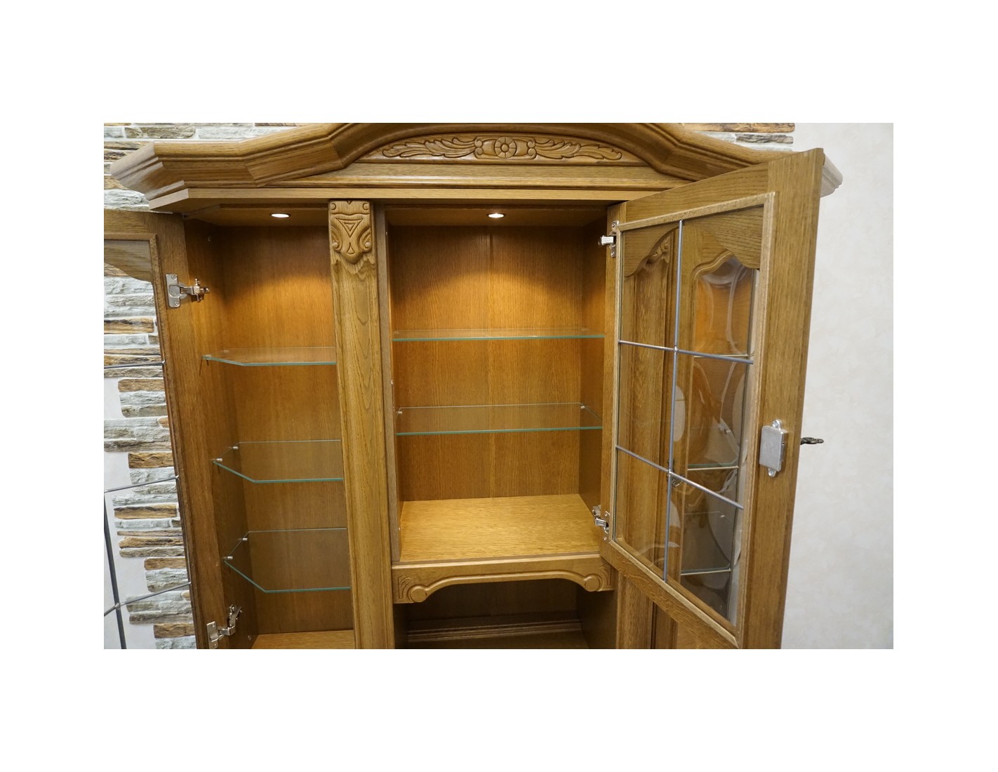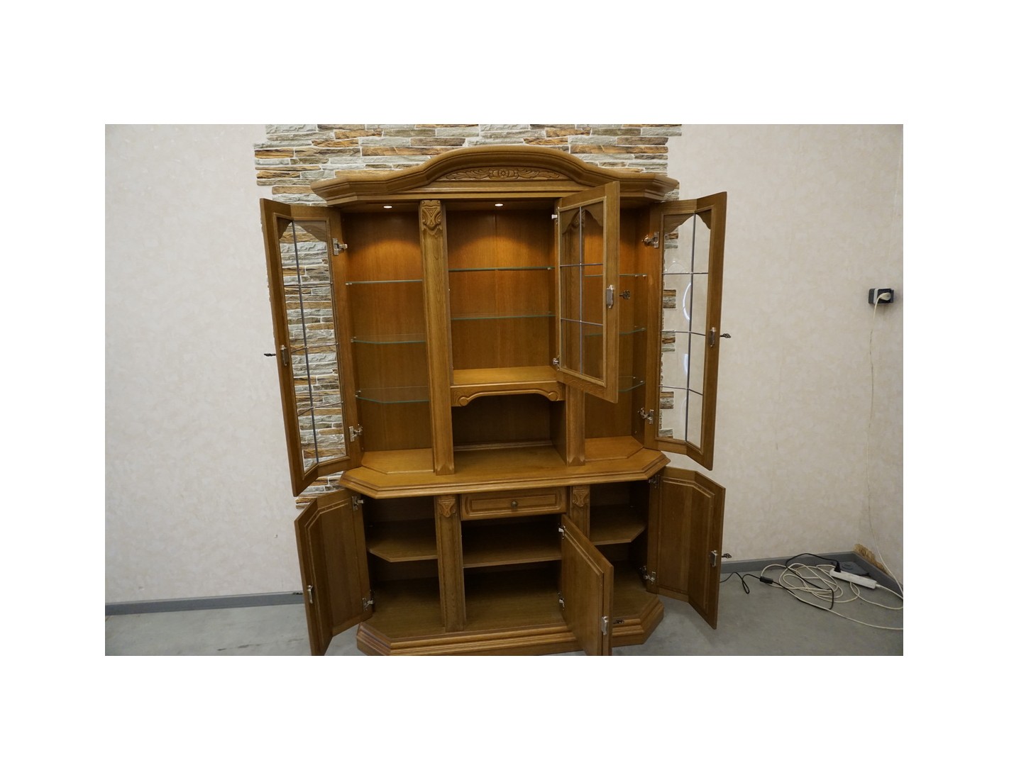 WITRYNA Z KOMODĄ, PODŚWIETLANA, O SZEROKOŚCI 145 CM, GŁĘBOKOŚCI 49 CM I WYSOKOŚCI 205 CM, TO ELEGANCKI I FUNKCJONALNY ELEMENT WYSTROJU WNĘTRZA. SZKLANE PÓŁKI W GÓRNEJ CZĘŚCI DODAJĄ LEKKOŚCI I POZWALAJĄ NA WYEKSPONOWANIE PRZECHOWYWANYCH PRZEDMIOTÓW. DODATKOWO, NA OSTATNIM ZDJĘCIU ZNAJDUJE SIĘ DRUGA WITRYNA PASUJĄCA DO TEJ, CO ZAPEWNIA MOŻLIWOŚĆ STWORZENIA SPÓJNEGO I HARMONIJNEGO ARANŻU W POMIESZCZENIU.