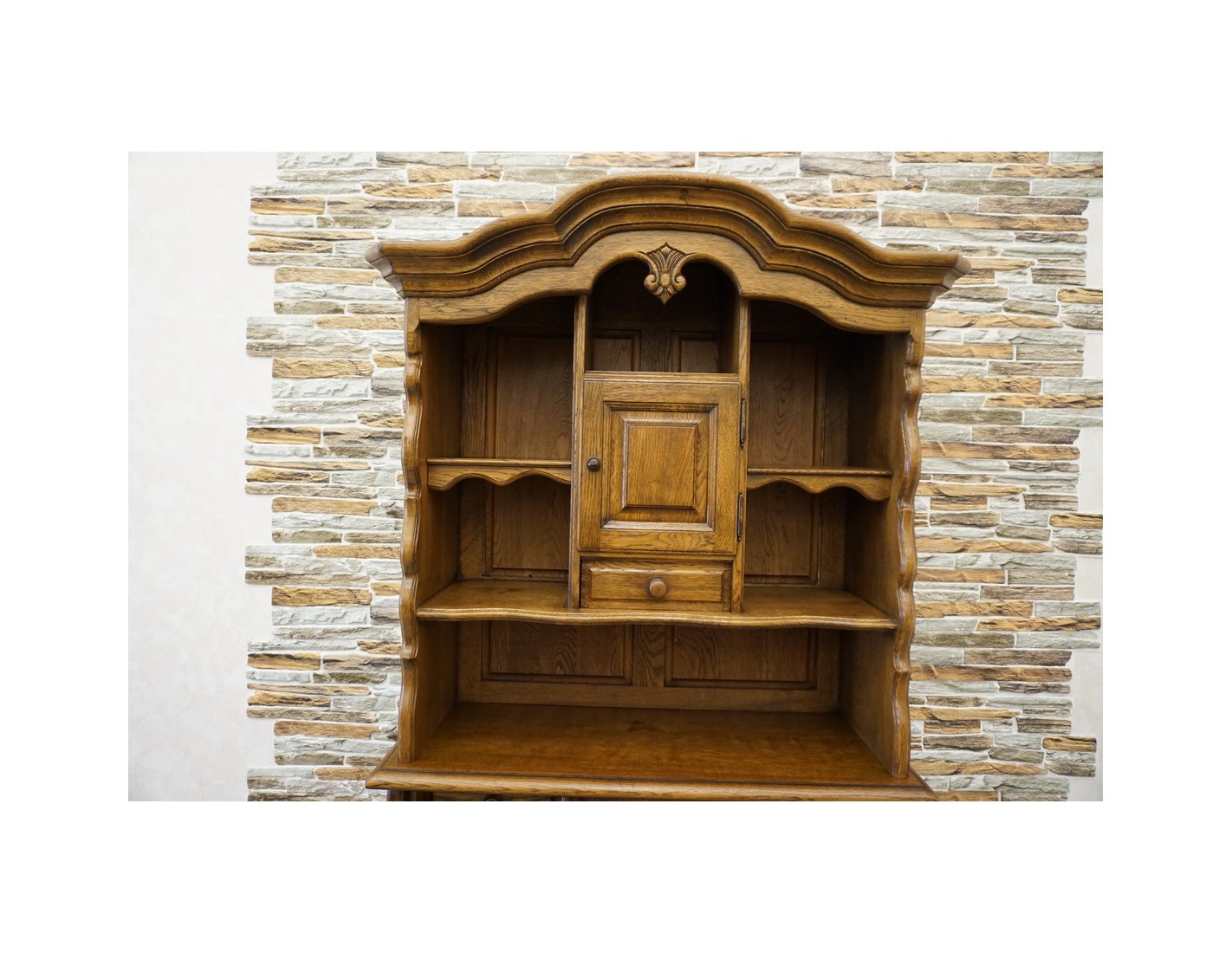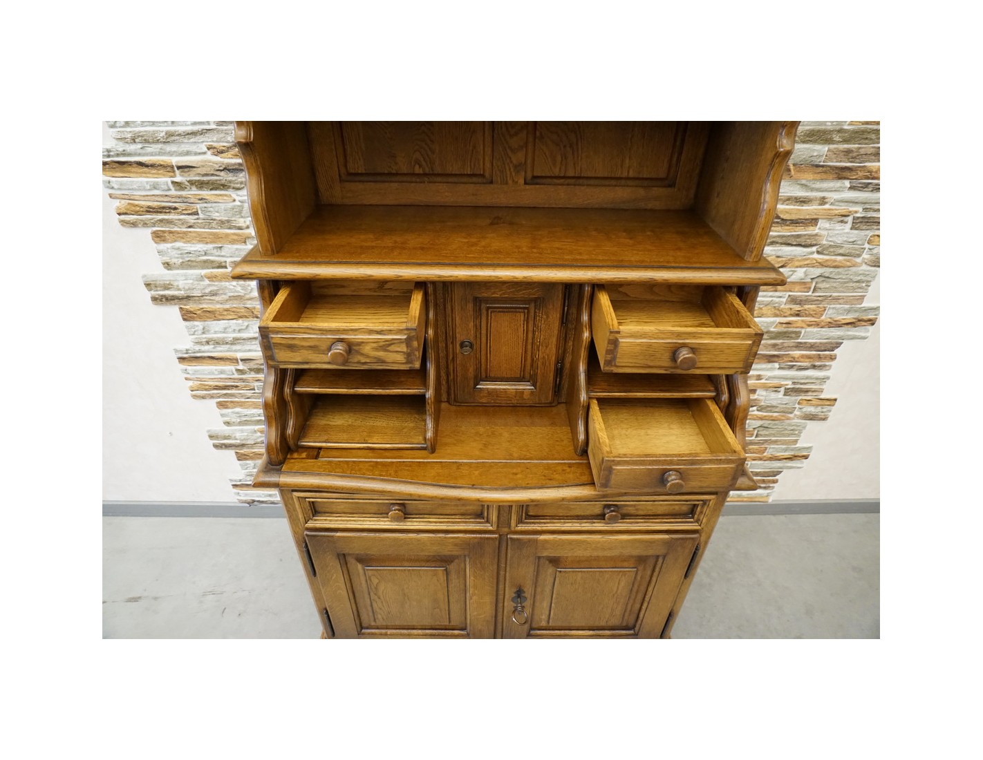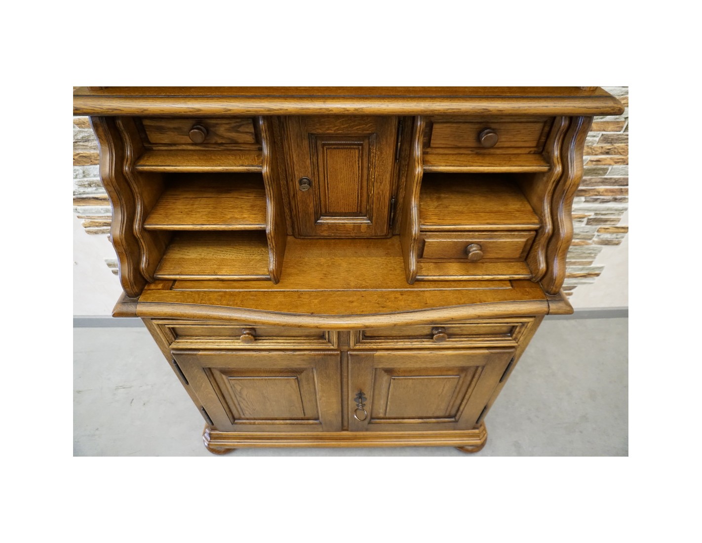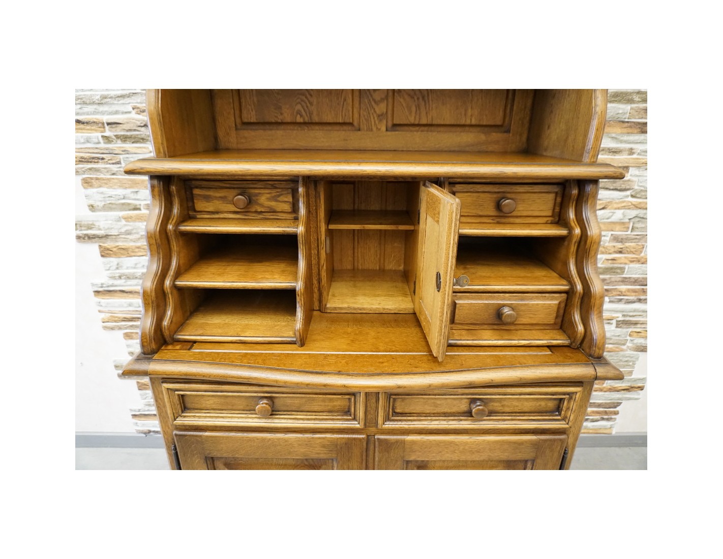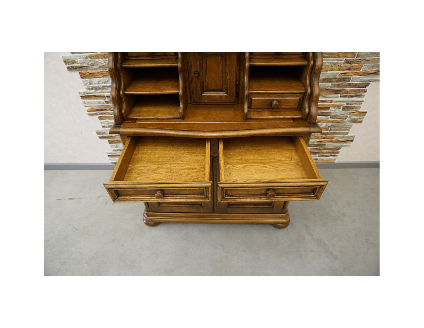 Piękny dębowy sekretarzyk z nadstawką, który łączy funkcjonalność z elegancją. Idealny do gabinetu, salonu lub sypialni. Wyposażony w liczne szufladki i półki, co umożliwia wygodne przechowywanie i organizację przedmiotów.