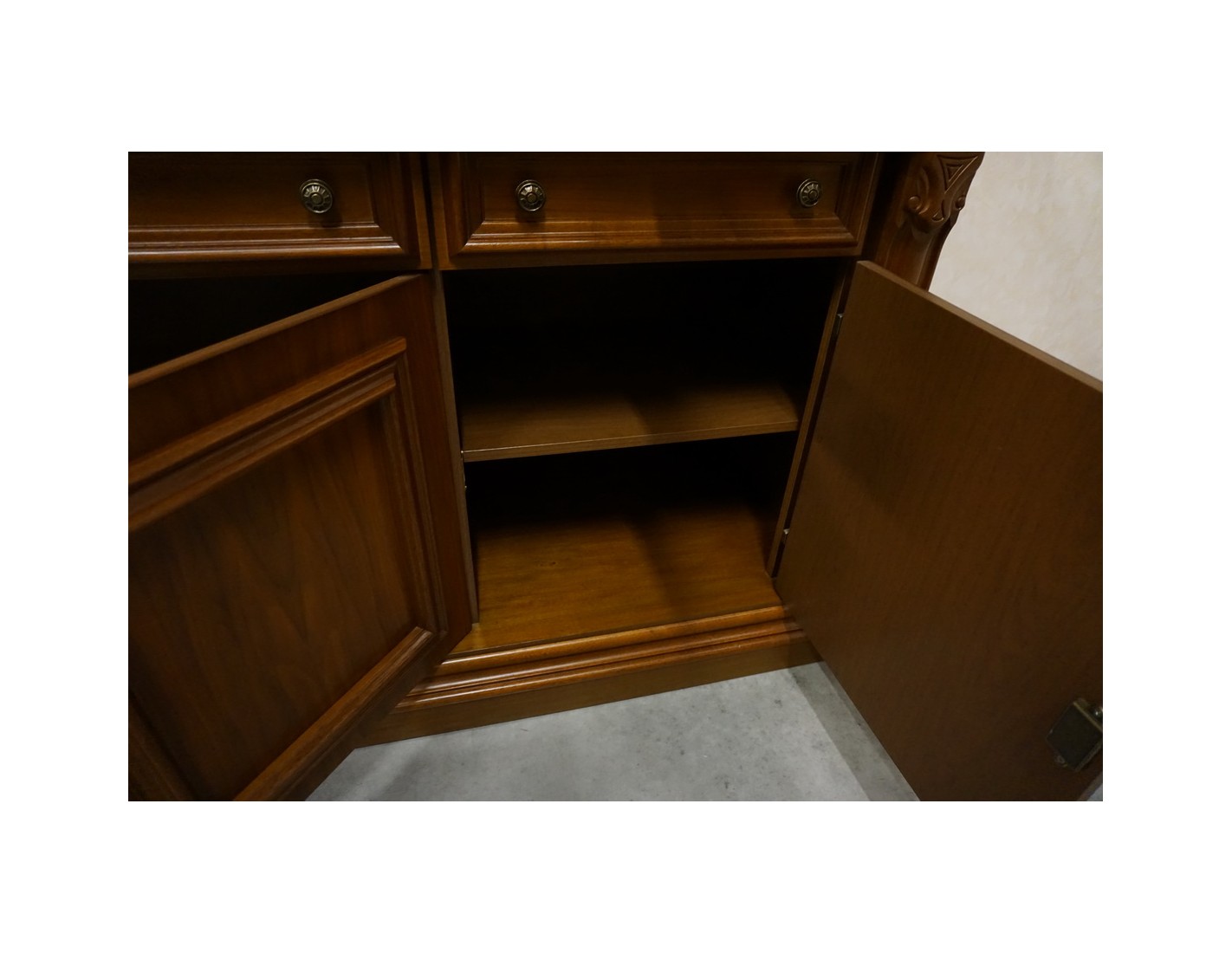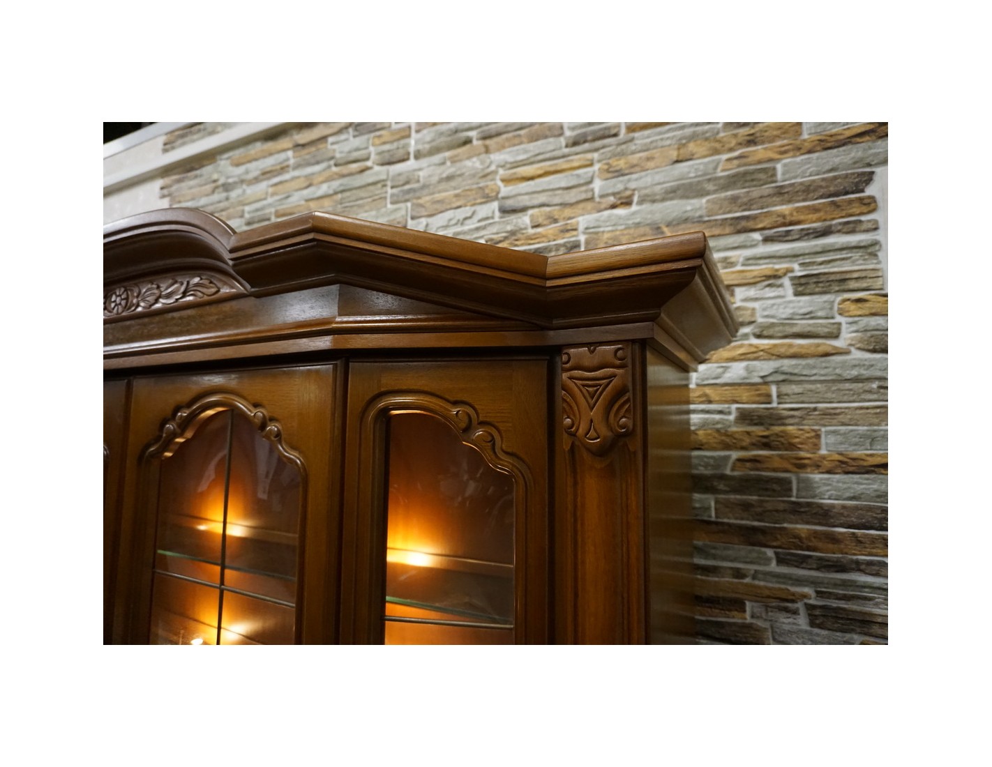 Elegancka witryna z komodą w orzechowym wykończeniu, wyposażona w pięć drzwiczek i trzy funkcjonalne szuflady. Podświetlenie podkreśla jej wyjątkowy design, idealna do przestronnych salonów i jadalni.