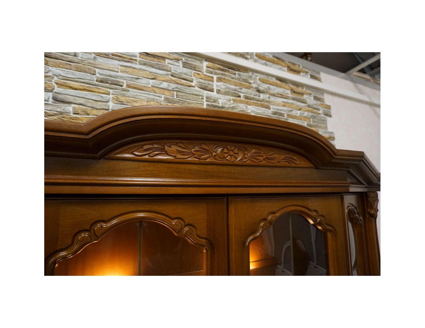 Witryna z komodą w orzechowym kolorze wpasuje się w eleganckie aranżacje, zapewniając dużo miejsca do przechowywania i eksponowania dekoracji.