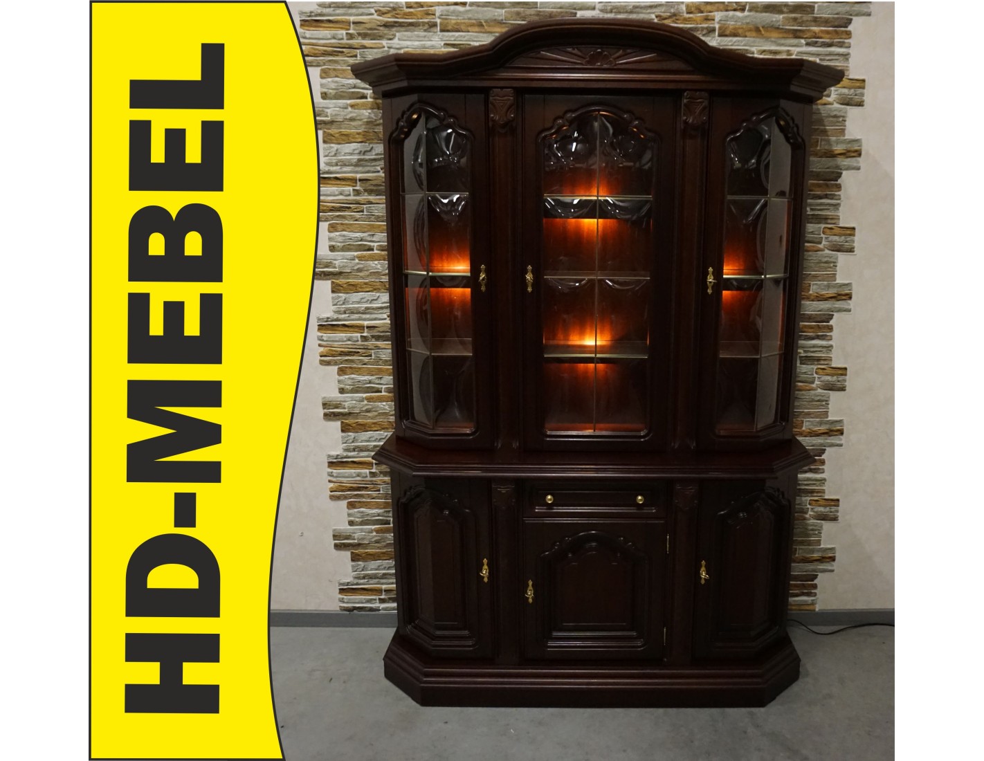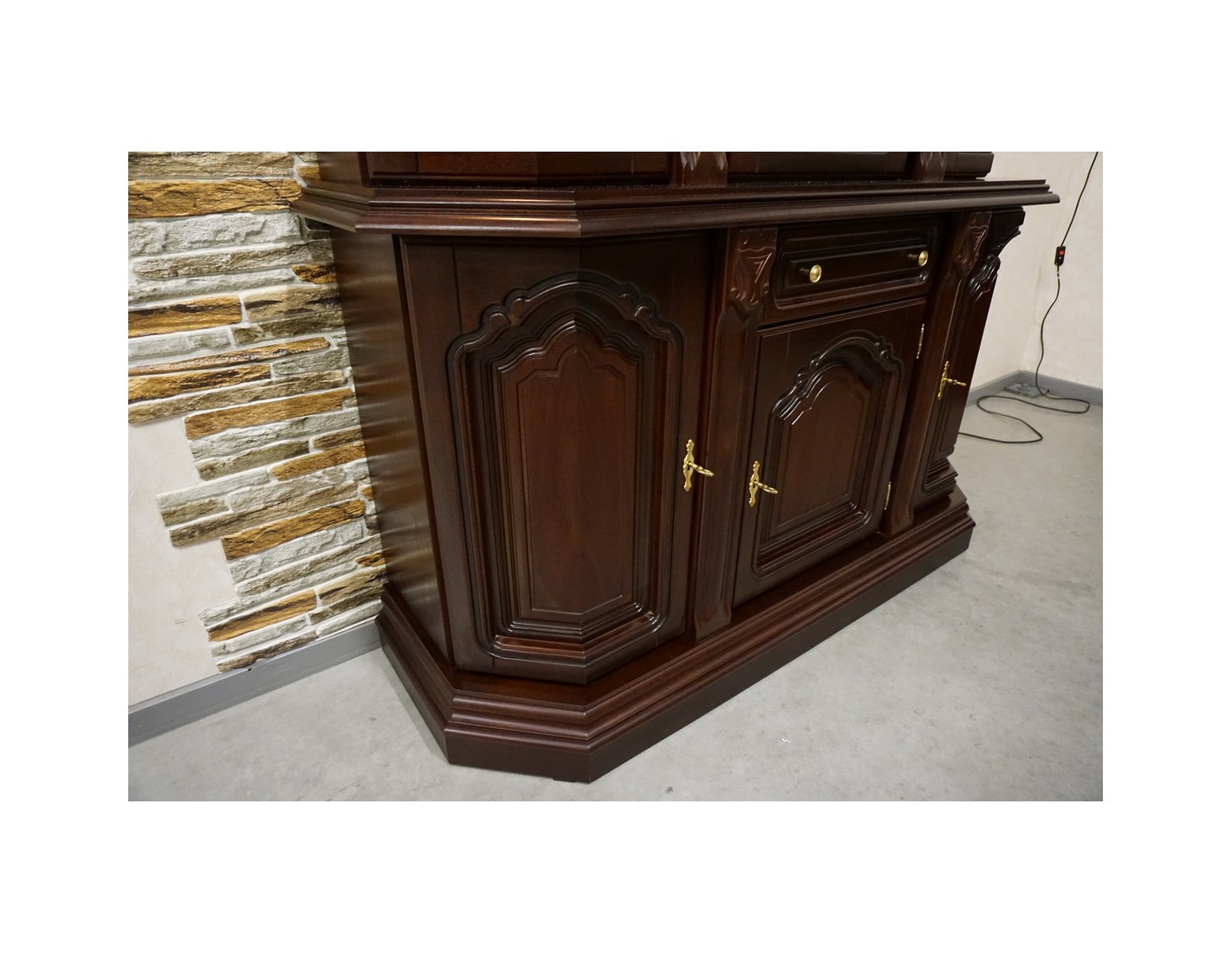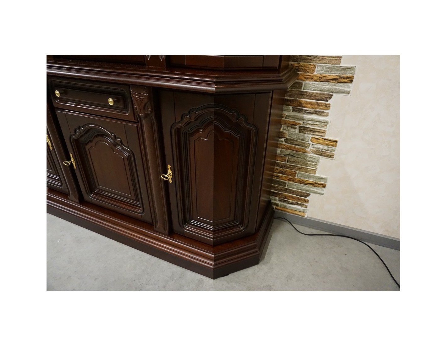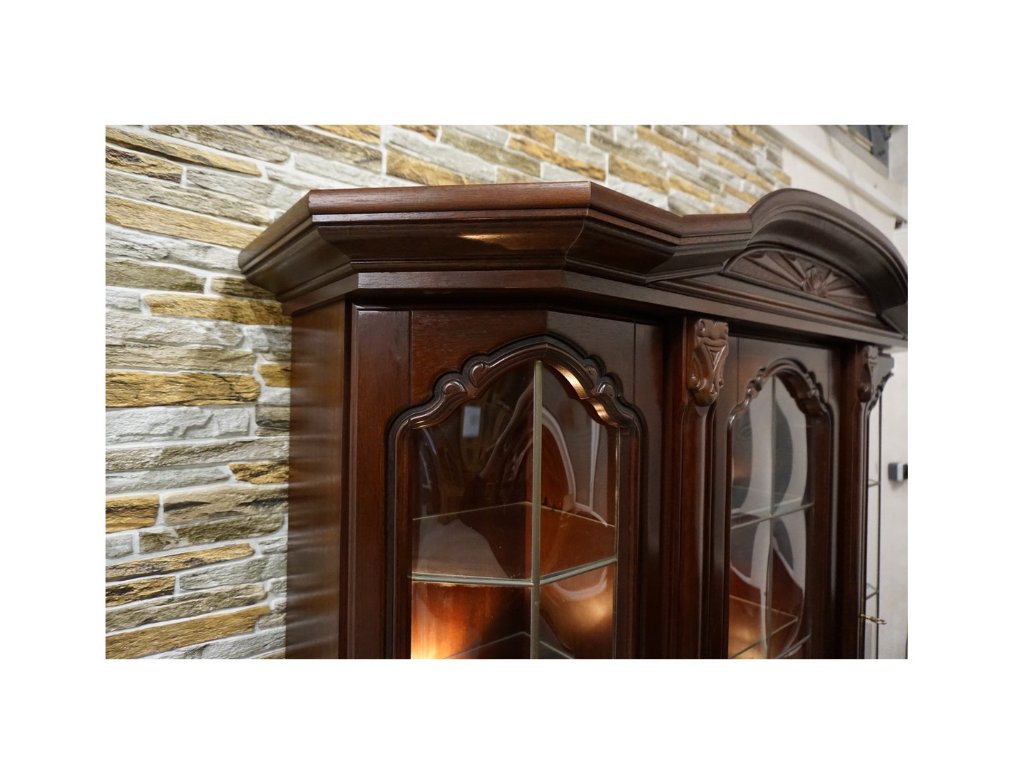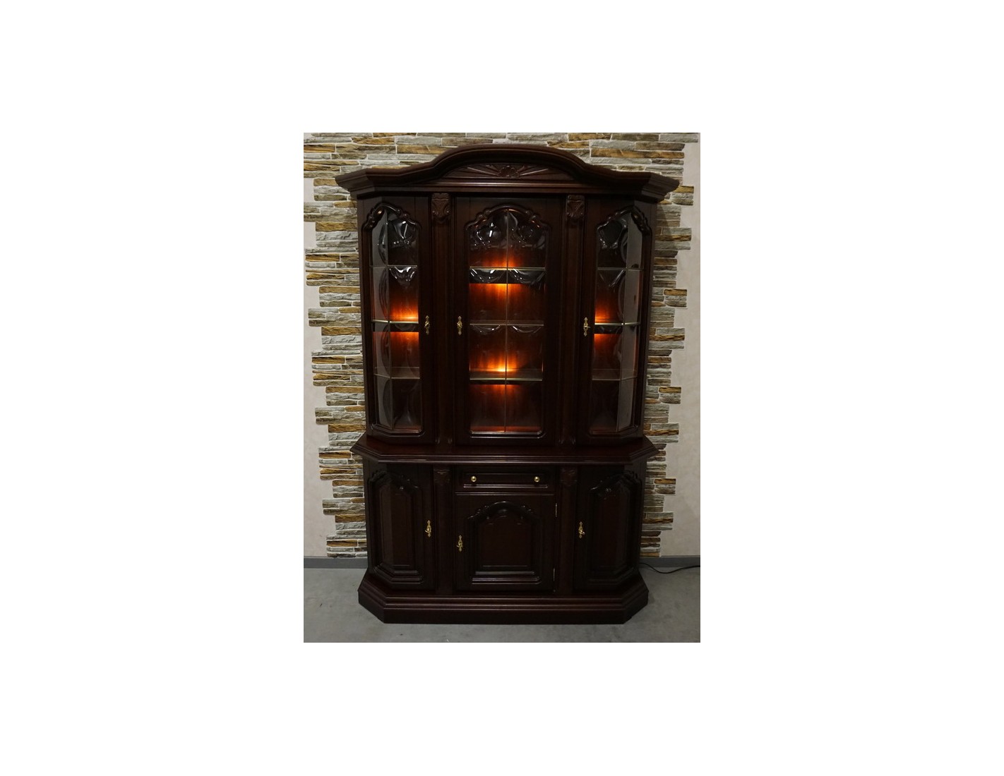 Elegancka witryna w kolorze mahoniu z funkcją podświetlenia. Połączenie estetyki i funkcjonalności sprawia, że doskonale wpasuje się w każde wnętrze, nadając mu wyjątkowy charakter.