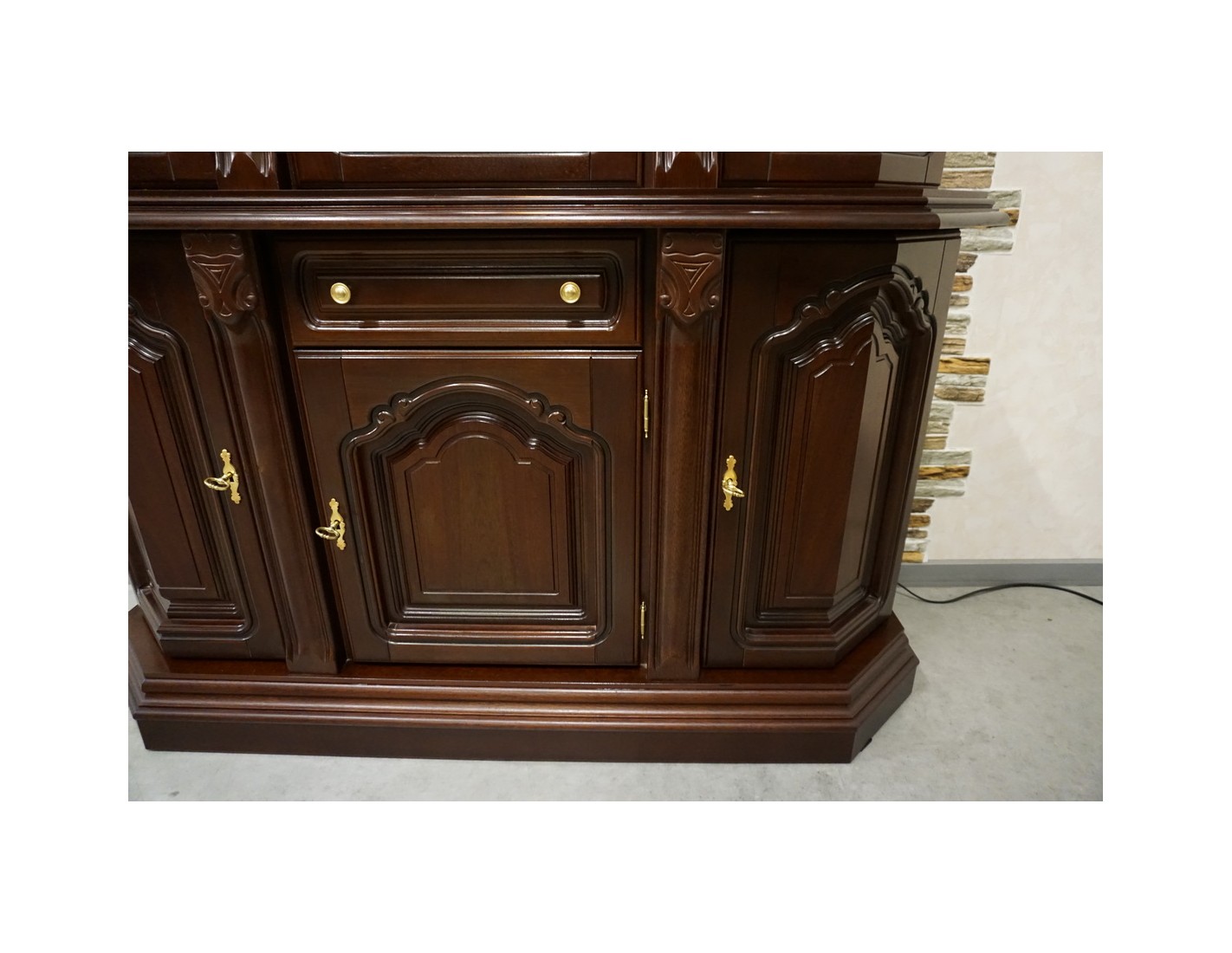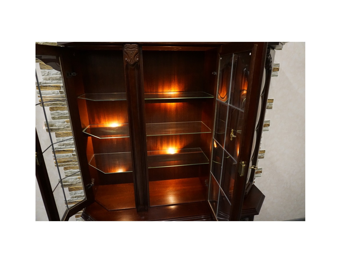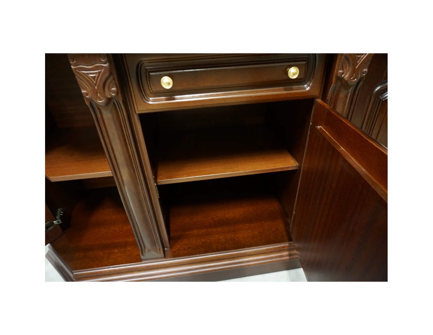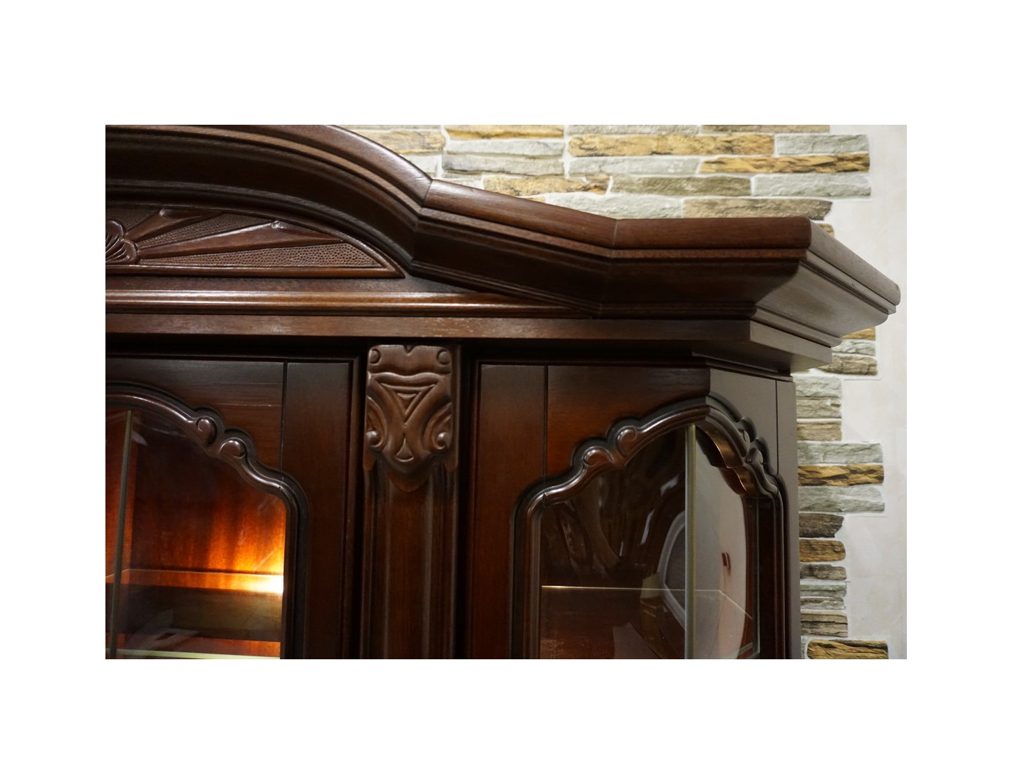 Elegancka witryna w kolorze mahoniu z funkcją podświetlenia. Połączenie estetyki i funkcjonalności sprawia, że doskonale wpasuje się w każde wnętrze, nadając mu wyjątkowy charakter.