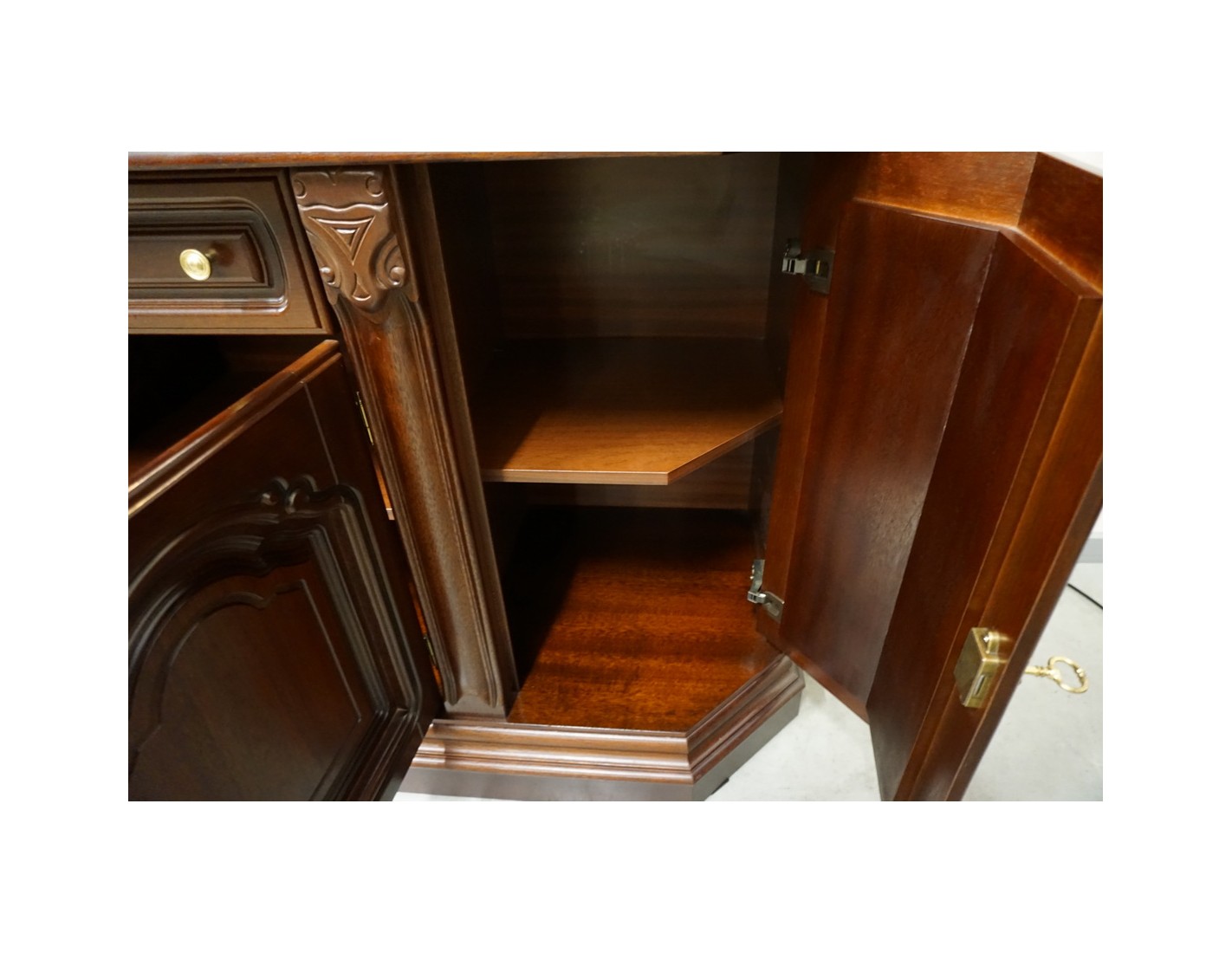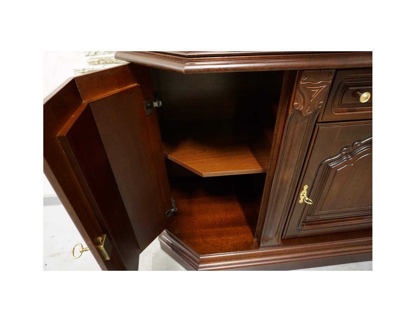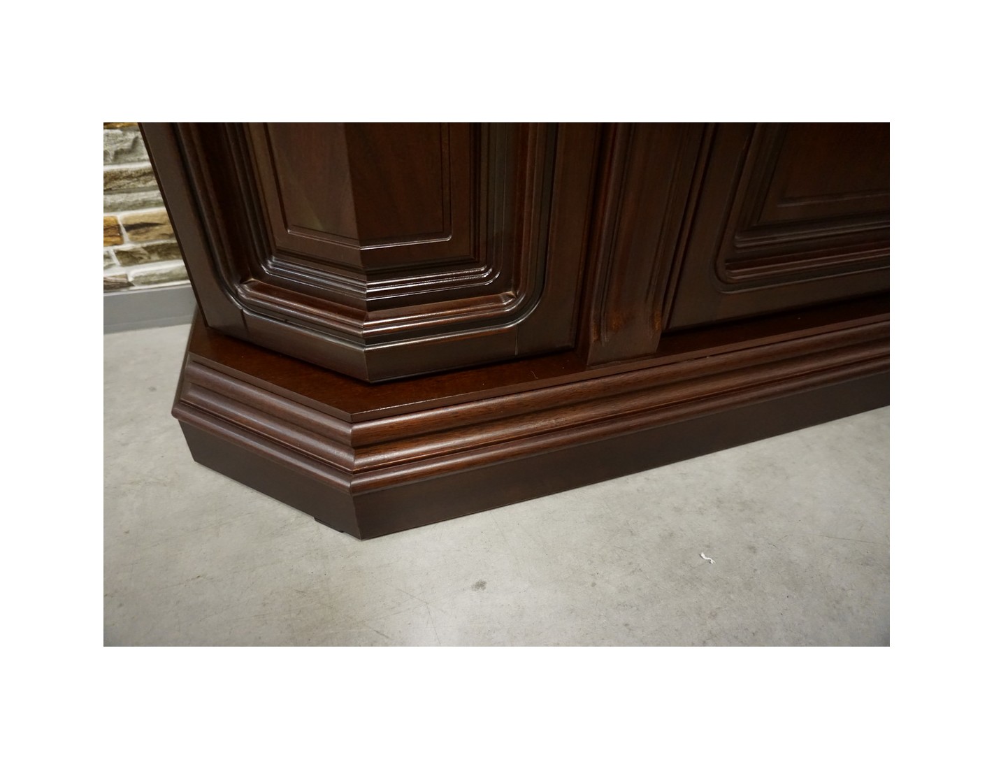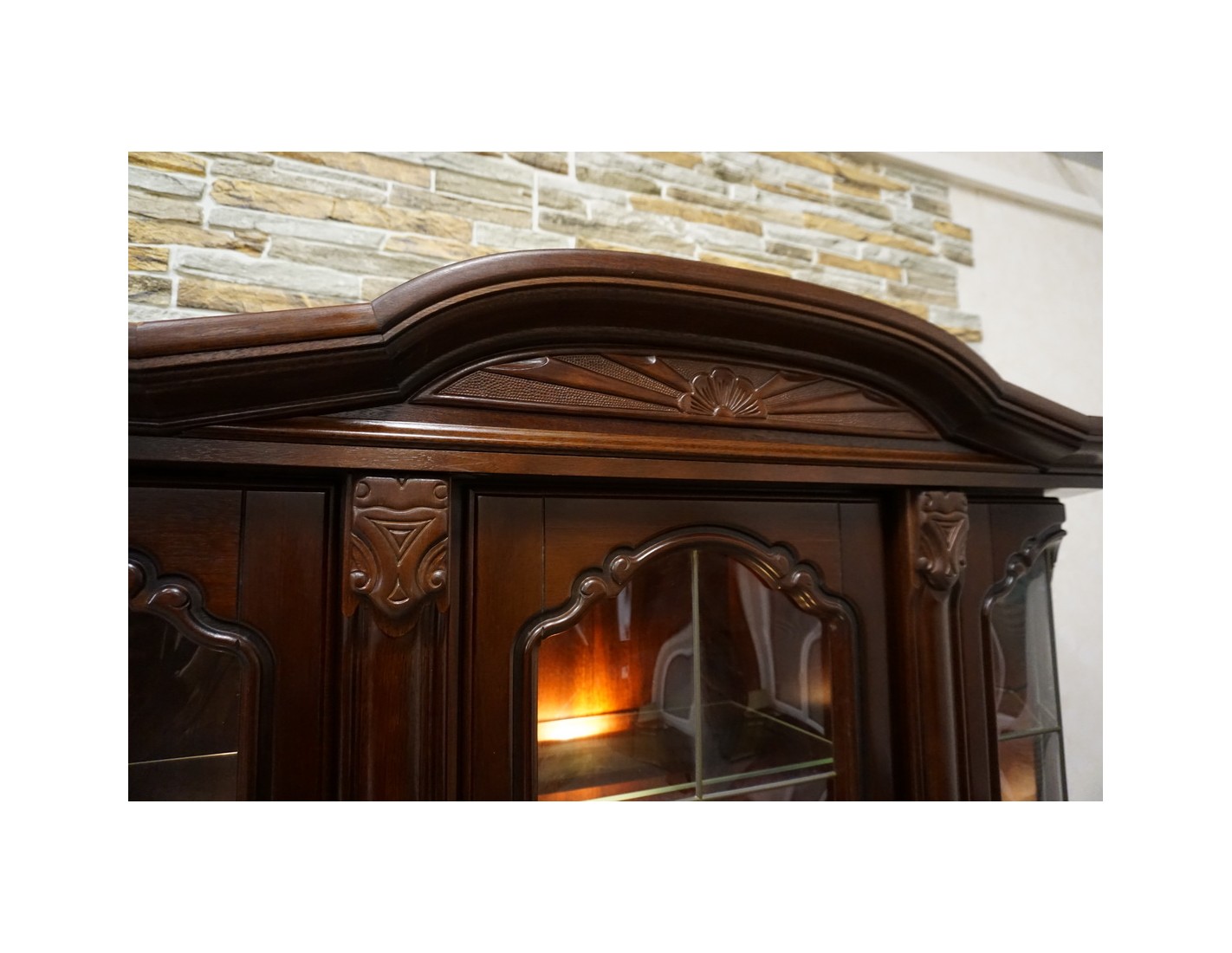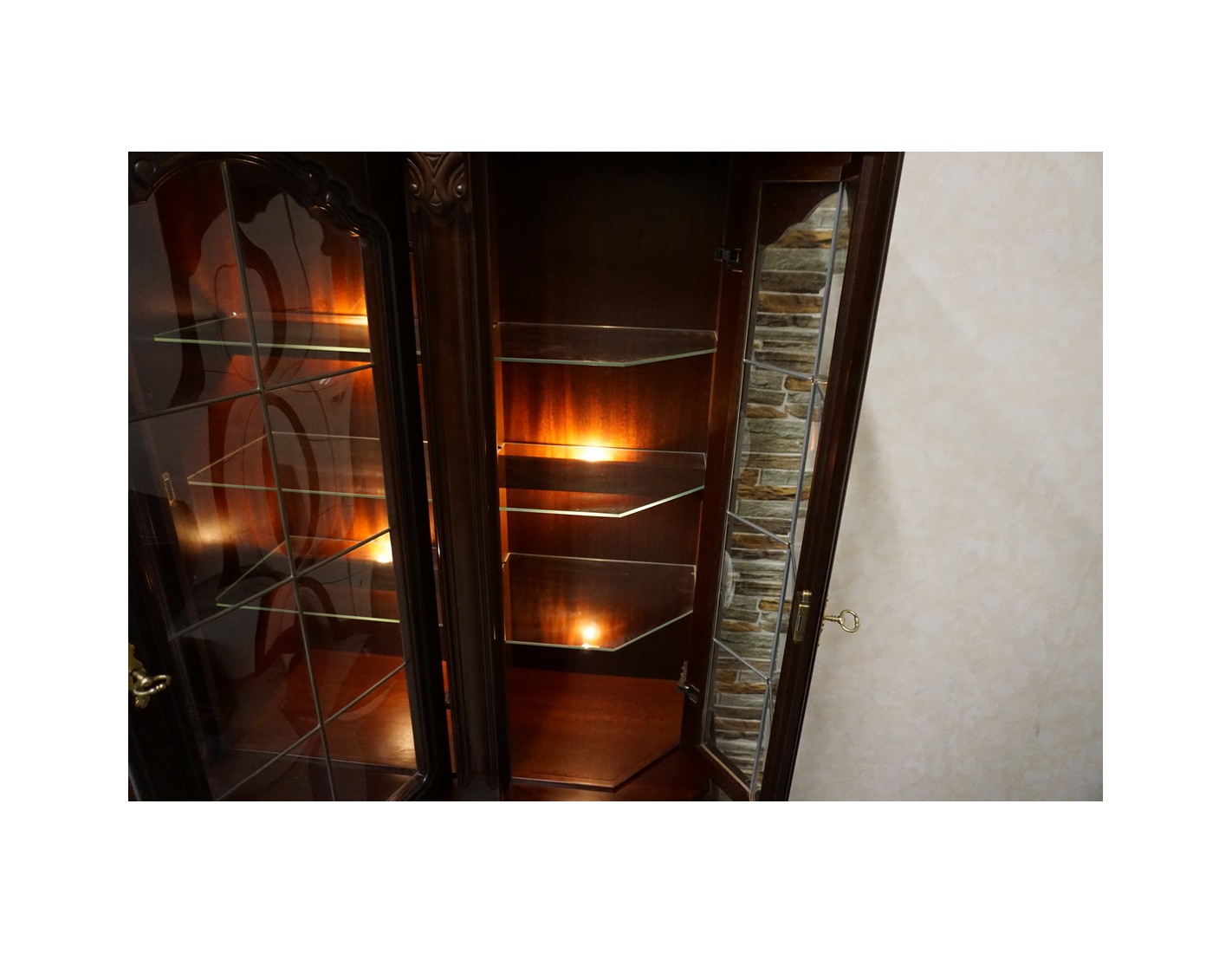 Elegancka witryna w kolorze mahoniu z funkcją podświetlenia. Połączenie estetyki i funkcjonalności sprawia, że doskonale wpasuje się w każde wnętrze, nadając mu wyjątkowy charakter.