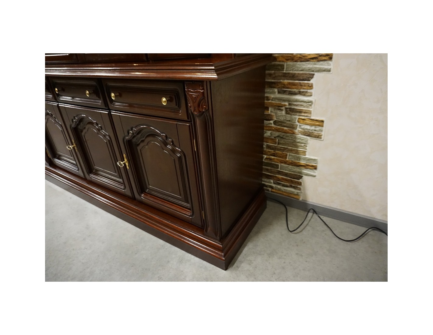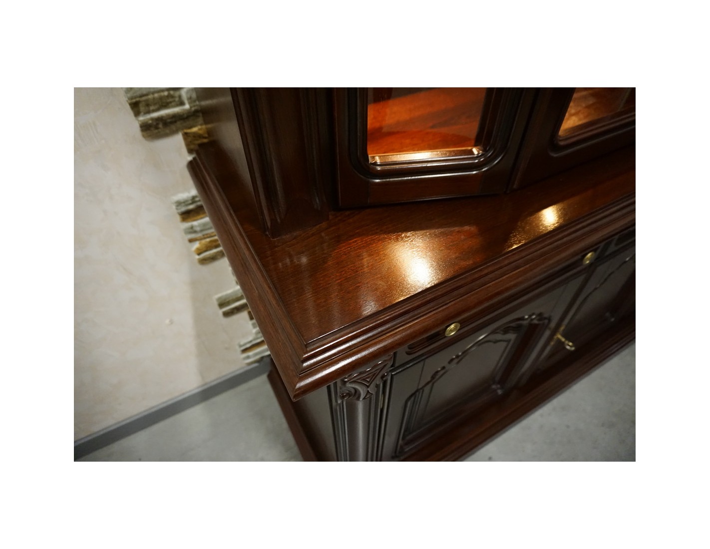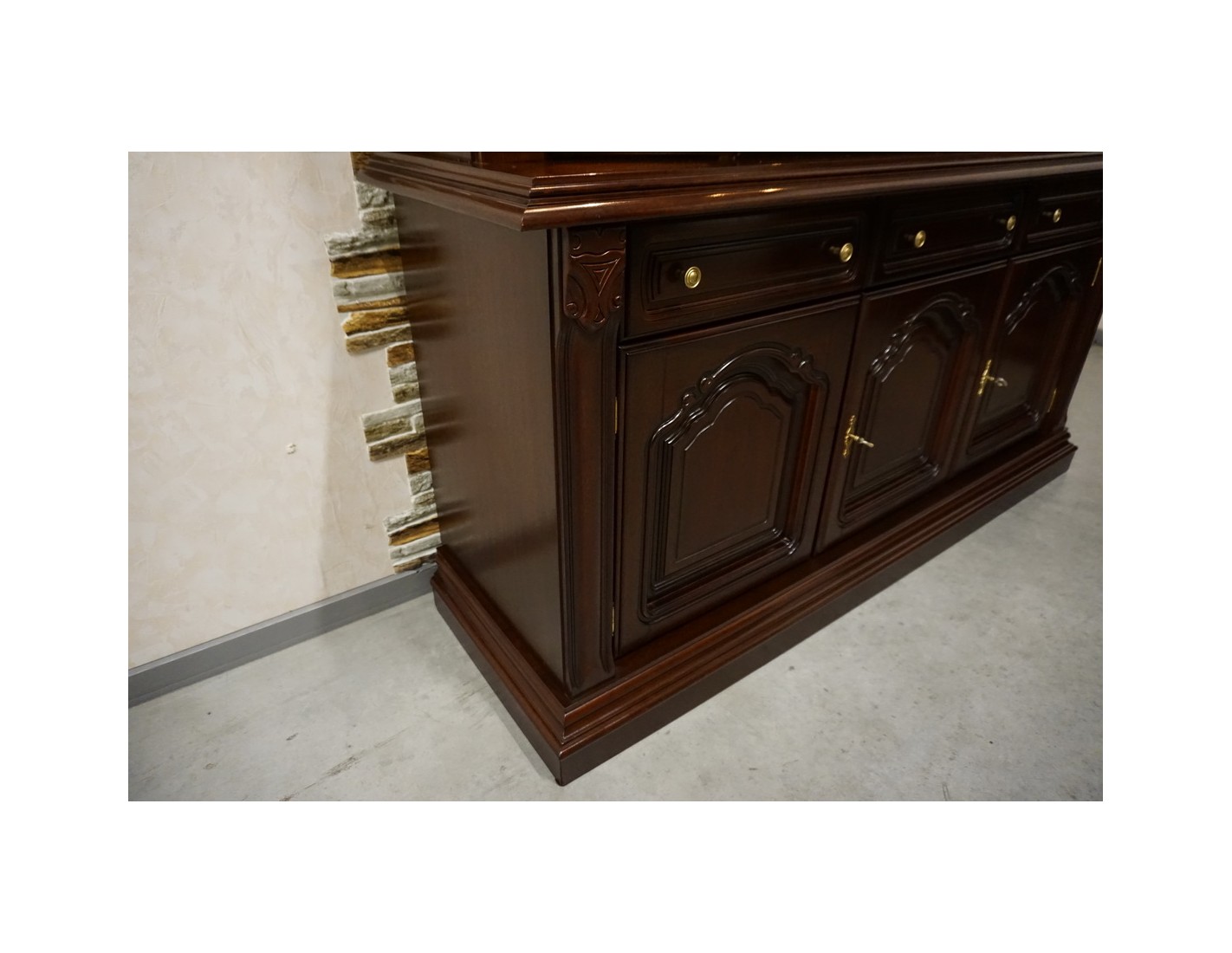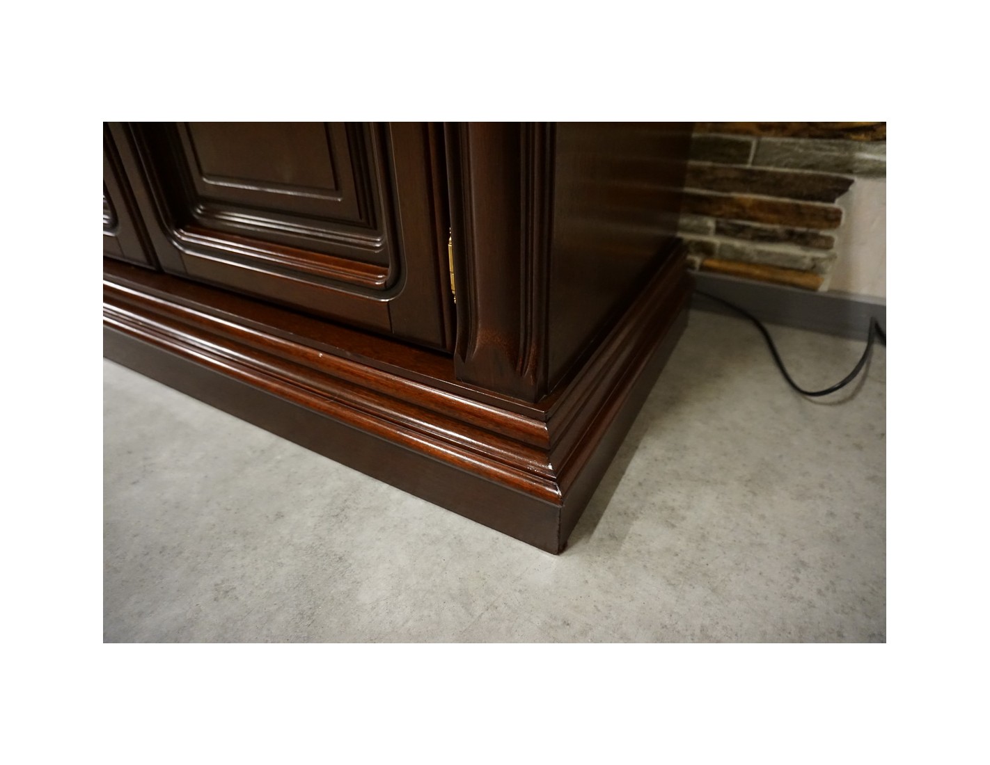 Elegancka witryna z komodą wykonana z wysokiej jakości drewna mahoniowego. Dzięki podświetleniu wnętrza mebel nie tylko pięknie eksponuje przechowywane przedmioty, ale również tworzy nastrojowe oświetlenie w pomieszczeniu. Posiada pięć drzwi oraz trzy praktyczne szuflady, które zapewniają dużą przestrzeń do przechowywania.