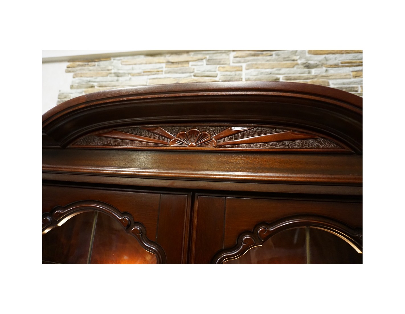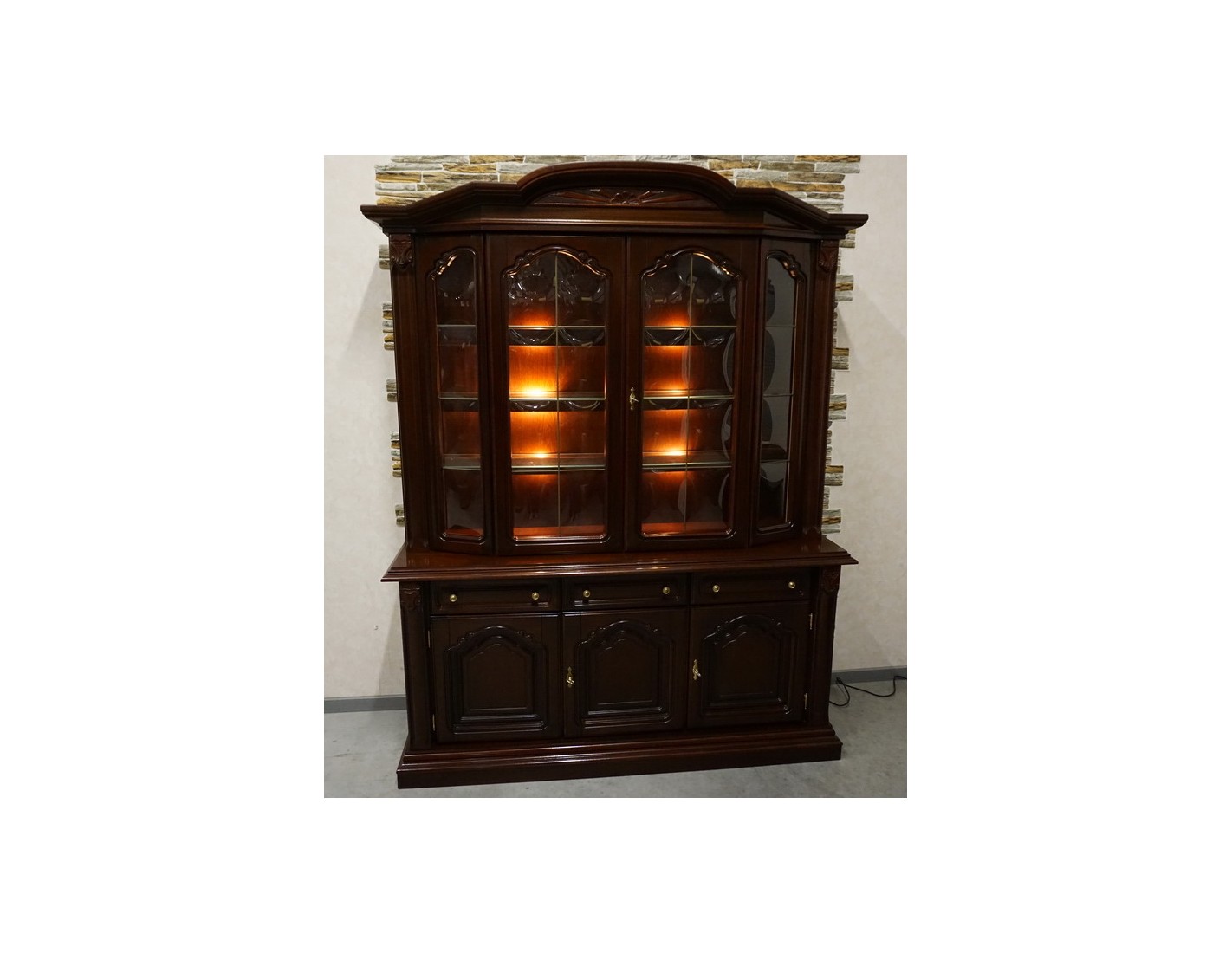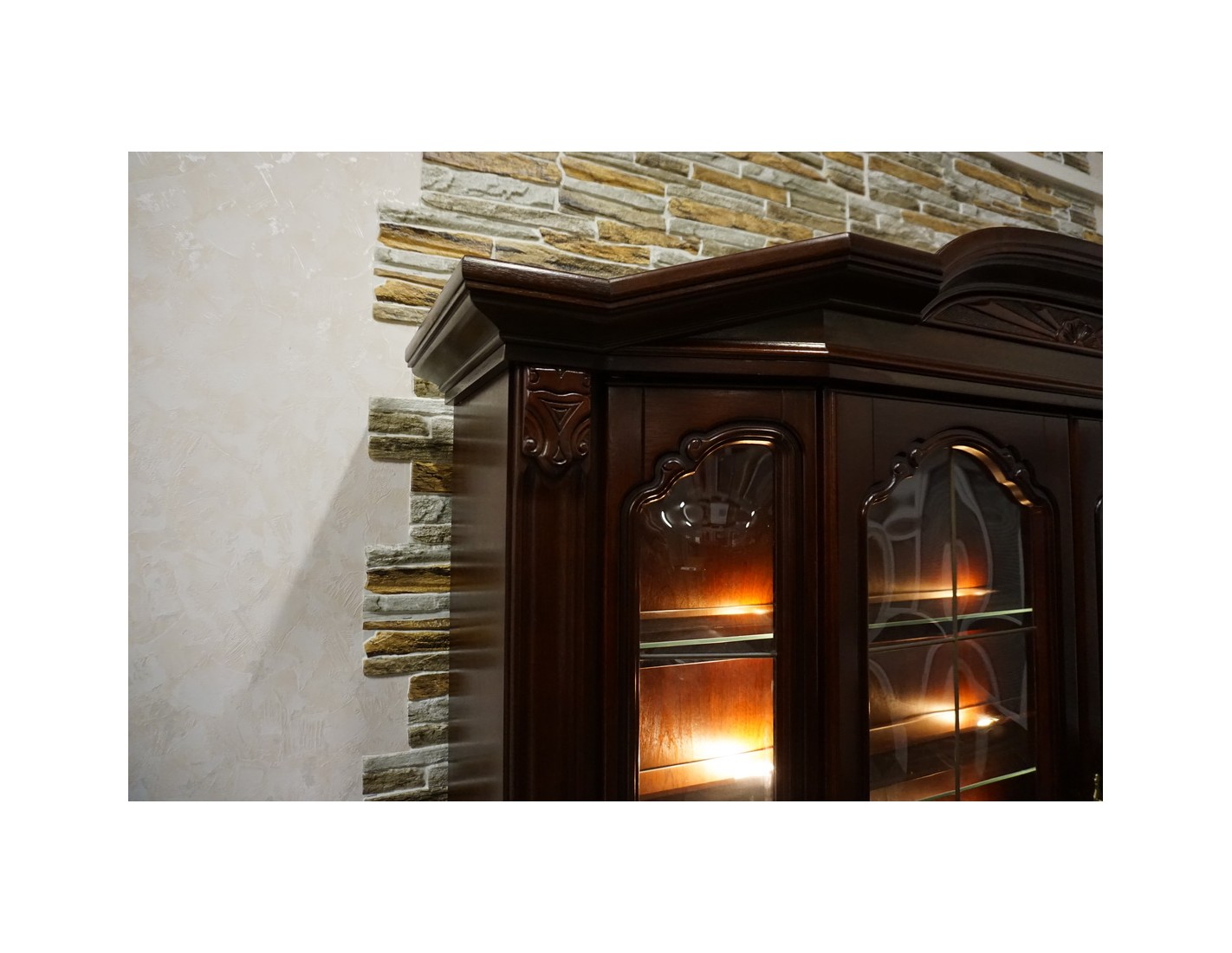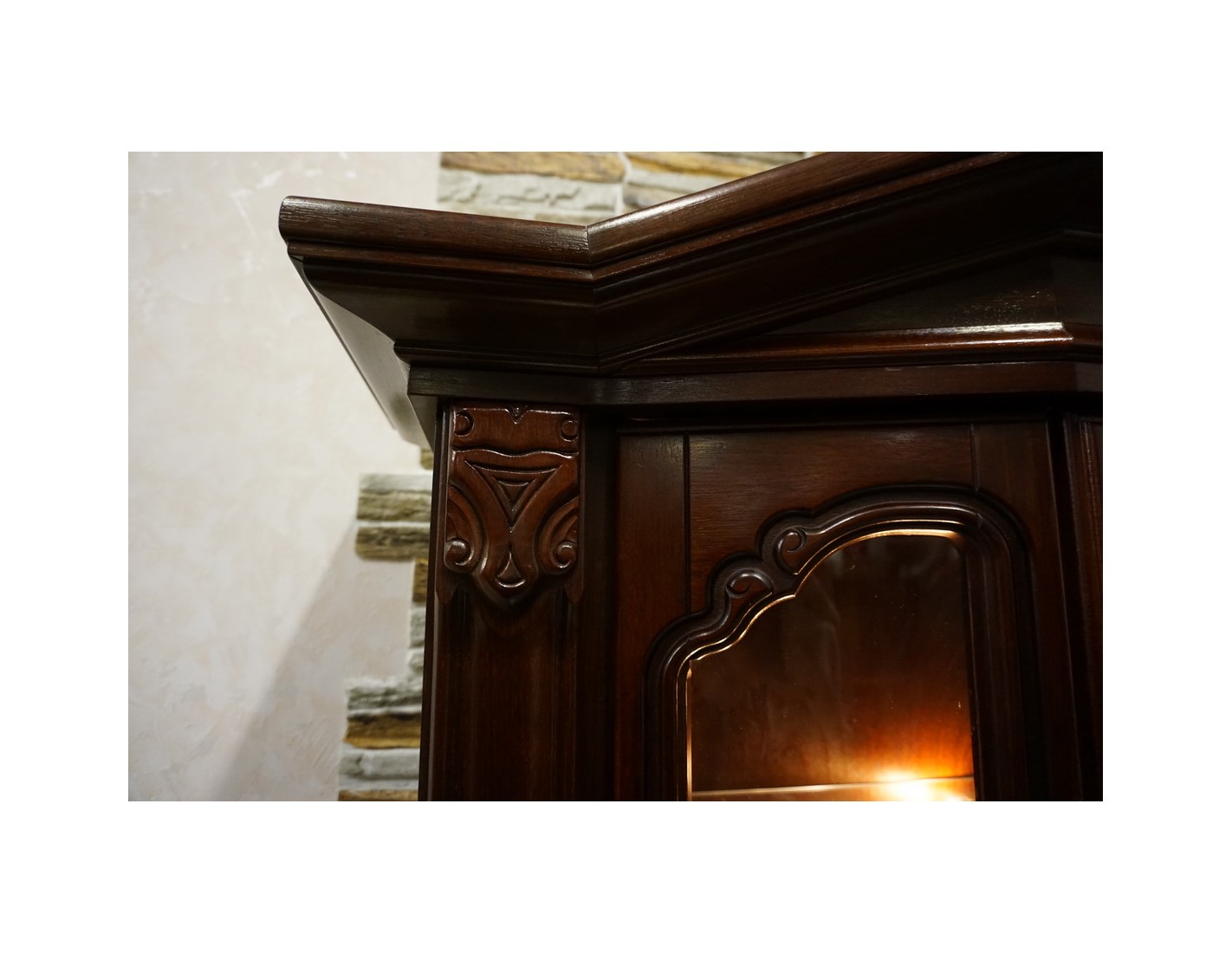 Elegancka witryna z komodą wykonana z wysokiej jakości drewna mahoniowego. Dzięki podświetleniu wnętrza mebel nie tylko pięknie eksponuje przechowywane przedmioty, ale również tworzy nastrojowe oświetlenie w pomieszczeniu. Posiada pięć drzwi oraz trzy praktyczne szuflady, które zapewniają dużą przestrzeń do przechowywania.