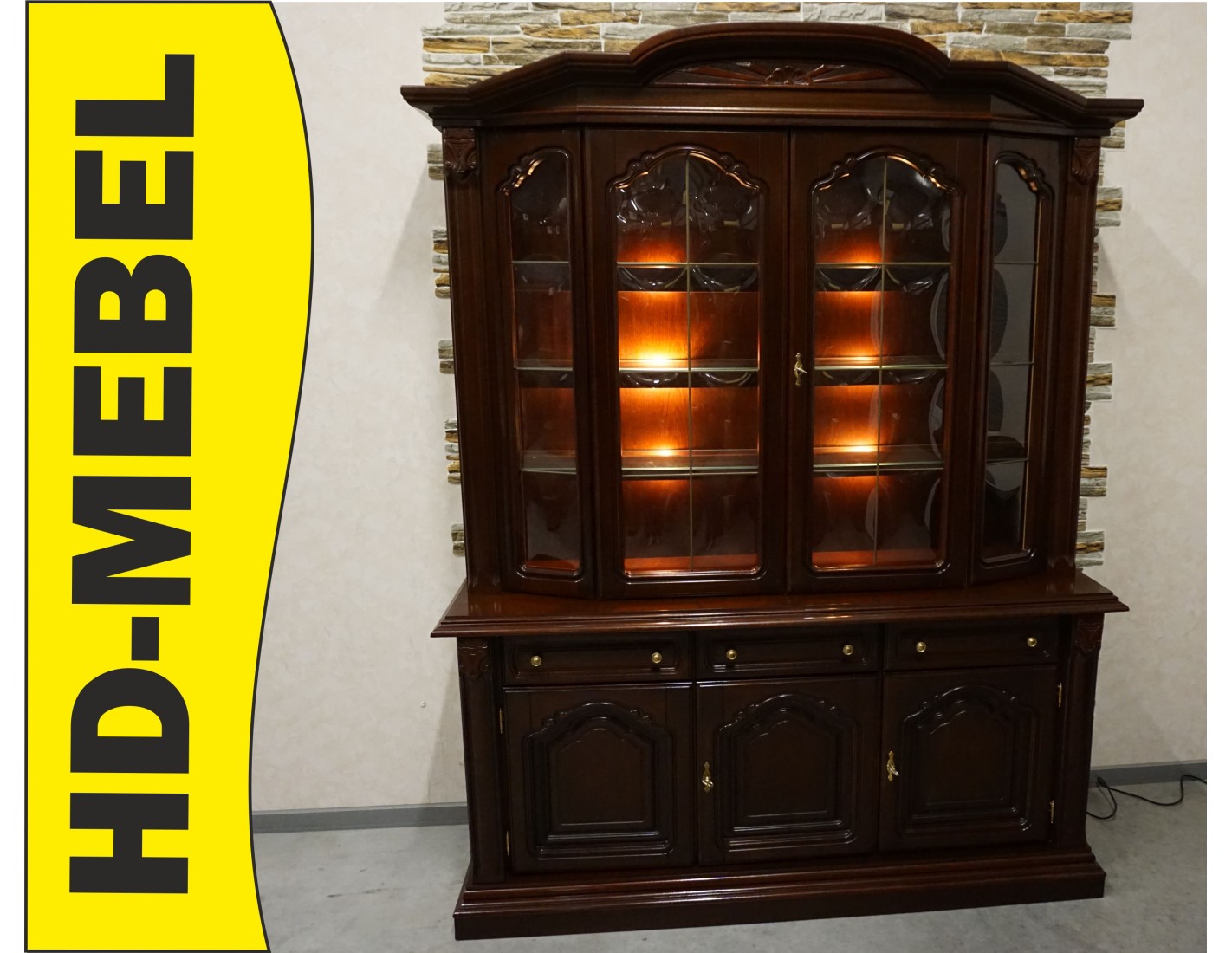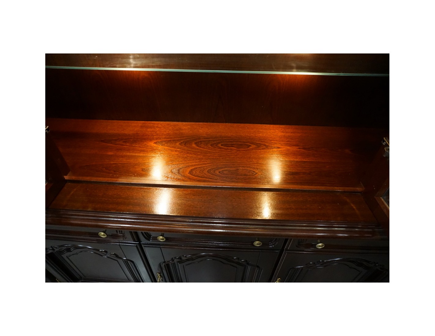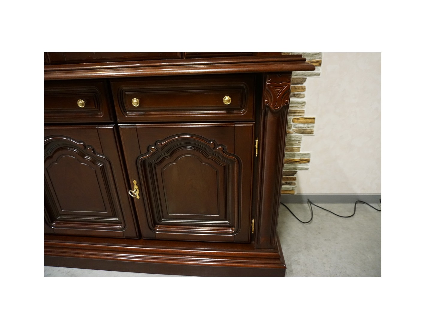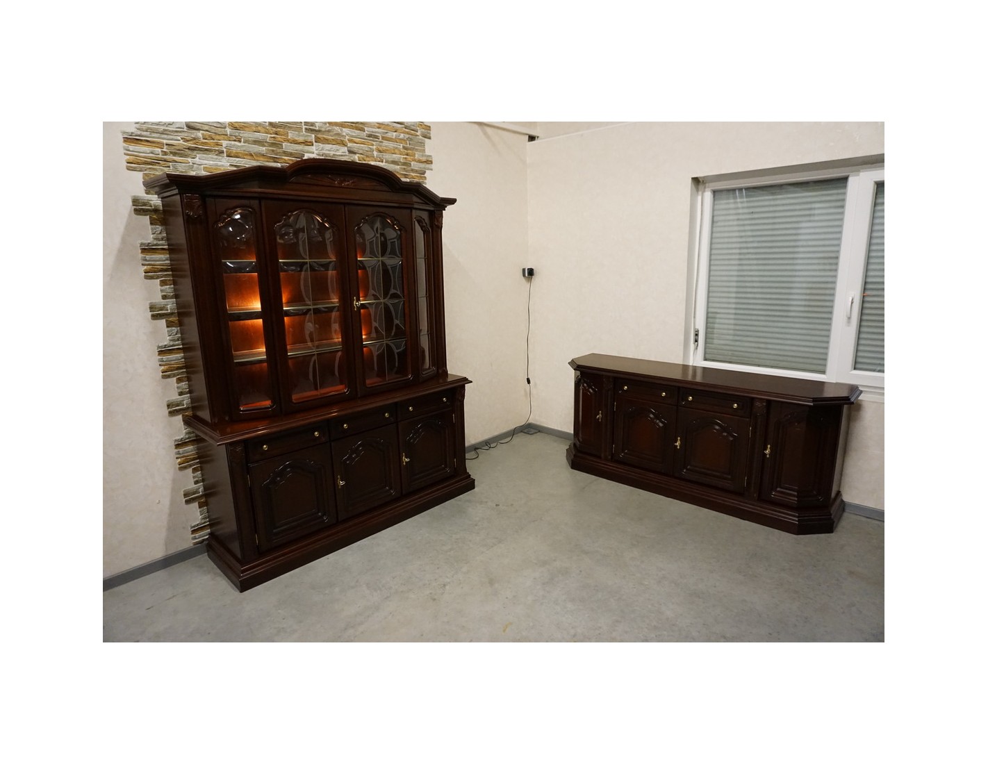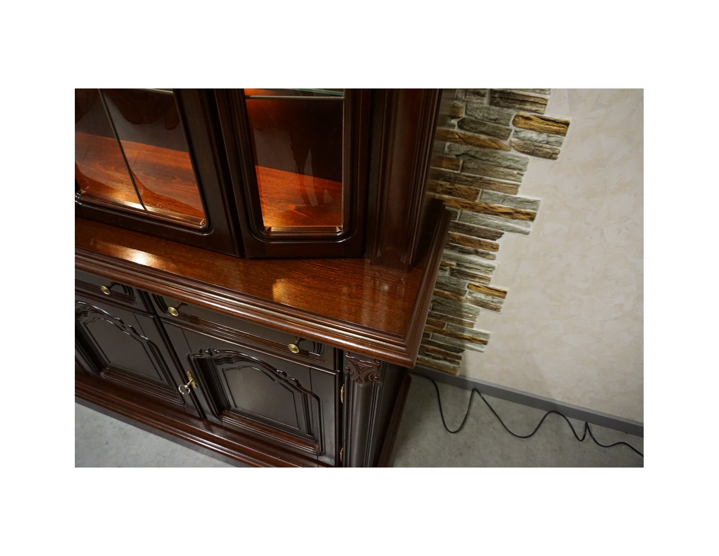 Elegancka witryna z komodą wykonana z wysokiej jakości drewna mahoniowego. Dzięki podświetleniu wnętrza mebel nie tylko pięknie eksponuje przechowywane przedmioty, ale również tworzy nastrojowe oświetlenie w pomieszczeniu. Posiada pięć drzwi oraz trzy praktyczne szuflady, które zapewniają dużą przestrzeń do przechowywania.