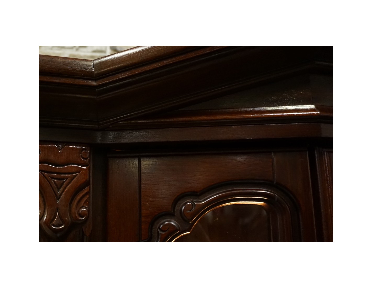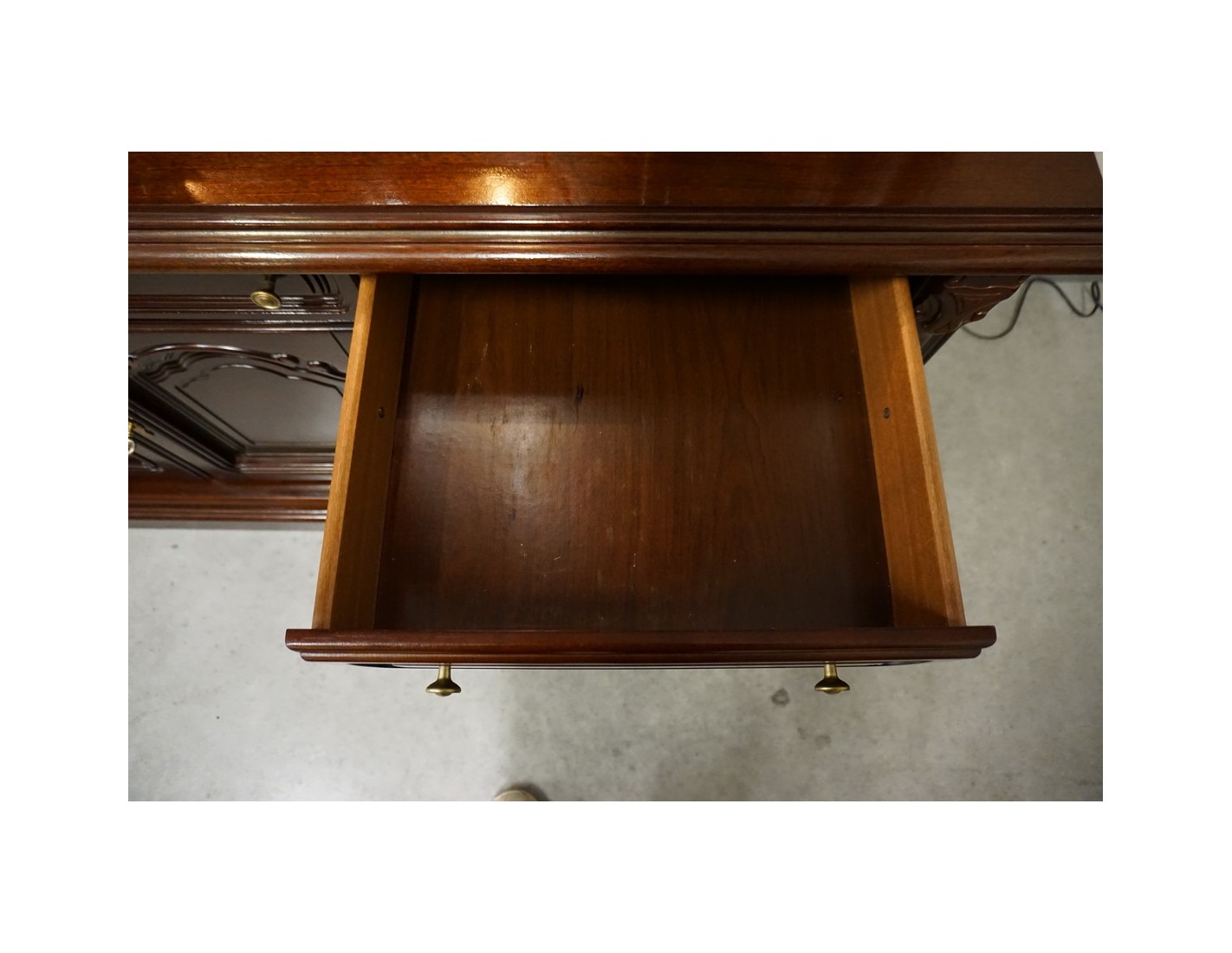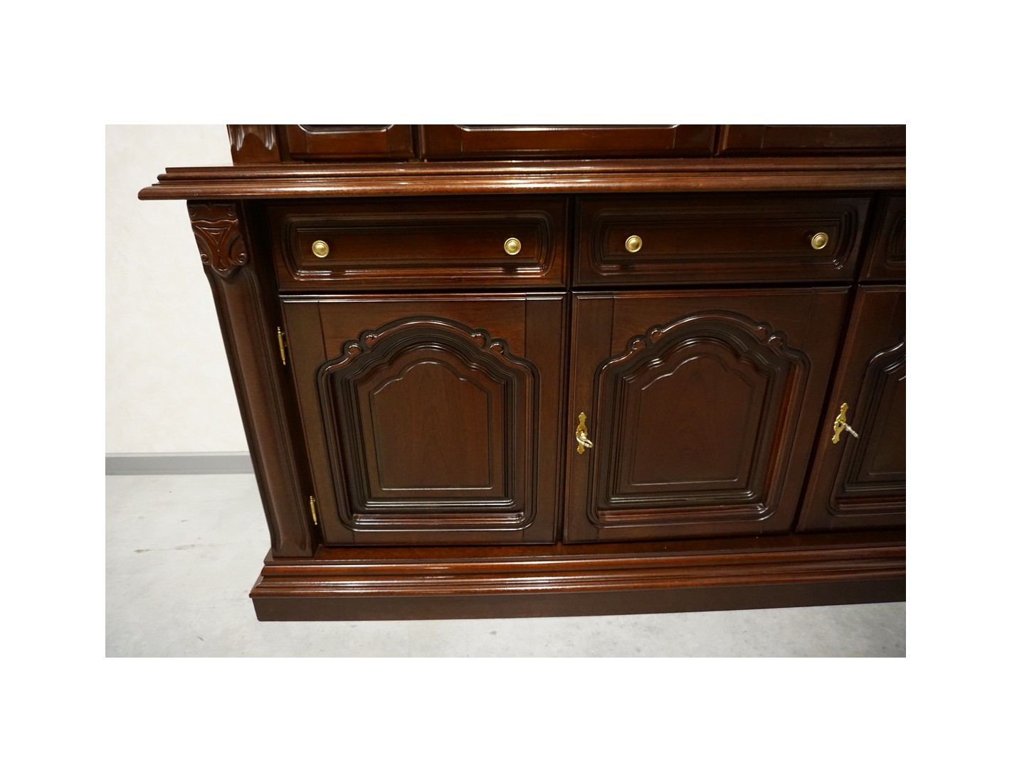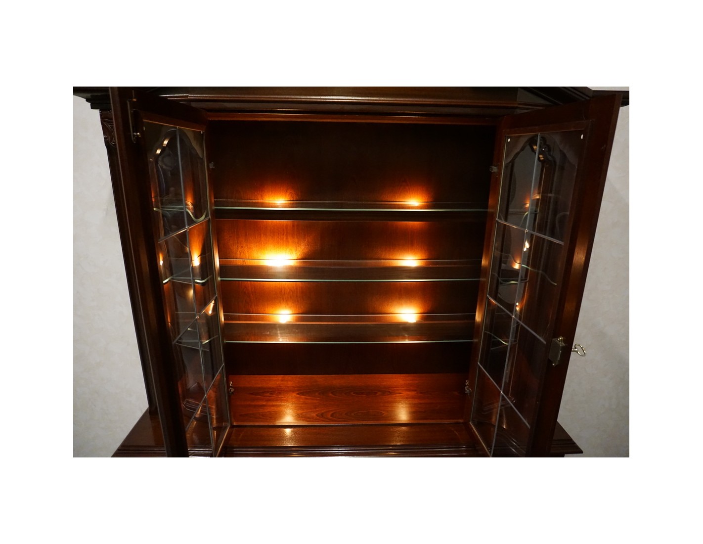 Elegancka witryna z komodą wykonana z wysokiej jakości drewna mahoniowego. Dzięki podświetleniu wnętrza mebel nie tylko pięknie eksponuje przechowywane przedmioty, ale również tworzy nastrojowe oświetlenie w pomieszczeniu. Posiada pięć drzwi oraz trzy praktyczne szuflady, które zapewniają dużą przestrzeń do przechowywania.